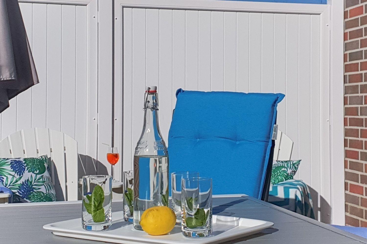 Die Terrasse am Haus sowie der Garten mit Rasenfläche bieten Ihnen vielfältige Gelegenheiten, Sonne und Nordseeluft zu genießen, sei es beim Ausruhen auf einem der beiden Adirondack-Chairs oder der Lektüre eines Buches im Strandkorb.