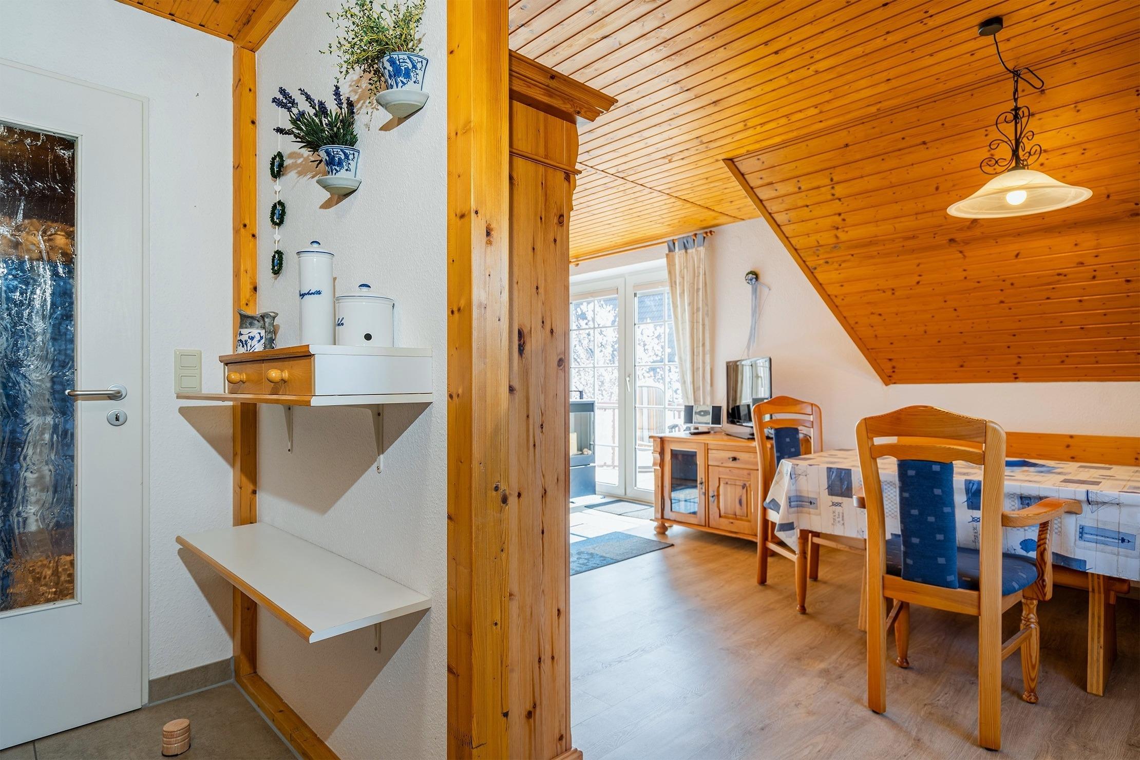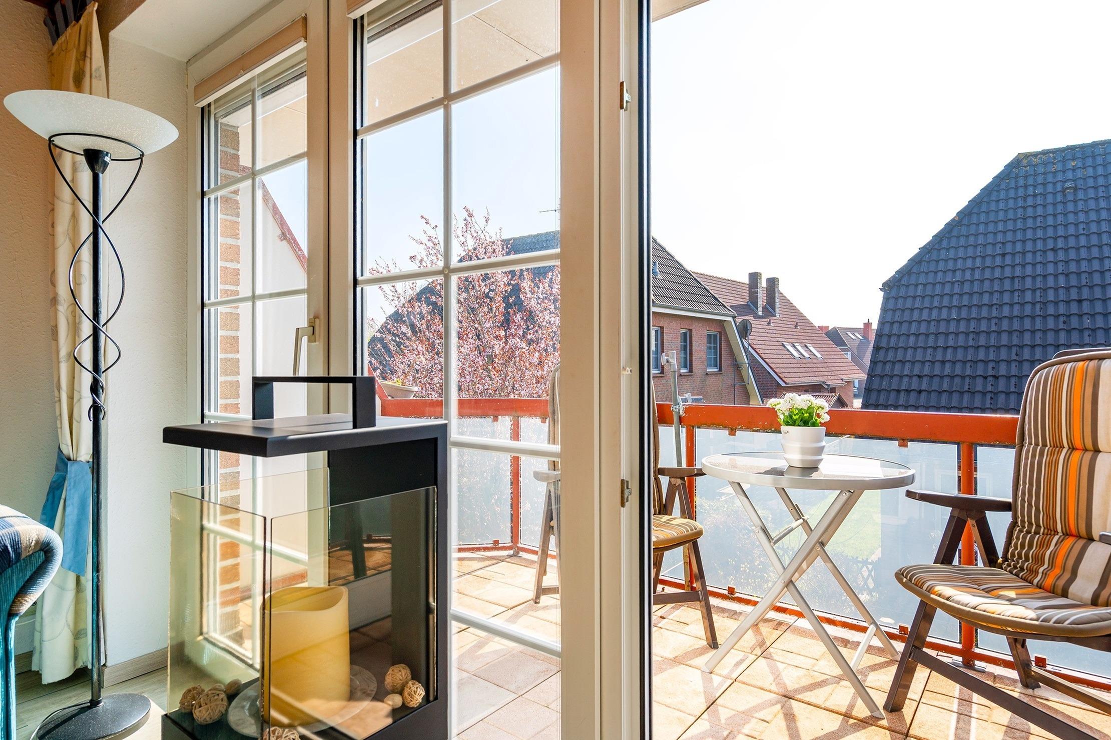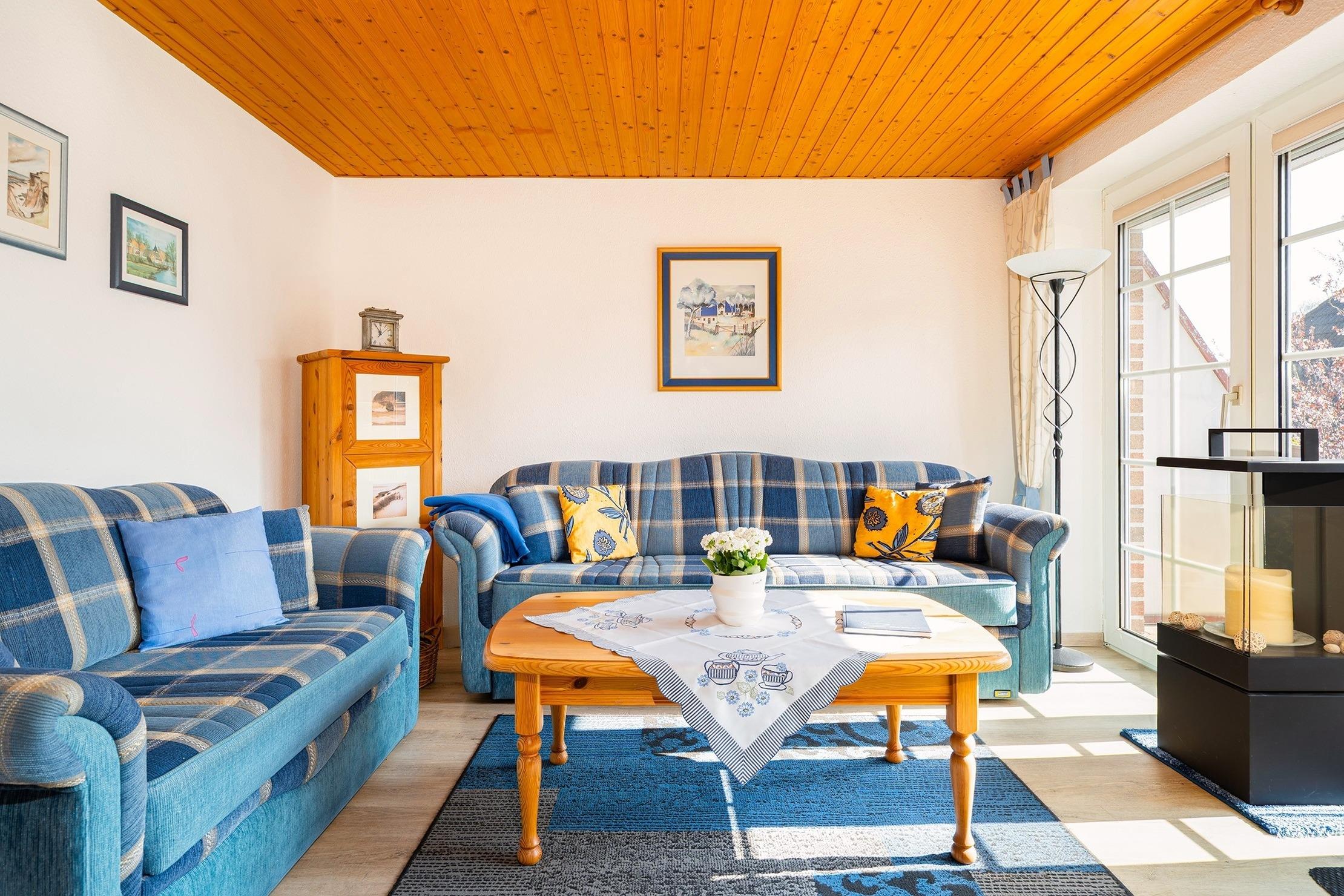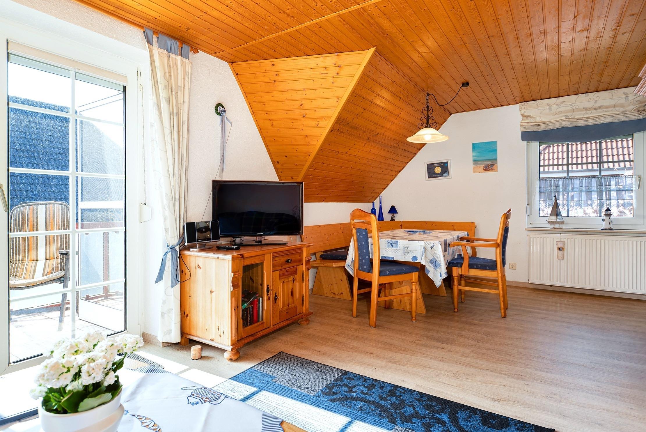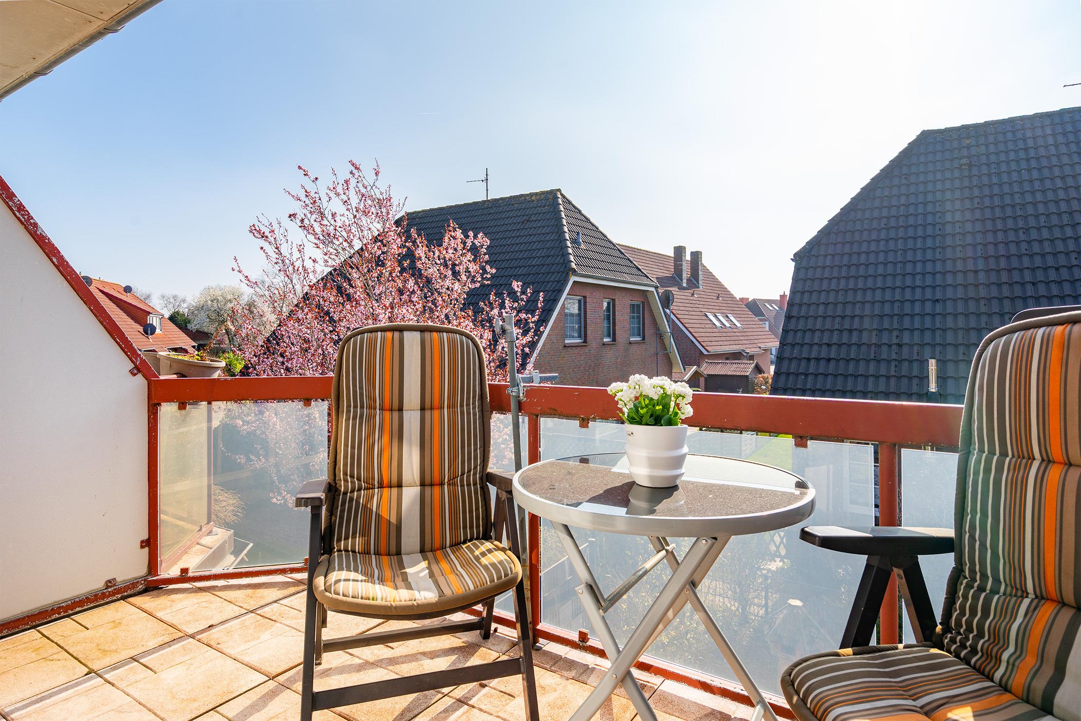Die Ferienwohnung "Friesentraum" befindet sich in einem traditionellen Ferienhausgebiet im Obergeschoss eines Hauses mit vier Wohneinheiten. Sie vereint auf charmante Weise ostfriesische Tradition mit modernem Wohnkomfort. Beim Betreten der Wohnung fällt sofort die liebevolle, traditionelle Einrichtung ins Auge: rustikale Holzmöbel, gemütliche Stoffe und typisch friesische Dekorationen schaffen eine warme, heimelige Atmosphäre. Der Wohnbereich und die Küche strahlen den gemütlichen Charakter eines klassischen Landhauses aus – ideal, um zur Ruhe zu kommen. Gleichzeitig überzeugt die Wohnung mit modernen Akzenten: Das renovierte Tageslichtbad mit der ebenerdigen Dusche ist zeitgemäß ausgestattet. Auch eines der beiden Schlafzimmer wurde modernisiert und strahlt mit klaren Linien, hochwertigen Materialien und angenehmer Farbgestaltung eine frische, zeitlose Ruhe aus. Das zweite, traditionell gestaltete Schlafzimmer erreichen Sie durch eine Treppe und ist offen als Galerie gestaltet. Es bietet neben einem Schlafbereich auch einen Sessel. Die Wohnung bietet weiterhin einen Balkon, auf dem sich die frische Luft genießen lässt. Neben einem Fahrradabstellraum gibt es außerdem einen reservierten PKW-Stellplatz vor dem Haus.
