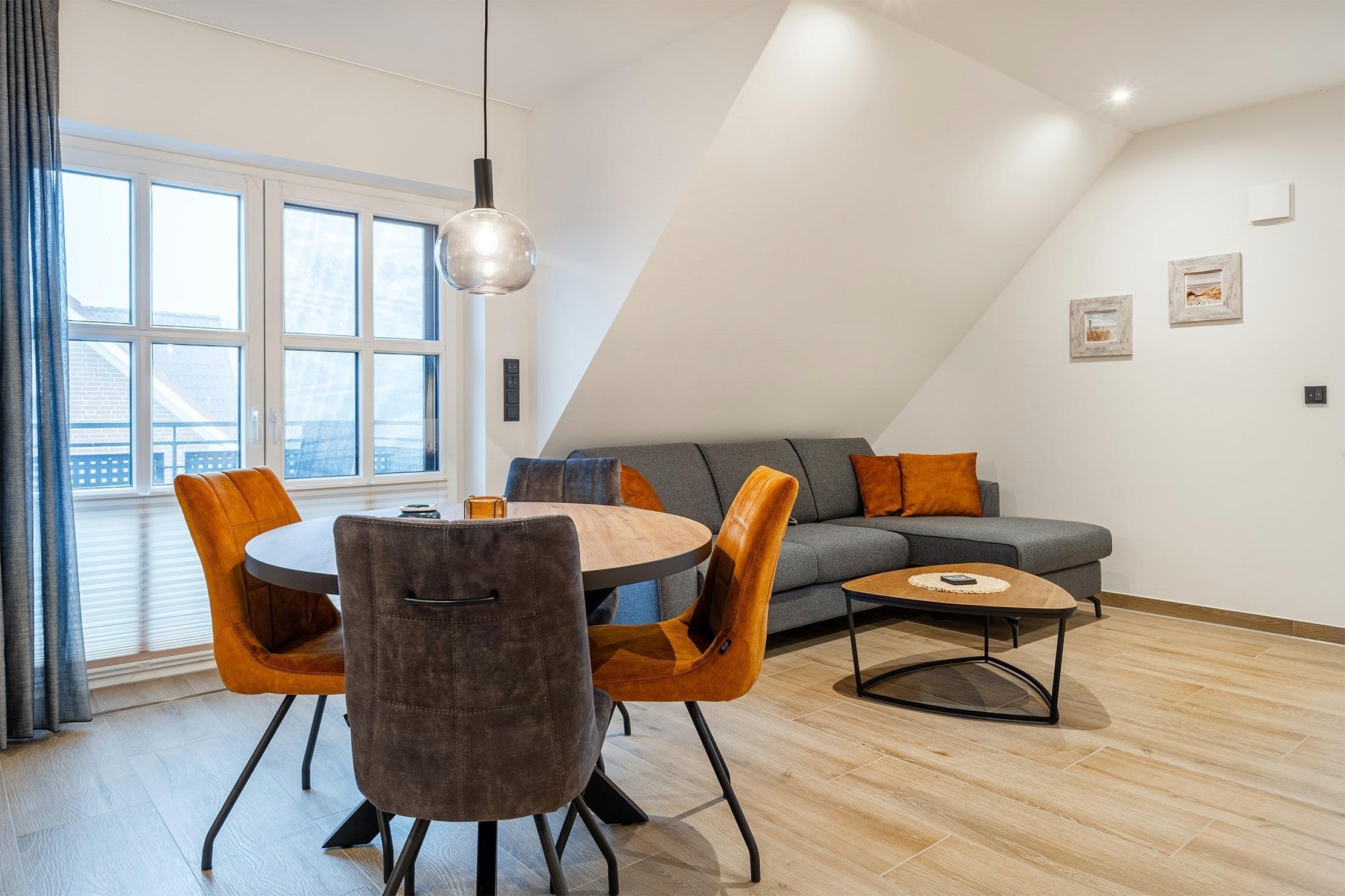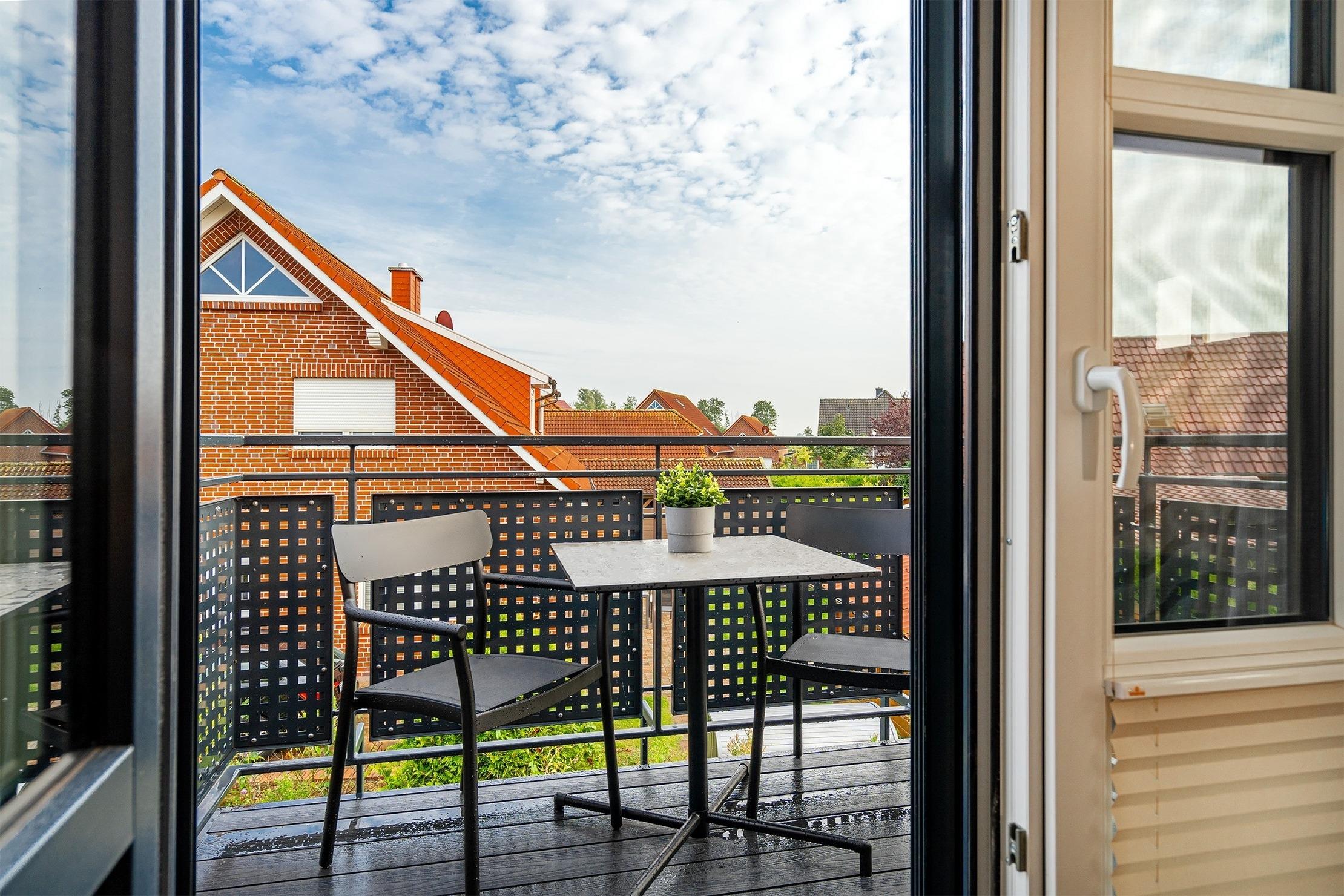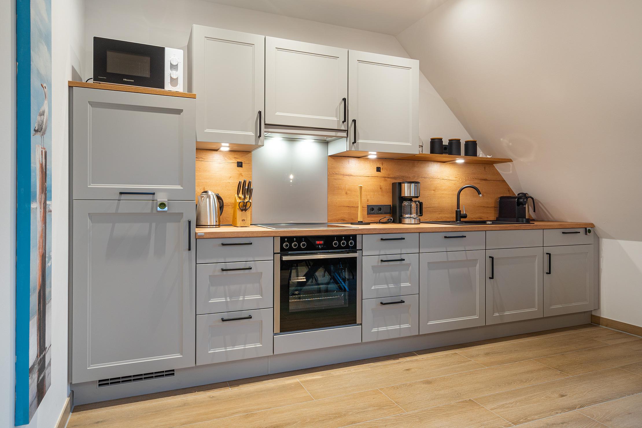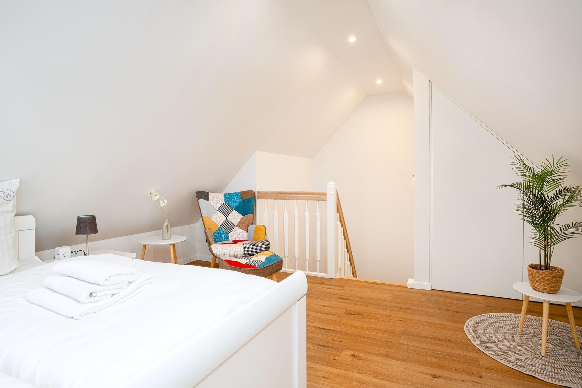Unsere neue, charmante Obergeschosswohnung "Möwenkoje" bietet auf 65qm den idealen Rückzugsort für Ihren Greetsiel Urlaub. Der offene Wohnbereich besticht durch seine einladende Atmosphäre und hochwertige Einbauküche, die perfekt in den Raum integriert ist und keine Wünsche offen lässt. Neben einem gemütlichen Schlafzimmer, das erholsame Nächte verspricht, verfügt die Wohnung außerdem über ein helles Tageslichtbad mit einer ebenerdigen Dusche und einen kleinen Abstellraum. Der ausgebaute Spitzboden, der offen als Galerie gestaltet ist, bietet mit dem Lesesessel nicht nur einen gemütlichen Rückzugsort für entspannte Stunden sondern außerdem ein weiteres Doppelbett, sodass insgesamt vier Personen untergebracht werden können (zwei Einzelbetten, die mit Verbindung zum Doppelbett verbunden sind). Ein weiteres Highlight ist der Balkon, auf dem Sie die frische Nordseeluft genießen und den Blick schweifen lassen können. Ein Abstellraum für Ihre Fahrräder sowie ein PKW Stellplatz stehen Ihnen selbstverständlich zur Verfügung.