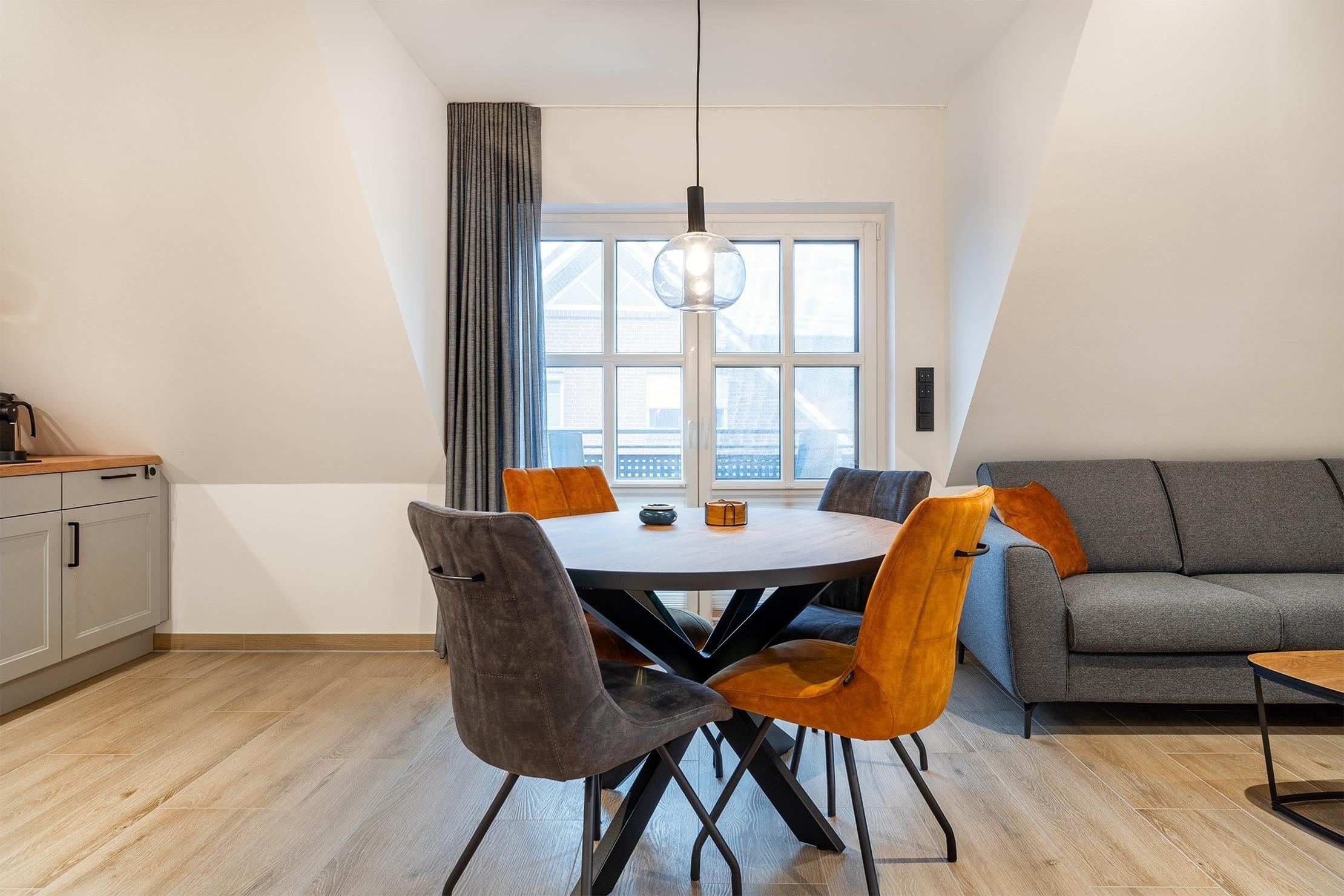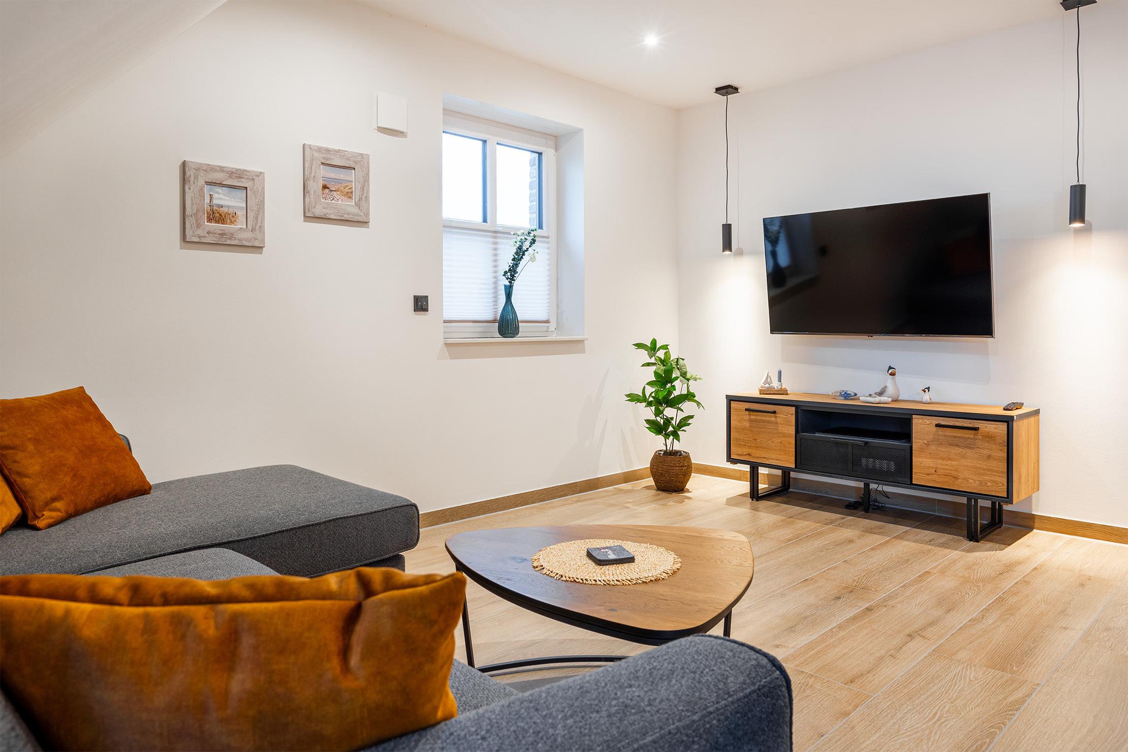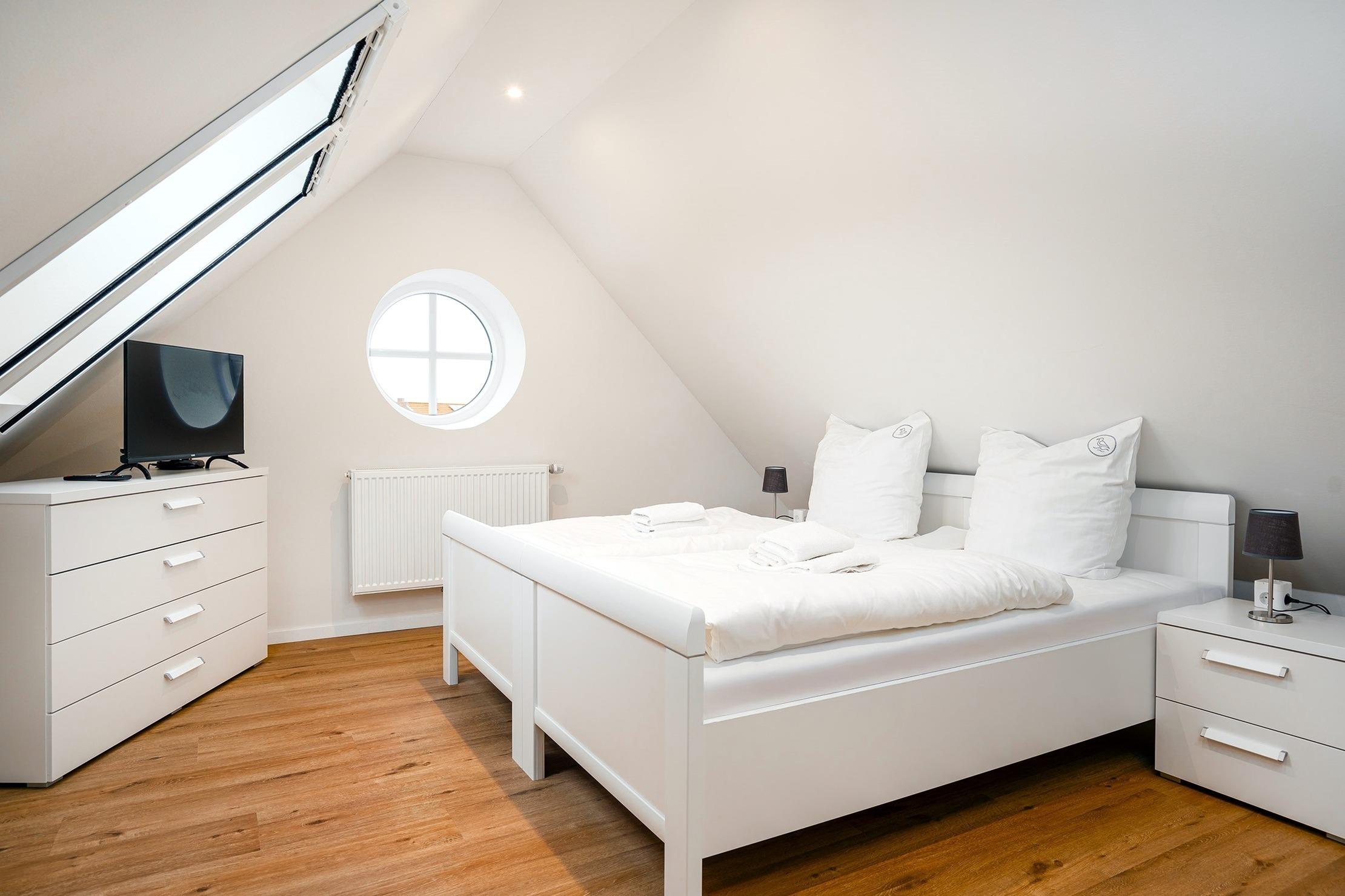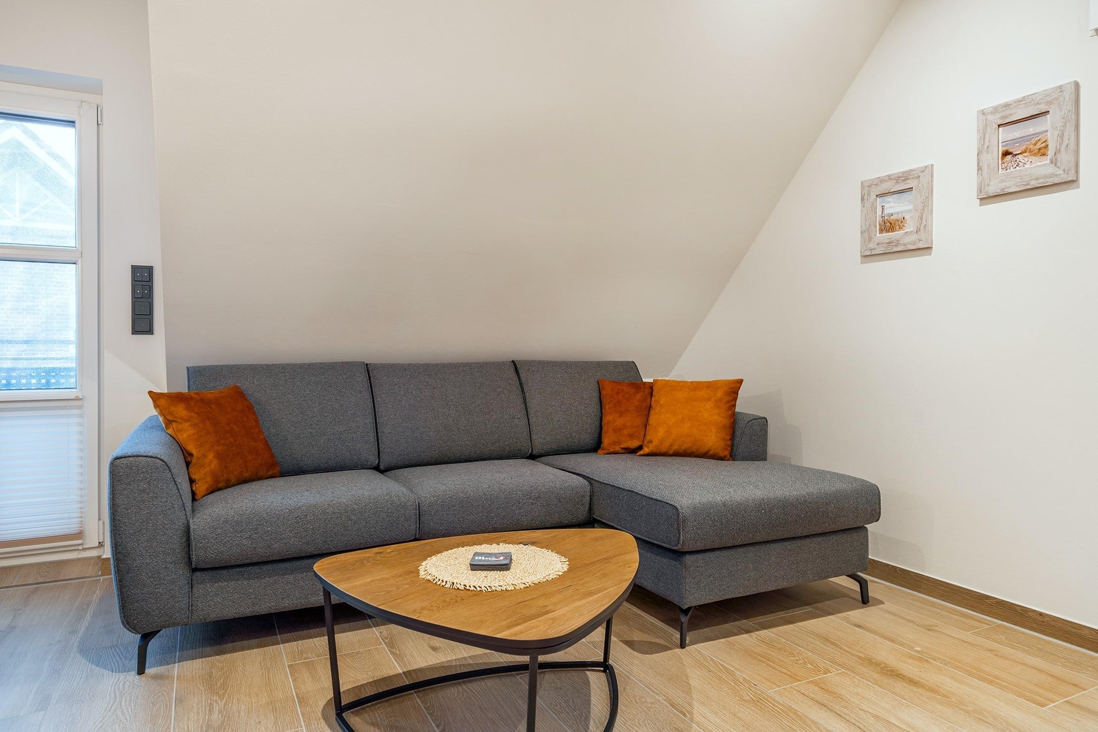 Unsere neue, charmante Obergeschosswohnung "Möwenkoje" bietet auf 65qm den idealen Rückzugsort für Ihren Greetsiel Urlaub. Der offene Wohnbereich besticht durch seine einladende Atmosphäre und hochwertige Einbauküche, die perfekt in den Raum integriert ist und keine Wünsche offen lässt. Neben einem gemütlichen Schlafzimmer, das erholsame Nächte verspricht, verfügt die Wohnung außerdem über ein helles Tageslichtbad mit einer ebenerdigen Dusche und einen kleinen Abstellraum. Der ausgebaute Spitzboden, der offen als Galerie gestaltet ist, bietet mit dem Lesesessel nicht nur einen gemütlichen Rückzugsort für entspannte Stunden sondern außerdem ein weiteres Doppelbett, sodass insgesamt vier Personen untergebracht werden können (zwei Einzelbetten, die mit Verbindung zum Doppelbett verbunden sind). Ein weiteres Highlight ist der Balkon, auf dem Sie die frische Nordseeluft genießen und den Blick schweifen lassen können. Ein Abstellraum für Ihre Fahrräder sowie ein PKW Stellplatz stehen Ihnen selbstverständlich zur Verfügung.