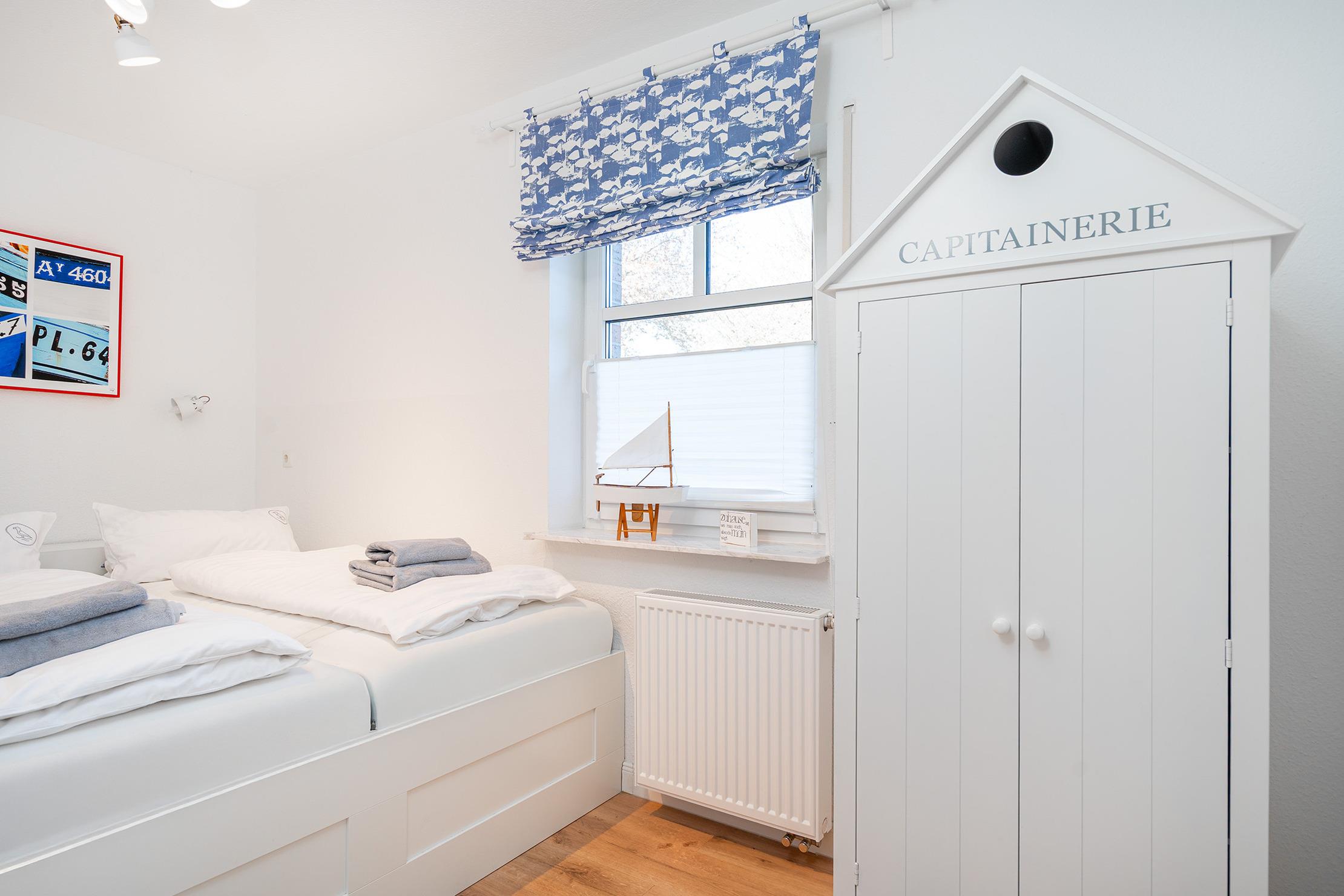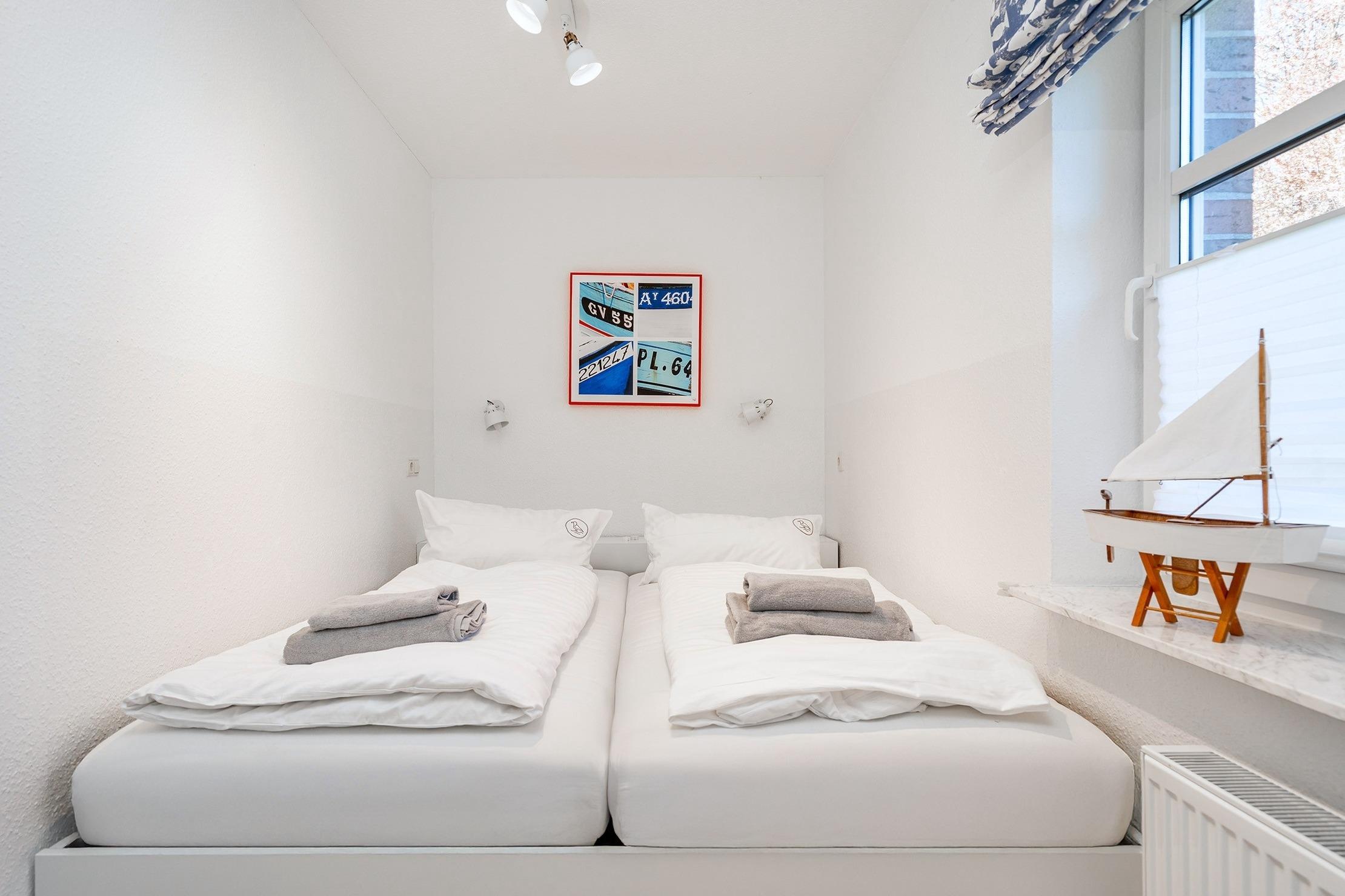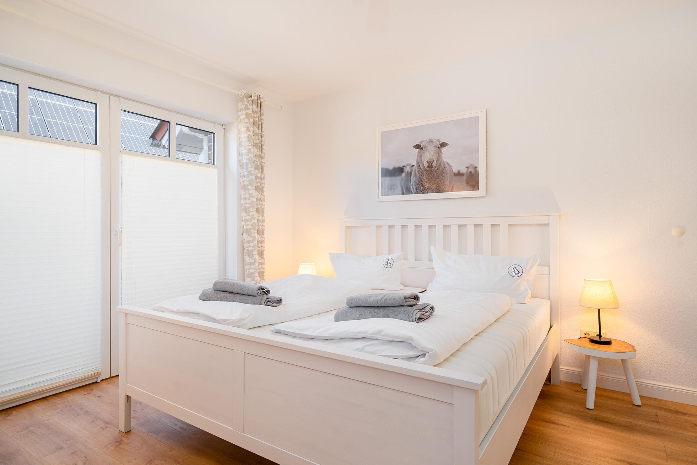Unsere ebenerdige Ferienwohnung "of und an" wurde erst kürzlich vollständig renoviert und befindet sich in zentraler Lage direkt hinter dem Deich. Mit ihrer nordischen Einrichtung in sanften Natur- und Weißtönen schafft die Wohnung eine gemütliche Atmosphäre. Auf etwa 70qm bietet sie einen hellen und hochwertig eingerichteten Wohnbereich mit einer großen und voll ausgestatteten Küchenzeile, einen Essbereich sowie eine einladende Sofaecke für gemeinsame Abende. Neben einem Tageslichtbad mit ebenerdiger Dusche verfügt die Wohnung über zwei Schlafzimmer mit Doppelbetten. Auch ein Abstellraum steht zur Verfügung. Die großzügige Terrasse mit Garten erreichen Sie bequem durch den Wohnbereich, hier lässt sich die frische Nordseeluft bestens genießen. Am Haus steht Ihnen ein reservierter Parkplatz zur Verfügung. Besonders hervorzuheben bei dieser Wohnung ist die Kombination aus ruhiger und zentraler Lage, denn den Hafen mit seinen zahlreichen Restaurants und kleinen Geschäften erreichen Sie über den Deich in nur wenigen hundert Metern zu Fuß und dennoch bietet die Wohnung mit ihrer Außenanlage den perfekten Rückzugsort.