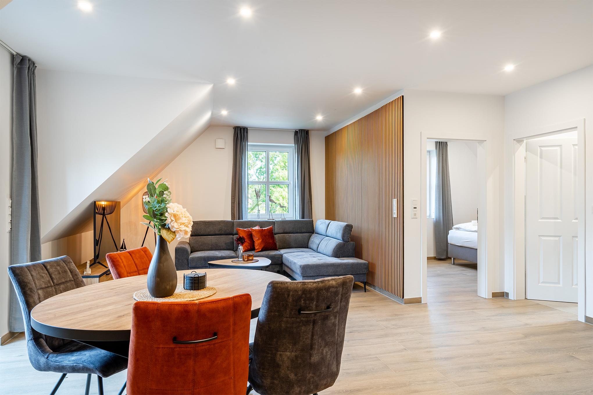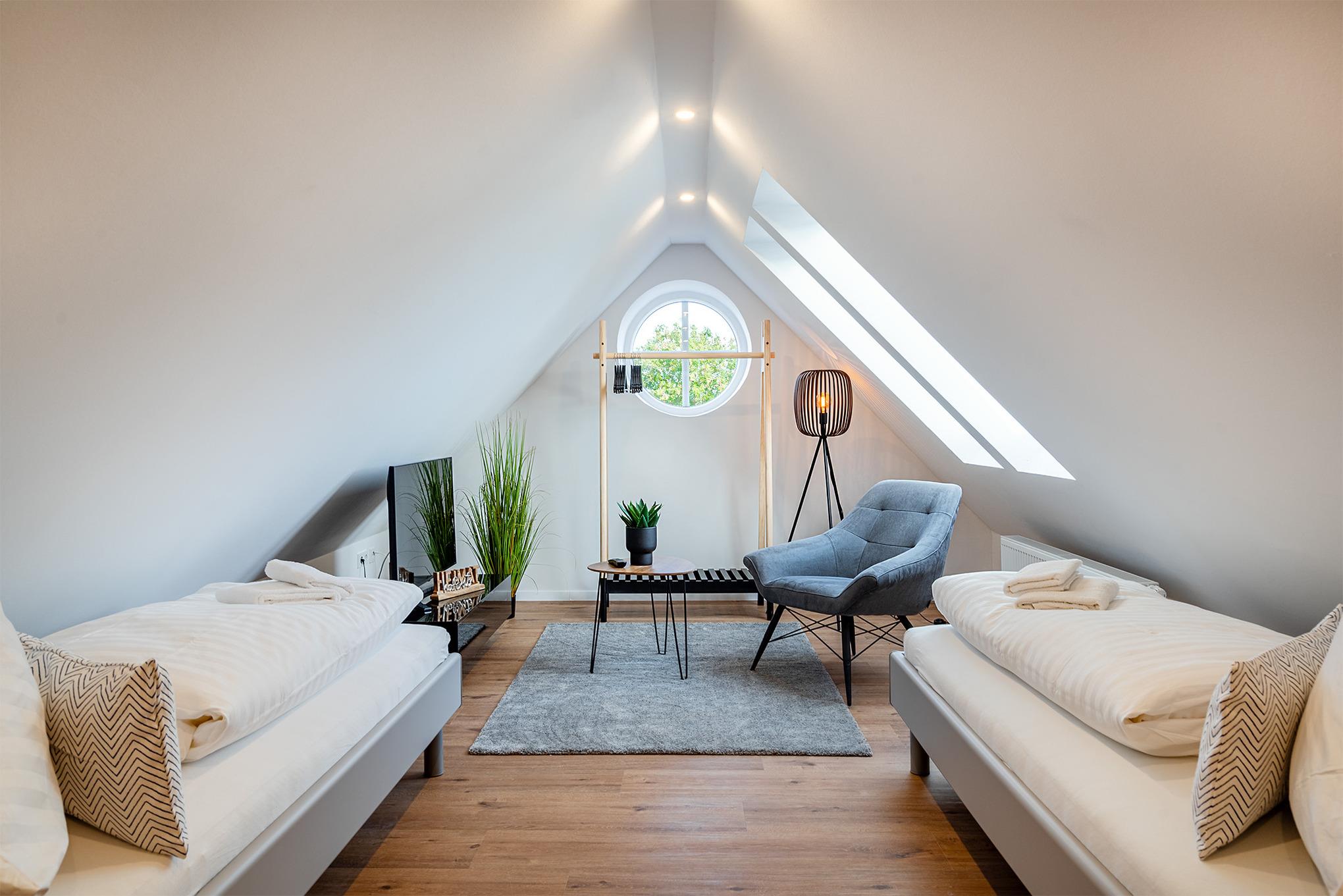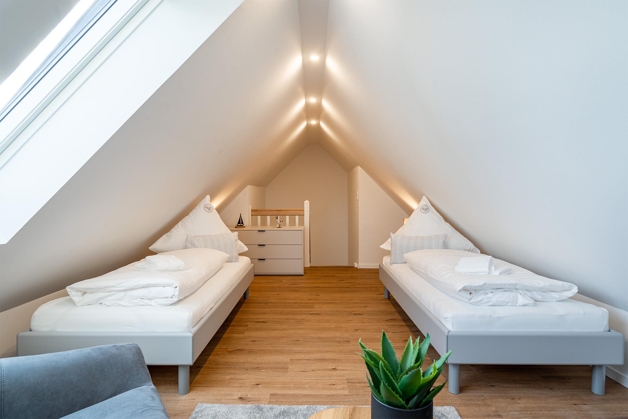 Unsere neue Ferienwohnung "Vista 3" steht Ihnen seit Herbst 2023 zur Verfügung. Sie verfügt über ein großzügiges Schlafzimmer mit qualitativem Boxspringbett und einen ausgebauten Spitzboden (Gallerie) mit zwei weiteren Betten, die man auch zusammenstellen kann. Hier entspannt es sich im Lesesessel besonders gut mit Blick auf die bekannten Zwillingsmühlen. Ein großes Tageslicht Bad mit ebenerdiger Dusche, ein kleines Gästebad mit weiterer Dusche, eine voll ausgestattete Küche und ein geräumiger und heller Wohnraum machen die Vista 3 besonders komfortabel. Auf dem Balkon mit bequemen Möbeln verbringen Sie Ihre Auszeit in äußerst ruhiger Lage. Selbstverständlich stehen Ihnen ein eigener Parkplatz, sowie eine Abstellmöglichkeit für Ihre Fahrräder zur Verfügung.