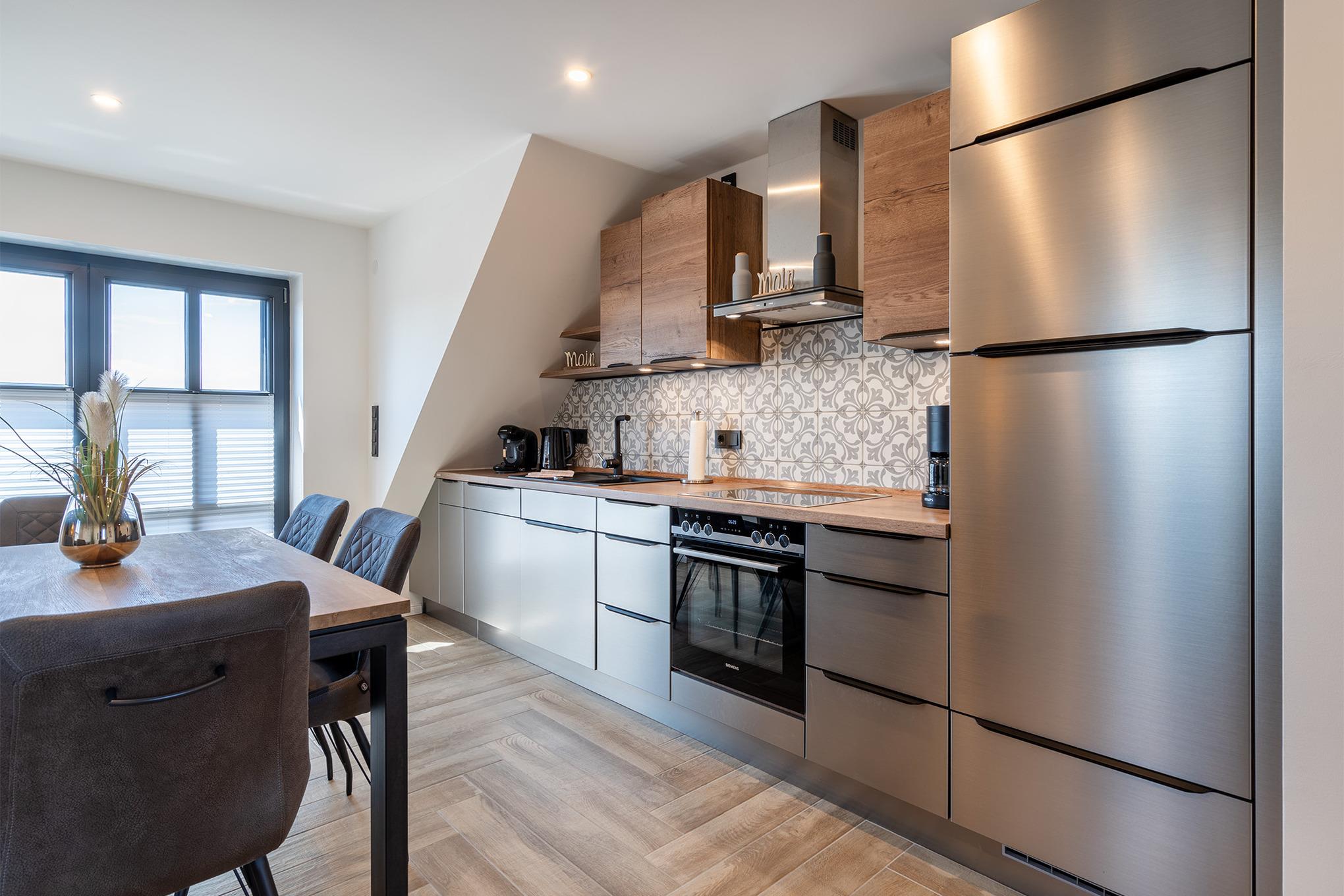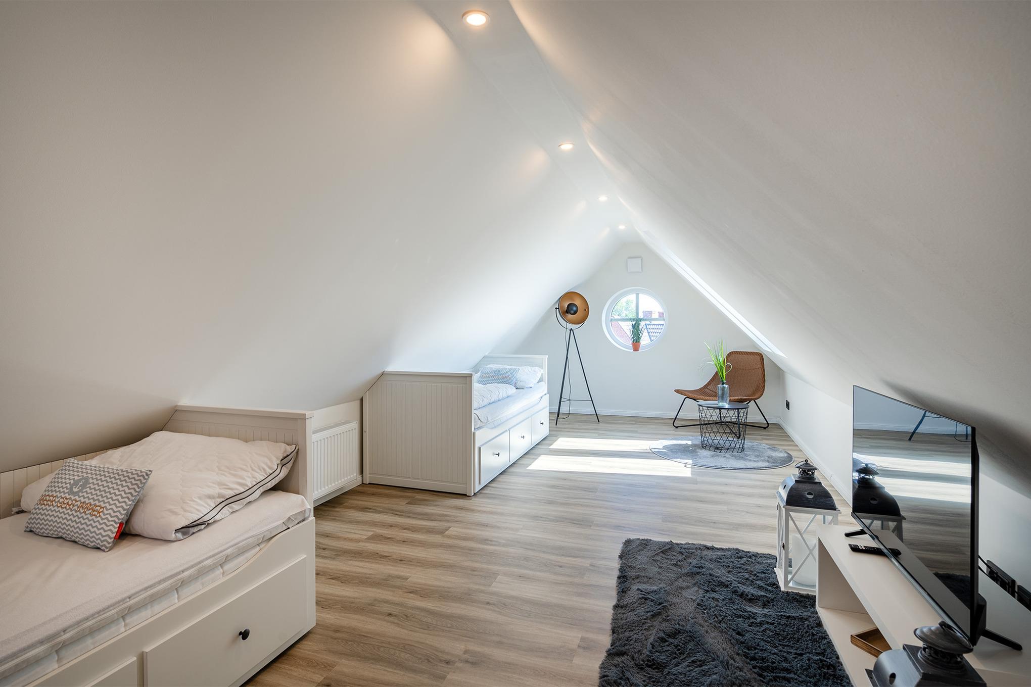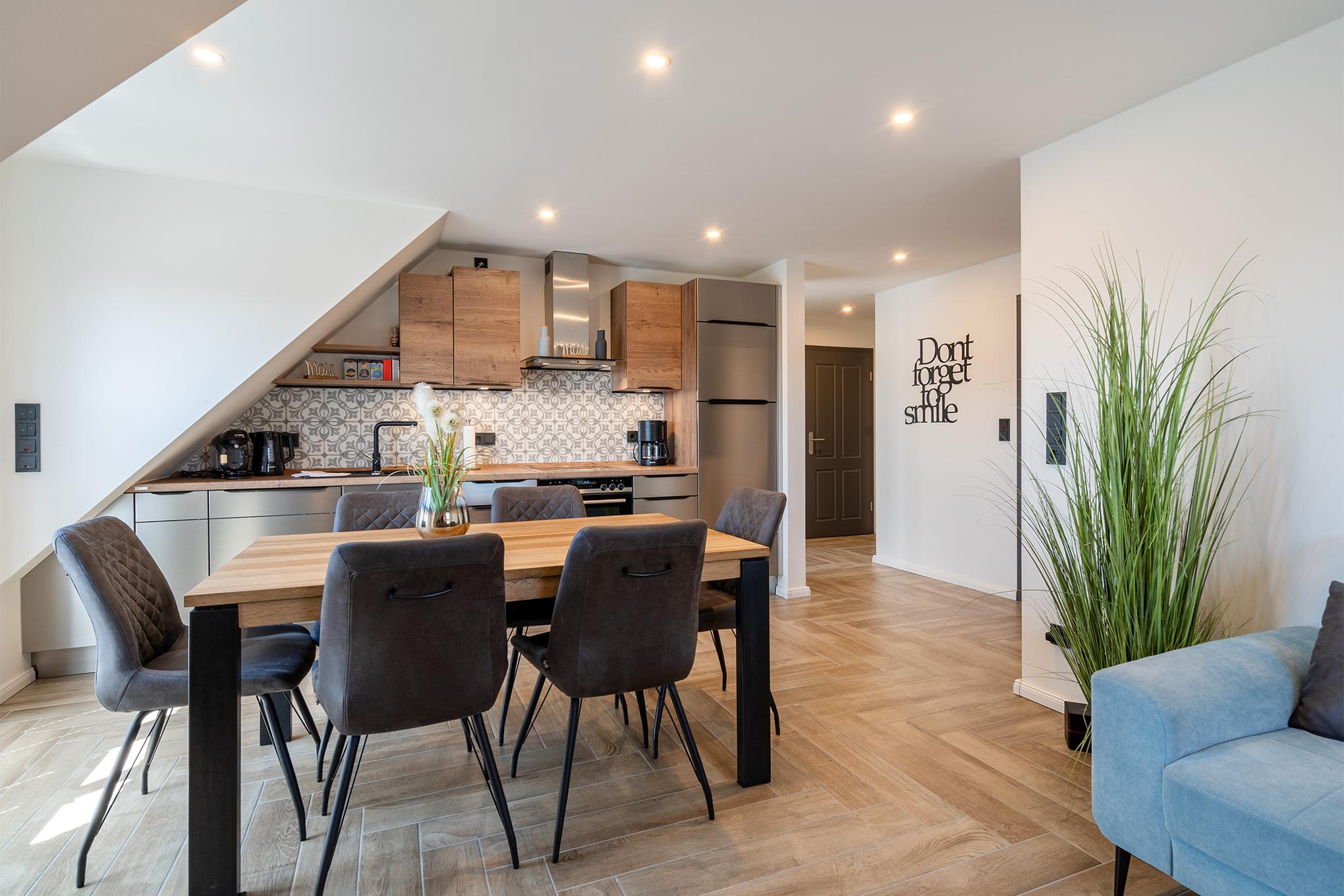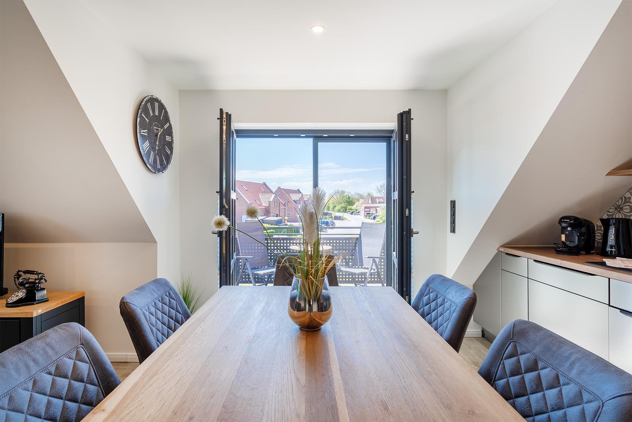 Unsere Ferienwohnung "Vista 5" in Greetsiel ist das perfekte Urlaubsdomizil zum Ankommen, Durchatmen und Wohlfühlen. Sie befindet sich im Obergeschoss eines Hauses und bietet auf großzügigen 85qm Platz für bis zu sechs Personen auf zwei Ebenen. Das Herzstück der Wohnung ist der helle, offene und moderne Wohnraum, der mit großzügigen Sitzmöglichkeiten im Wohn- und Essbereich überzeugt. Er ist lichtdurchflutet und bietet direkten Zugang zum Sonnenbalkon, auf dem Sie mit einer Tasse Ostfriesentee die frische Luft und die Weitsicht genießen können. Die gesamte Einrichtung der Wohnung ist äußerst hochwertig, was sich auch in der voll ausgestatteten Küchenzeile widerspiegelt. Für erholsame Nächte sorgen zwei Schlafzimmer mit komfortablen Boxspringbetten und ausreichend Stauraum. Zwei moderne Tageslichtbäder mit ebenerdigen Duschen bieten zusätzlichen Komfort und machen die Wohnung auch für Familien besonders praktisch. Ein echtes Highlight ist der ausgebaute Spitzboden: Hier finden Sie nicht nur zwei weitere Einzelbetten, sondern auch eine kleine Leseecke mit Sessel. Durch die Dachfenster ist dieser Bereich lichtdurchflutet und schafft eine gemütliche Atmosphäre – der perfekte Rückzugsort für entspannte Stunden mit einem guten Buch. Im Außenbereich steht Ihnen neben einem reservierten PKW-Stellplatz außerdem ein Abstellraum für Fahrräder zur Verfügung.