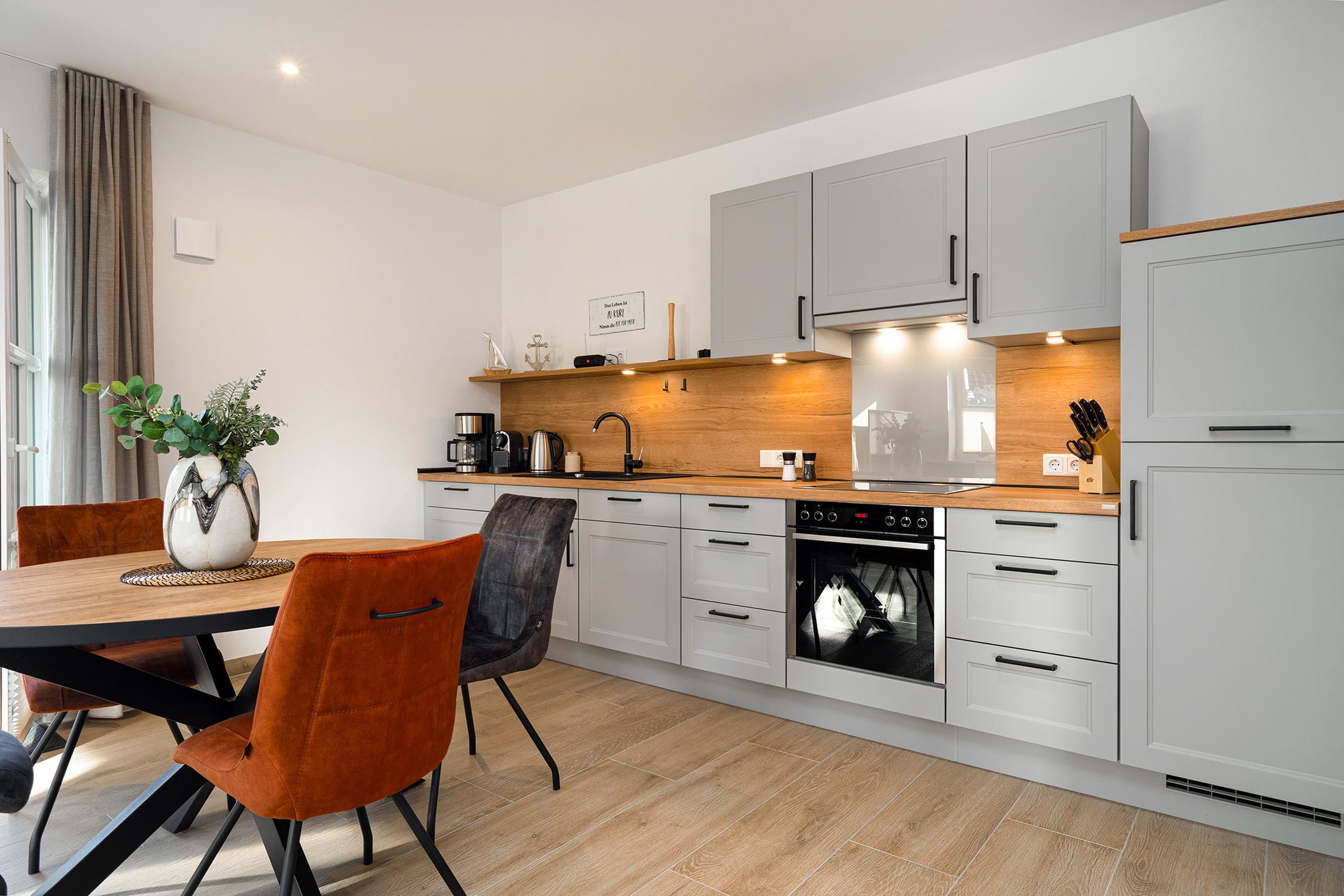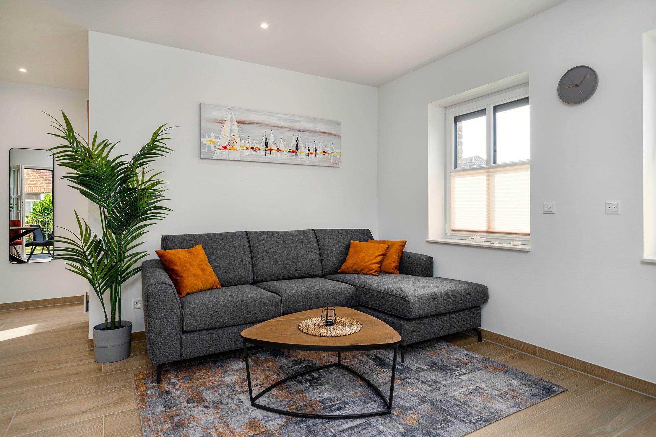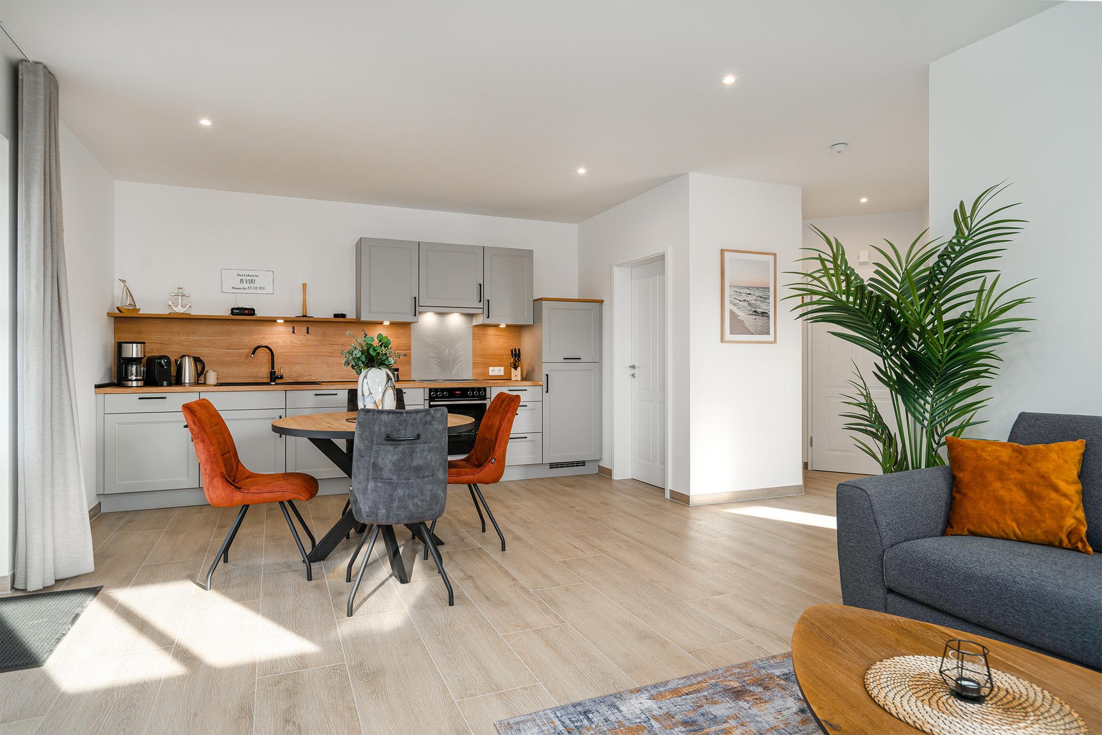 Diese gemütliche 60qm große Wohnung "Vista 9" im Erdgeschoss bietet alles, was Sie für einen erholsamen Urlaub benötigen. Sie verfügt über ein einladendes Schlafzimmer mit einem komfortablen Boxspringbett, das für erholsamen Schlaf sorgt und ein helles Tageslichtbad mit ebenerdiger Dusche. Im offenen und großzügig gestalteten Wohn-Ess-Bereich finden Sie eine hochwertig ausgestattete Einbauküche sowie eine gemütliche Sofaecke zum Entspannen. Der große, voll eingezäunte Garten bietet viel Platz zum Entspannen und Spielen – ideal für Gäste, die mit Hund anreisen. Auf der Terrasse, die mit Gartenmöbeln und bequemen Sonnenliegen ausgestattet ist, können Sie sonnige Stunden im Freien genießen. Selbstverständlich verfügt die Wohnung über einen reservierten Parkplatz sowie einen Abstellraum für Fahrräder.