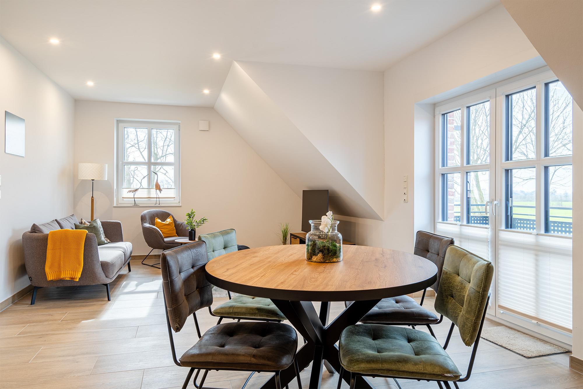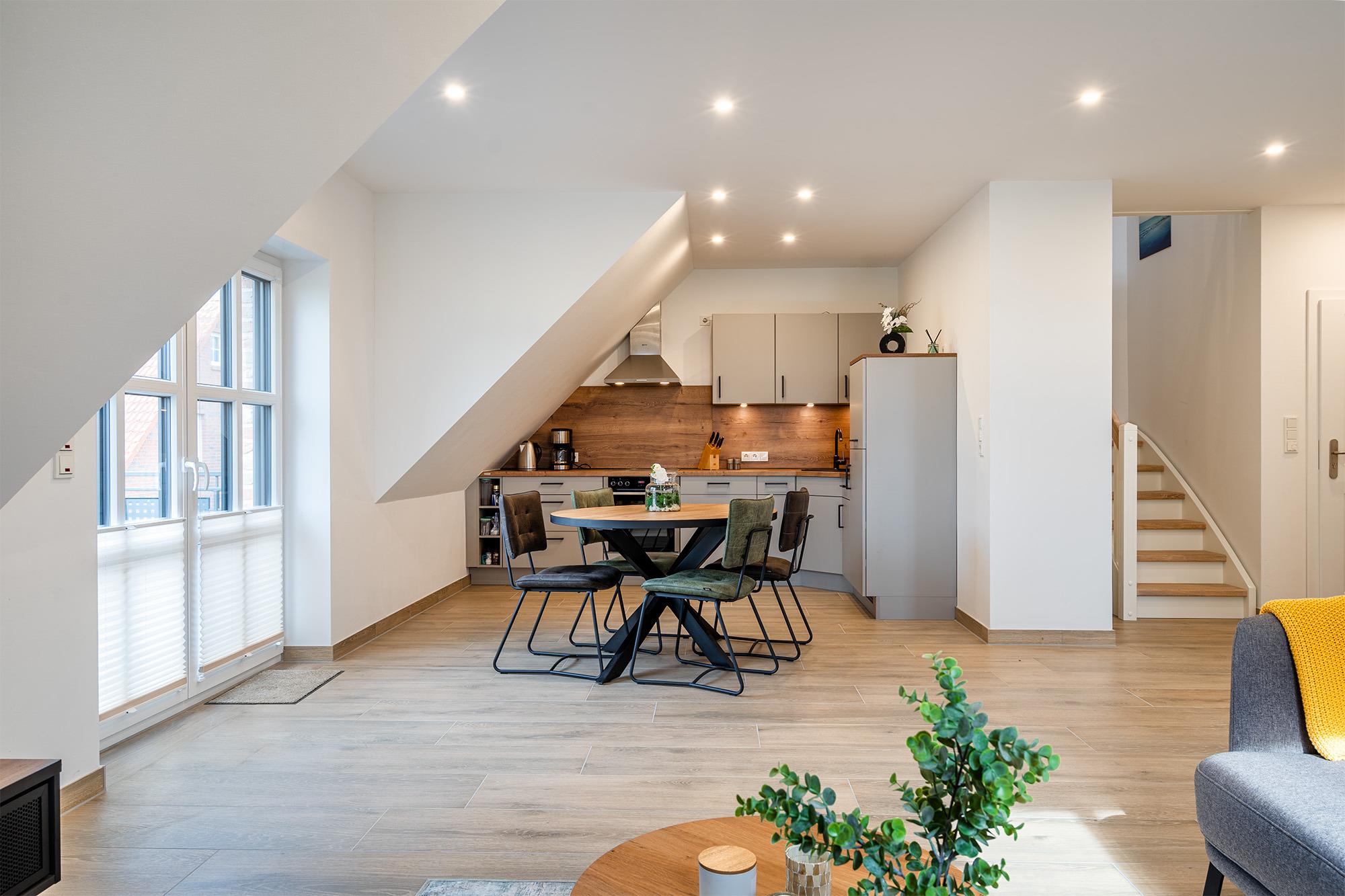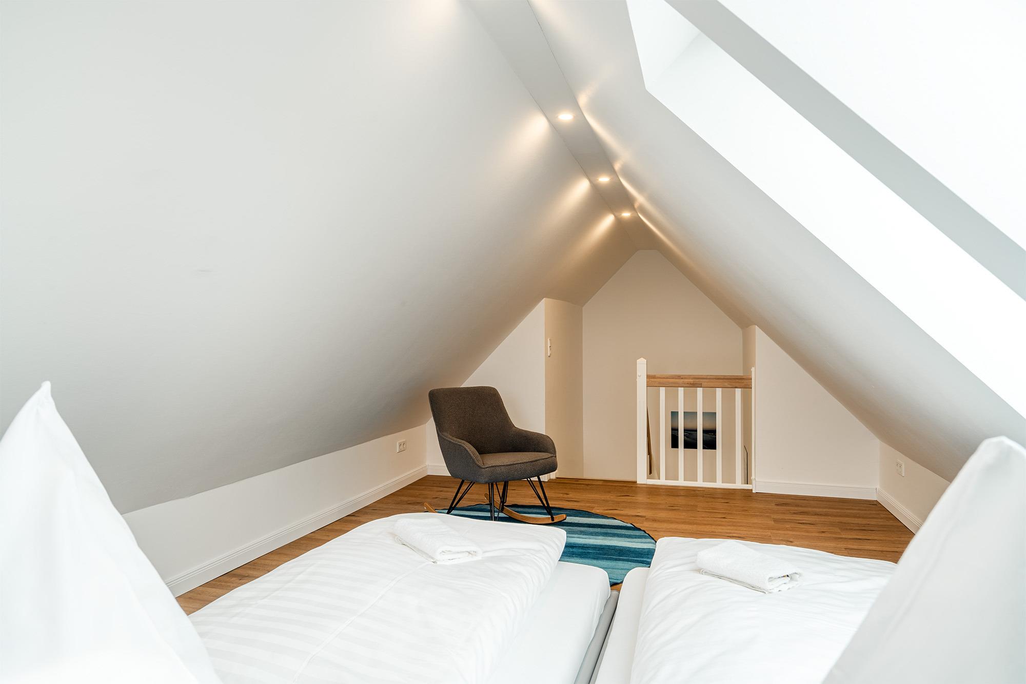 'Watt'n Traum' - das werden Sie sicher auch denken, wenn Sie unsere neu erbaute Ferienwohnung im Obergeschoss beziehen! Nicht nur der lichtdurchflutete Wohnraum mit hochwertig ausgestatteter Küche und Essbereich wird Ihnen gefallen. Neben dem geräumigen Schlafzimmer mit bequemem Boxspringbett verfügt die Wohnung außerdem über einen ausgebauten Spitzboden. Dieser ist als Galerie gestaltet und bietet neben zwei weiteren Schlafmöglichkeiten außerdem eine gemütliche Sitzecke, in die man sich mit einem guten Buch zurück ziehen kann. Komfortabel sind vor allem die zwei Tageslichtbäder, zum Beispiel für den gemeinsamen Urlaub mit Freunden. Ein besonderes Highlight dieser Wohnung ist der große Gemeinschaftsgarten, den Sie - abgesehen von dem Sonnenbalkon Ihrer Wohnung - ebenfalls nutzen können. Neben einem PKW Parkplatz bietet diese Wohnung selbstverständlich auch eine Abstellmöglichkeit für Fahrräder.