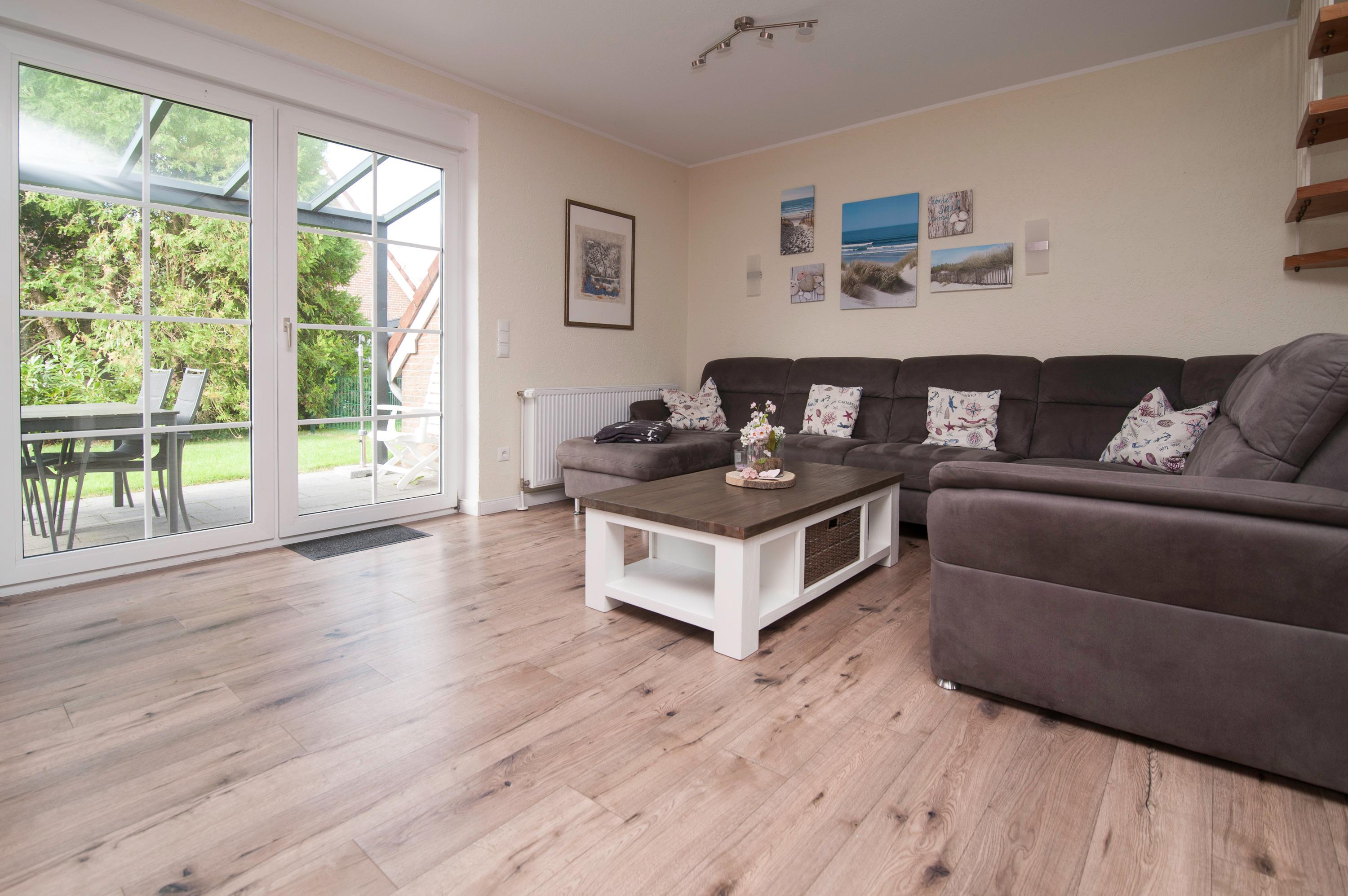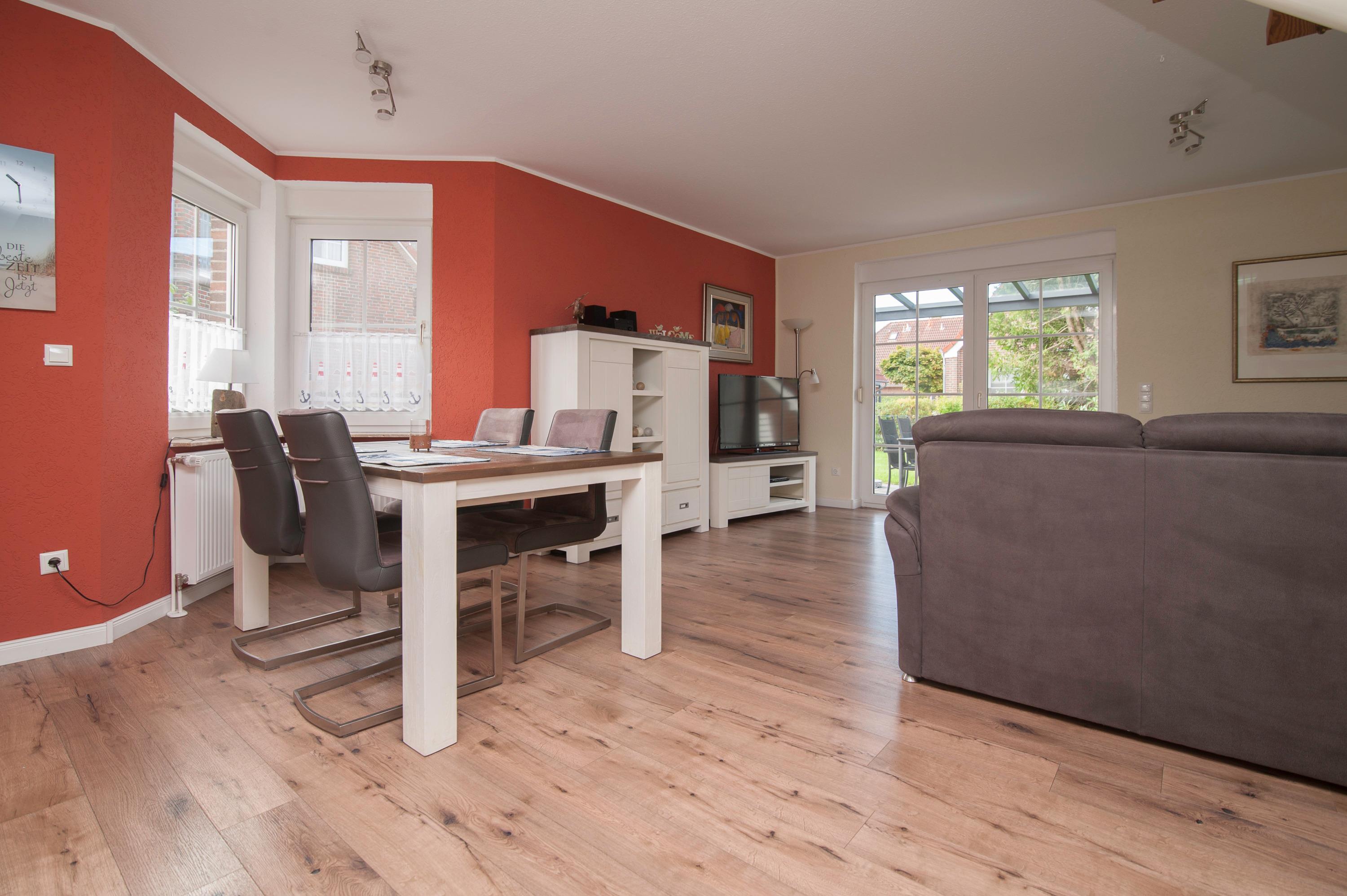 Eine sonnige Terrasse mit Gartenmöbeln lädt zum Erholen und Abschalten ein. Durch die bevorzugte Lage des Hauses in Deich- und Hafennähe erreichen Sie kleine und große Sehenswürdigkeiten bequem zu Fuß oder per Fahrrad an frischer Seeluft.