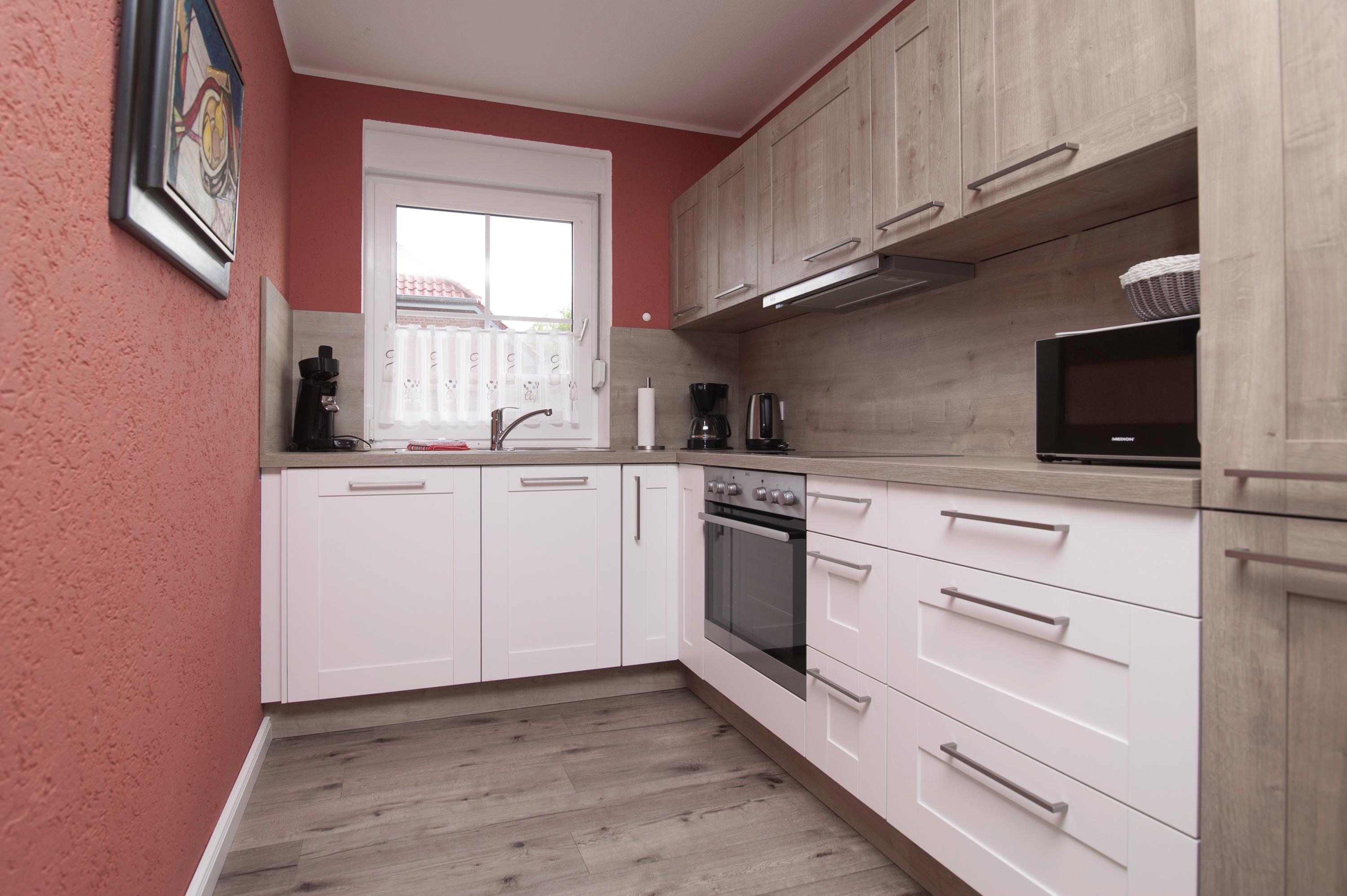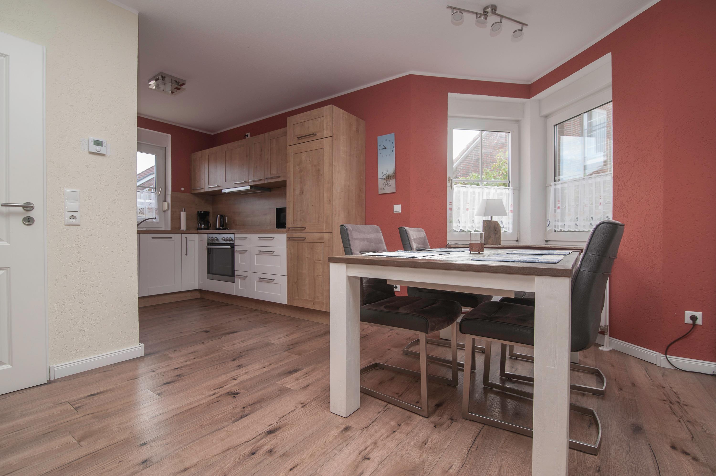 Das Erdgeschoß bietet eine komplett eingerichtete, zum Wohnraum hin offene, Küche mit Herd und Cerankochfeld, Dunstabzugshaube, Mikrowelle, Geschirrspüler, Kühlschrank, separater Gefrierschrank mit 2 Schubladen und eine Filterkaffeemaschine.