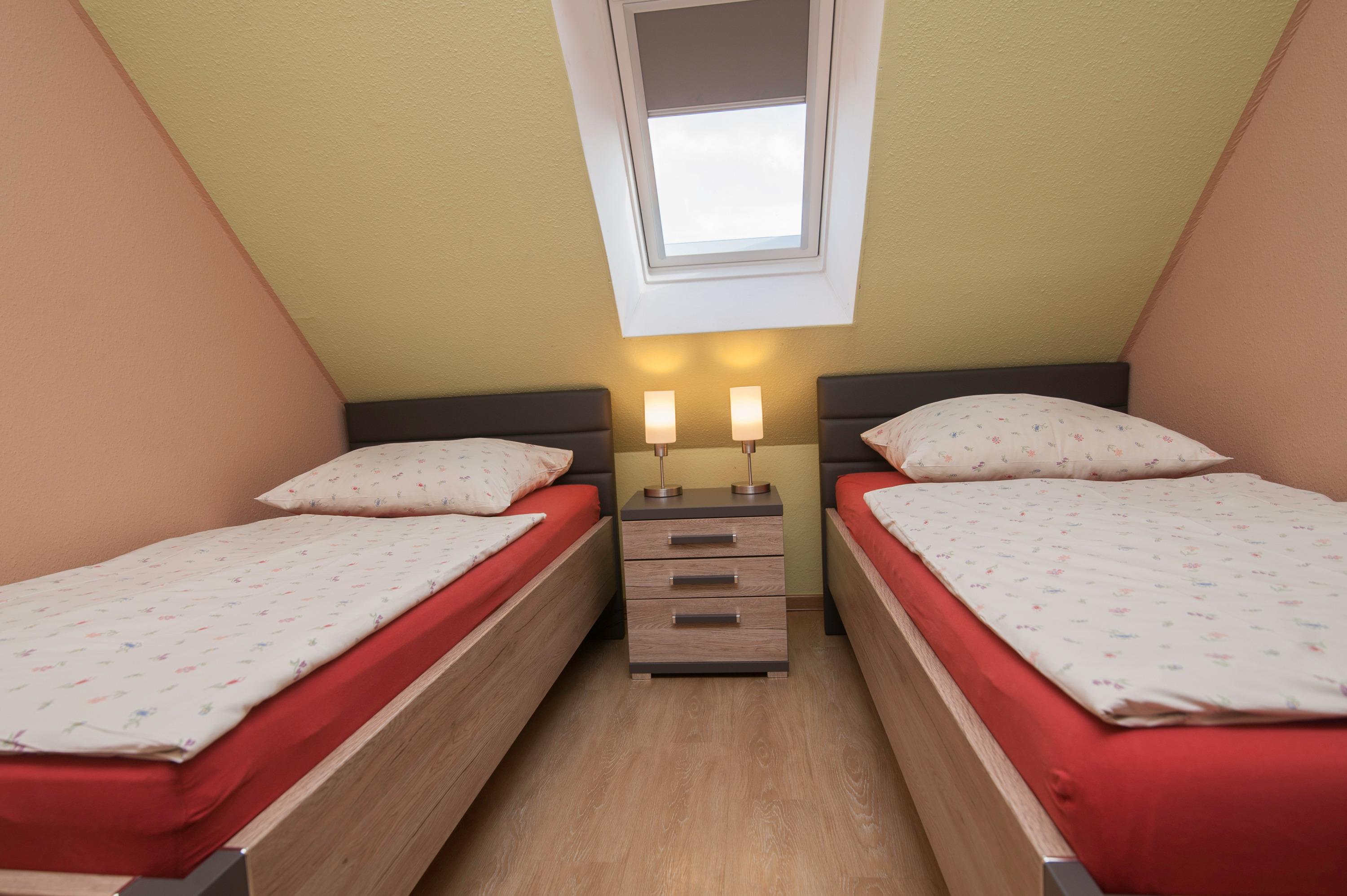 Im Obergeschoß befinden sich ein Badezimmer mit Dusche (niedriger Einstieg) und zwei Schlafzimmer, eines mit Doppelbett (2 x 90 x 200 cm) und Innenplissee, das zweite Schlafzimmer mit 2 Einzelbetten (90 x 200cm), Innenplissees und Verdunkelungsrollo.