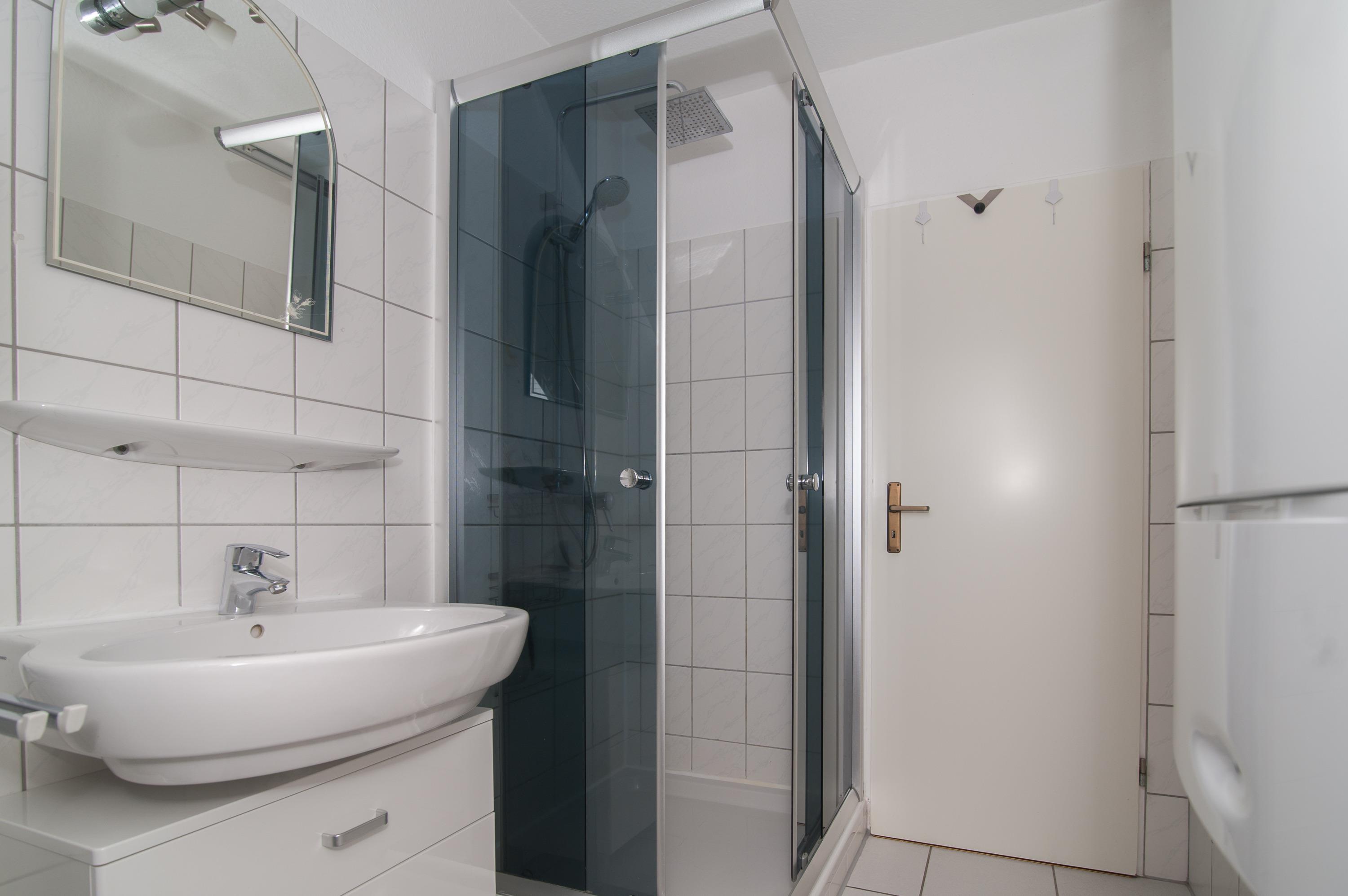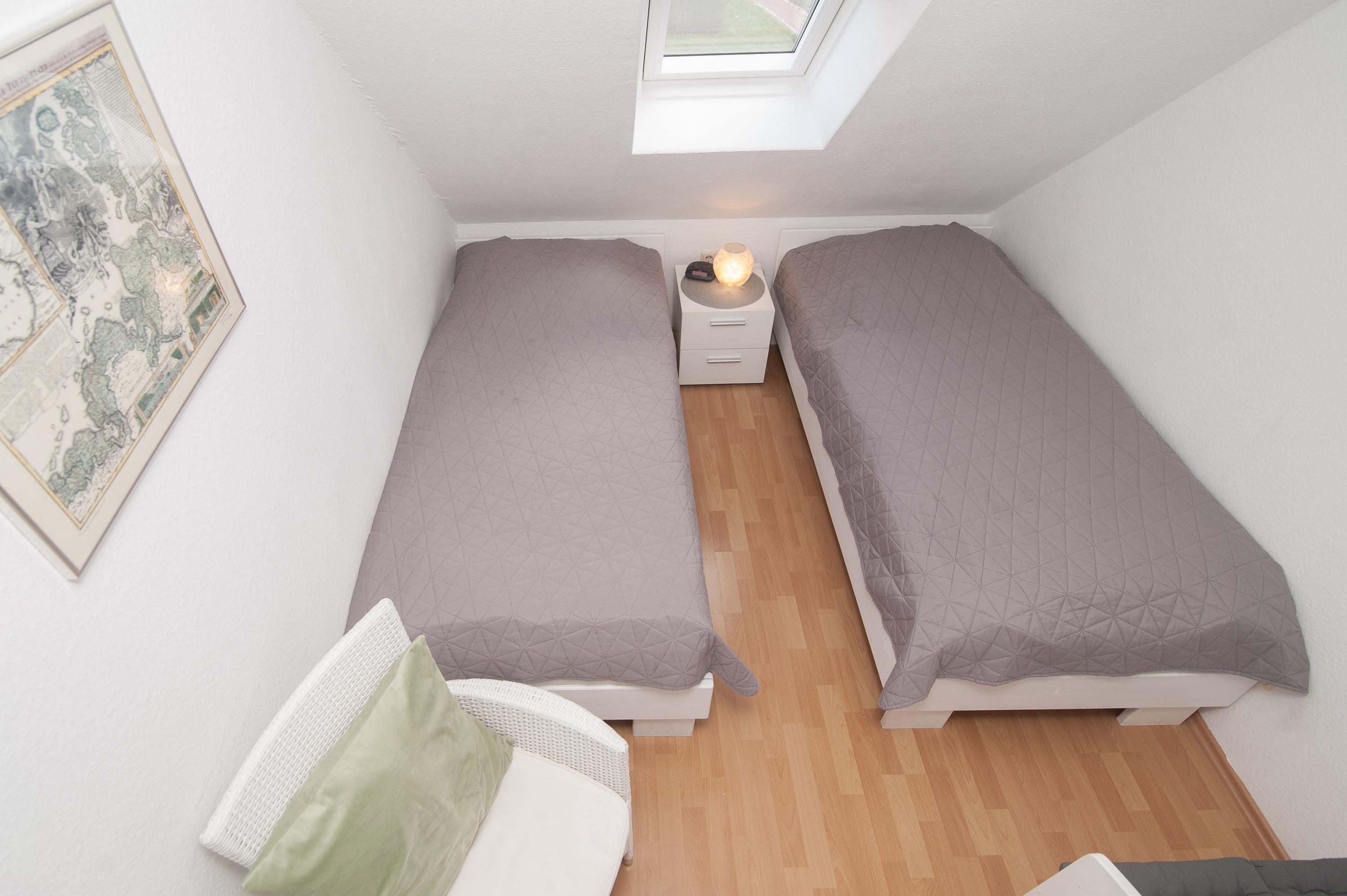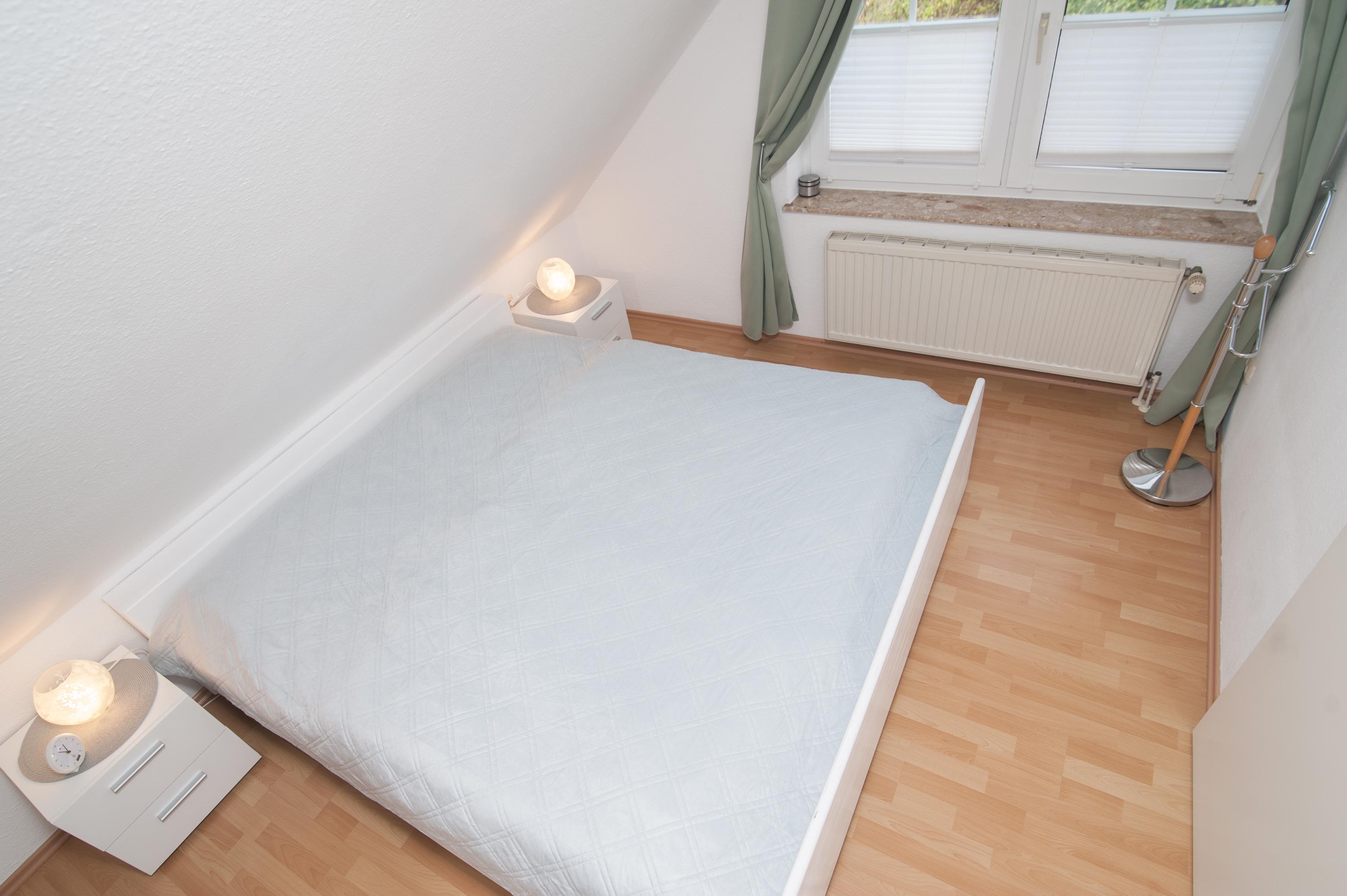 Einbauküche komplett ausgestattet, mit Herd und Cerankochfeld, Mikrowelle, Bauknecht Geschirrspüler, Kühlschrank mit Gefrierfach, Filterkaffeemaschine, Toaster und vielem mehr. Das Badezimmer gefliest mit Dusche, Waschbecken, Fön und WC befindet sich im Obergeschoss, sowie ein Schlafzimmer mit Doppelbett (90 x 200cm) und ein Schlafzimmer mit 2 Einzelbetten[nbsp] (90 x 200cm). Diese sind mit Laminatboden ausgelegt.