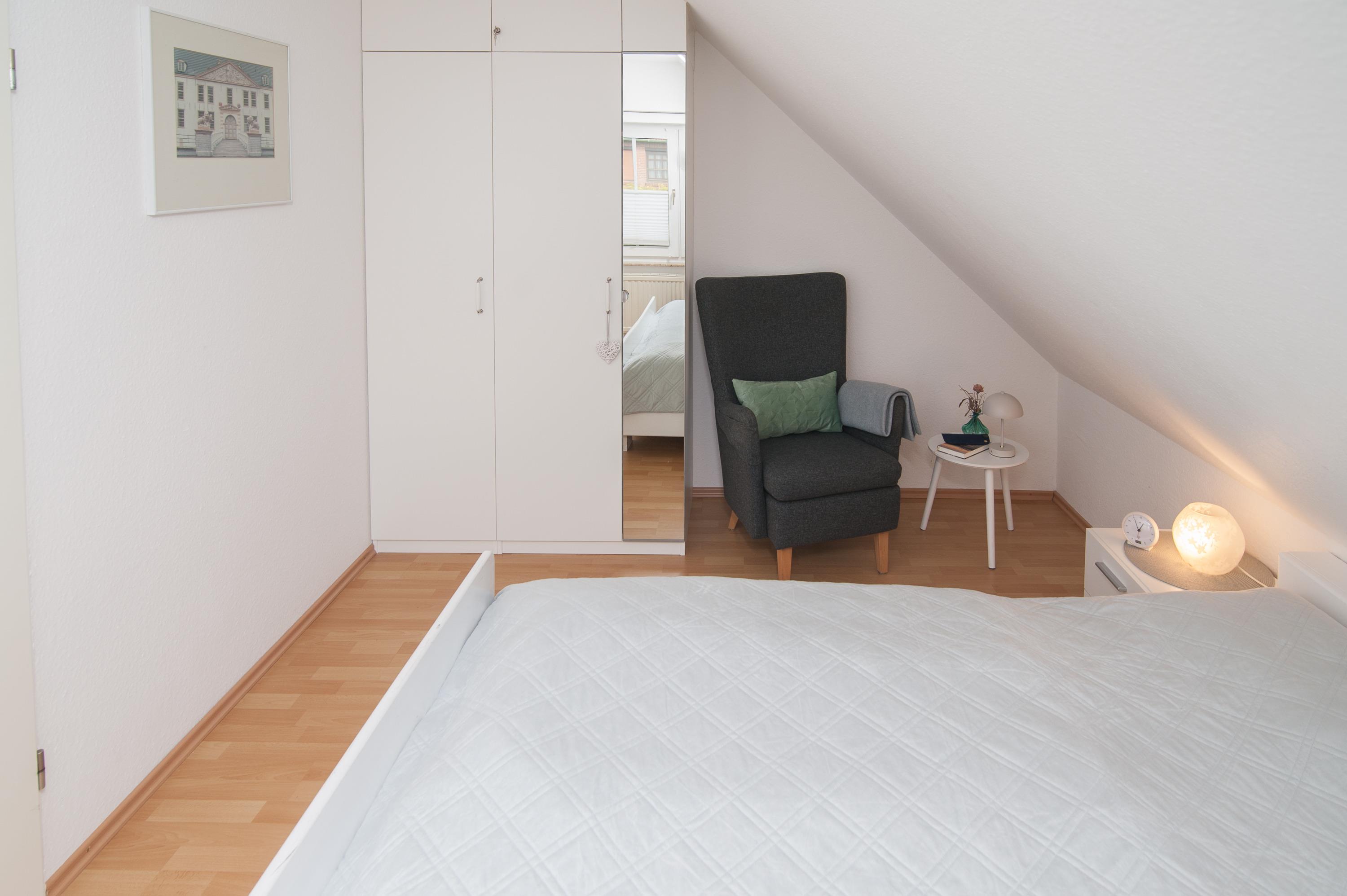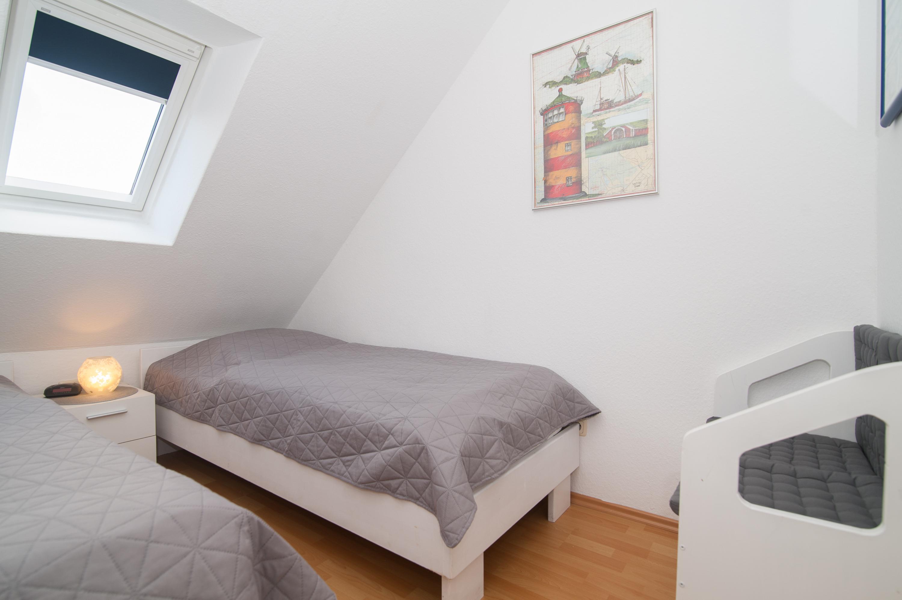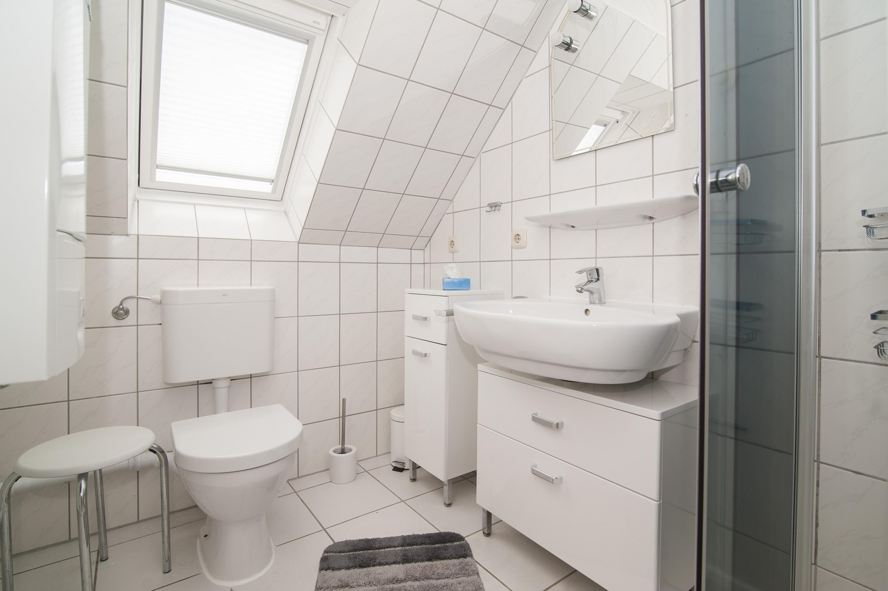 Einbauküche komplett ausgestattet, mit Herd und Cerankochfeld, Mikrowelle, Bauknecht Geschirrspüler, Kühlschrank mit Gefrierfach, Filterkaffeemaschine, Toaster und vielem mehr. Das Badezimmer gefliest mit Dusche, Waschbecken, Fön und WC befindet sich im Obergeschoss, sowie ein Schlafzimmer mit Doppelbett (90 x 200cm) und ein Schlafzimmer mit 2 Einzelbetten[nbsp] (90 x 200cm). Diese sind mit Laminatboden ausgelegt.