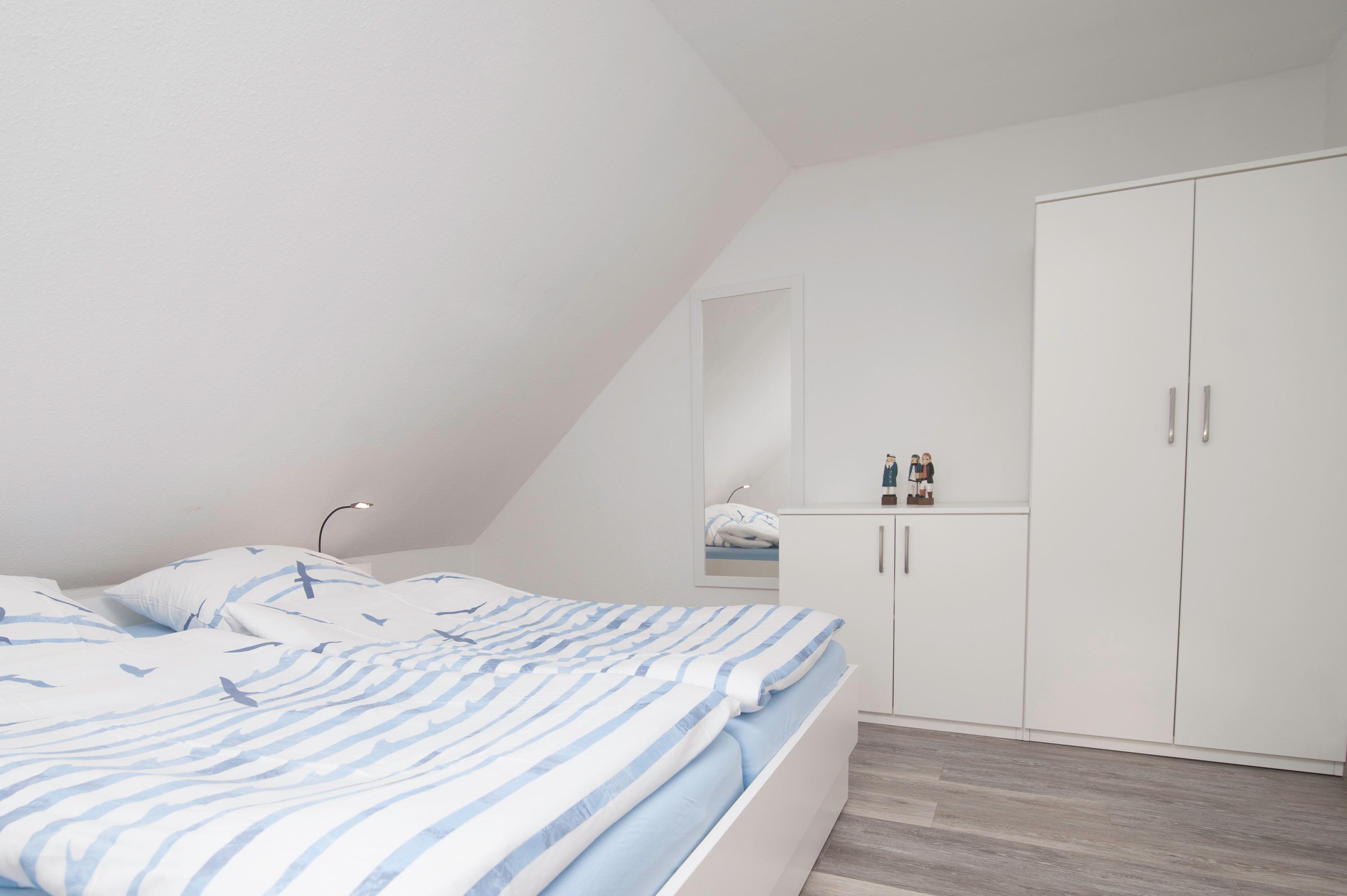Im Obergeschoss befinden sich das Badezimmer mit Dusche, Waschbecken und WC sowie ein Schlafzimmer mit Doppelbett (2 x 90 x 200cm) und ein Schlafzimmer mit zwei Einzelbetten (90 x 200cm), alle Betten im Haus verfügen über verstellbare Lattenroste.