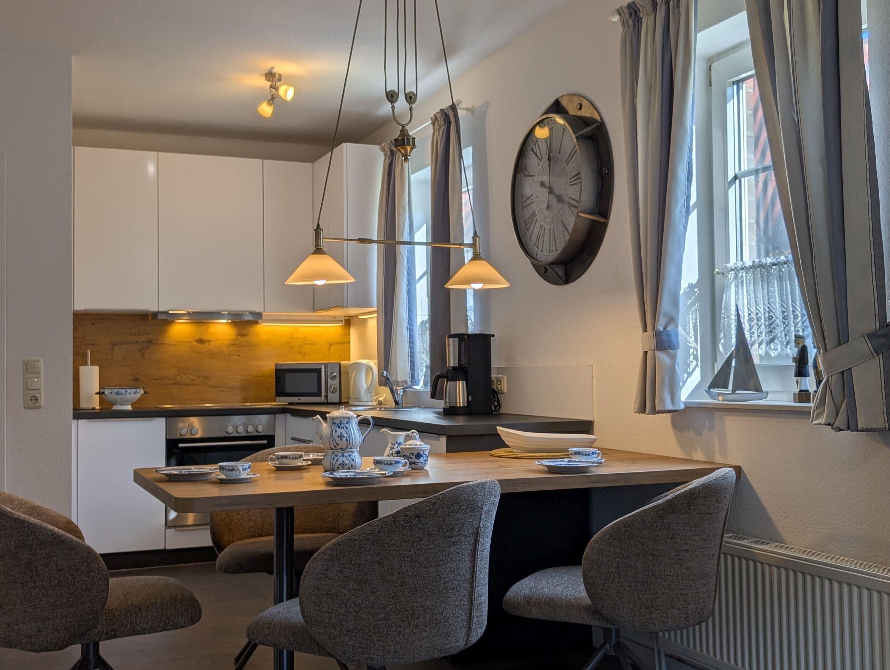 Einbauküche komplett ausgestattet mit: Herd incl. Cerankochfeld, Umlufthaube, Mikrowelle, Kühlschrank mit Gefrierfach, Geschirrspüler, Filterkaffeemaschine, Toaster - dort befindet sich auch die Waschmaschine.
