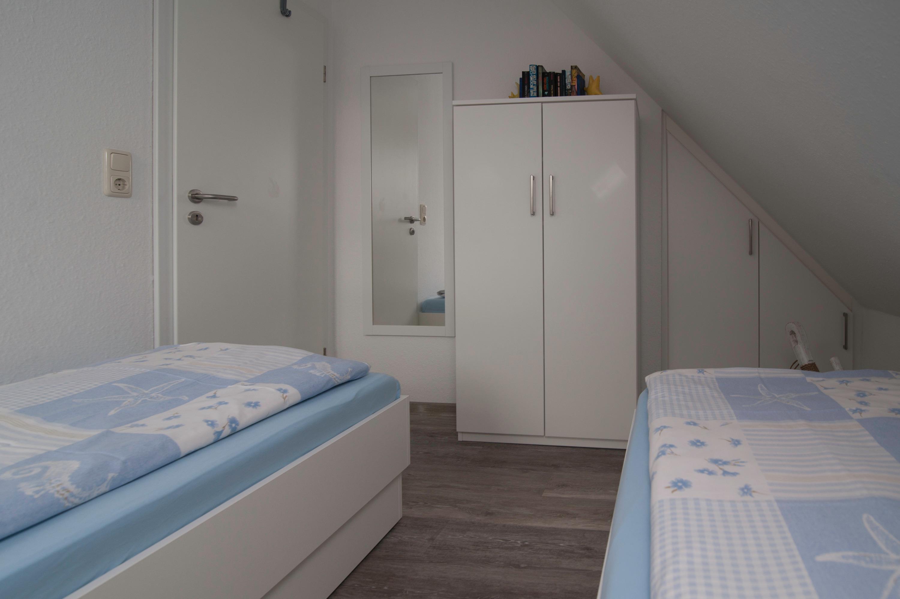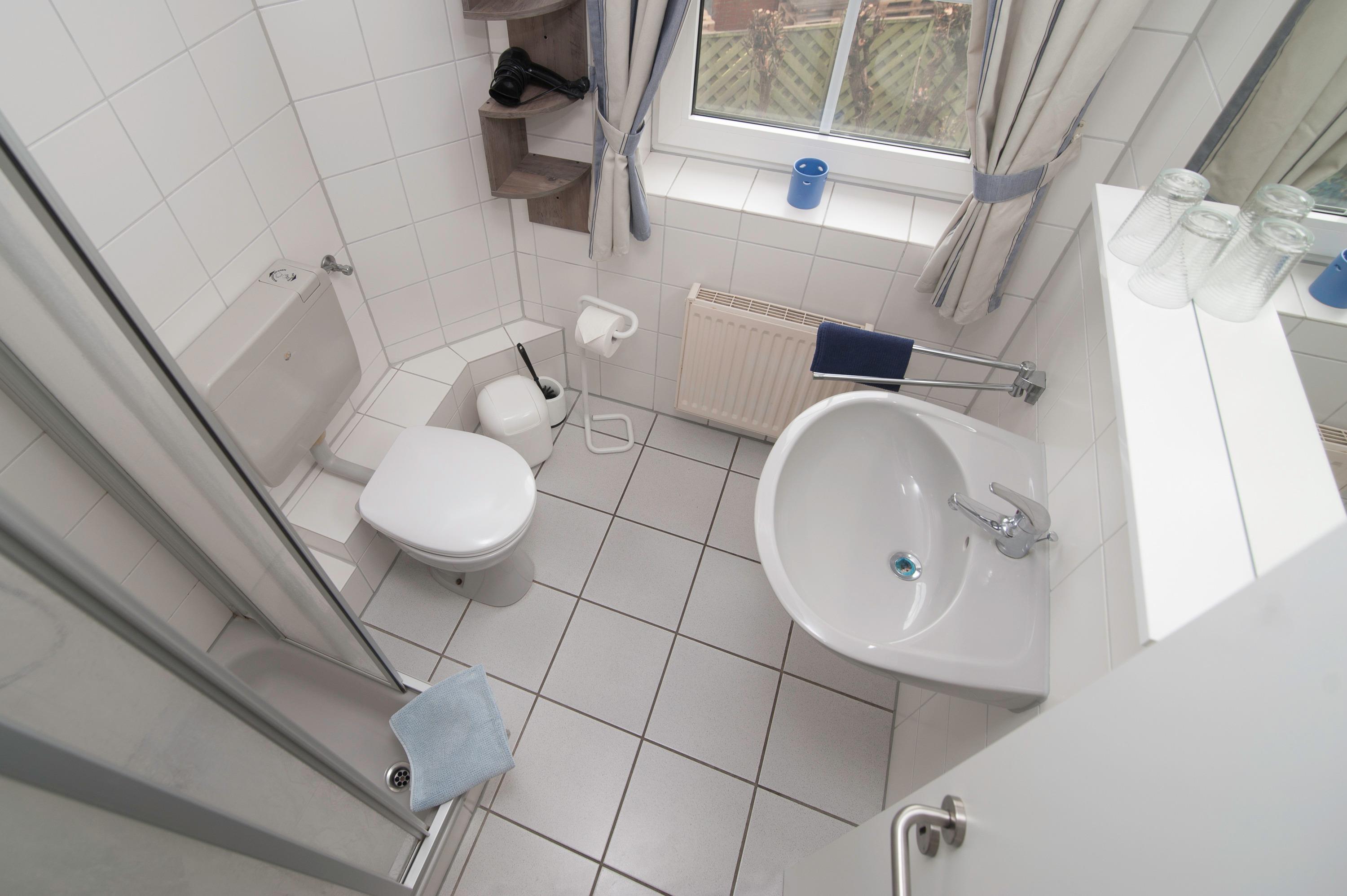 Badezimmer mit Dusche, Waschbecken und WC im Obergeschoss, sowie ein Schlafzimmer mit Doppelbett[nbsp] (2 x 90 x 200cm) und ein Schlafzimmer mit zwei Einzelbetten (90 x 200cm), alle Betten im Haus verfügen über verstellbare Lattenroste