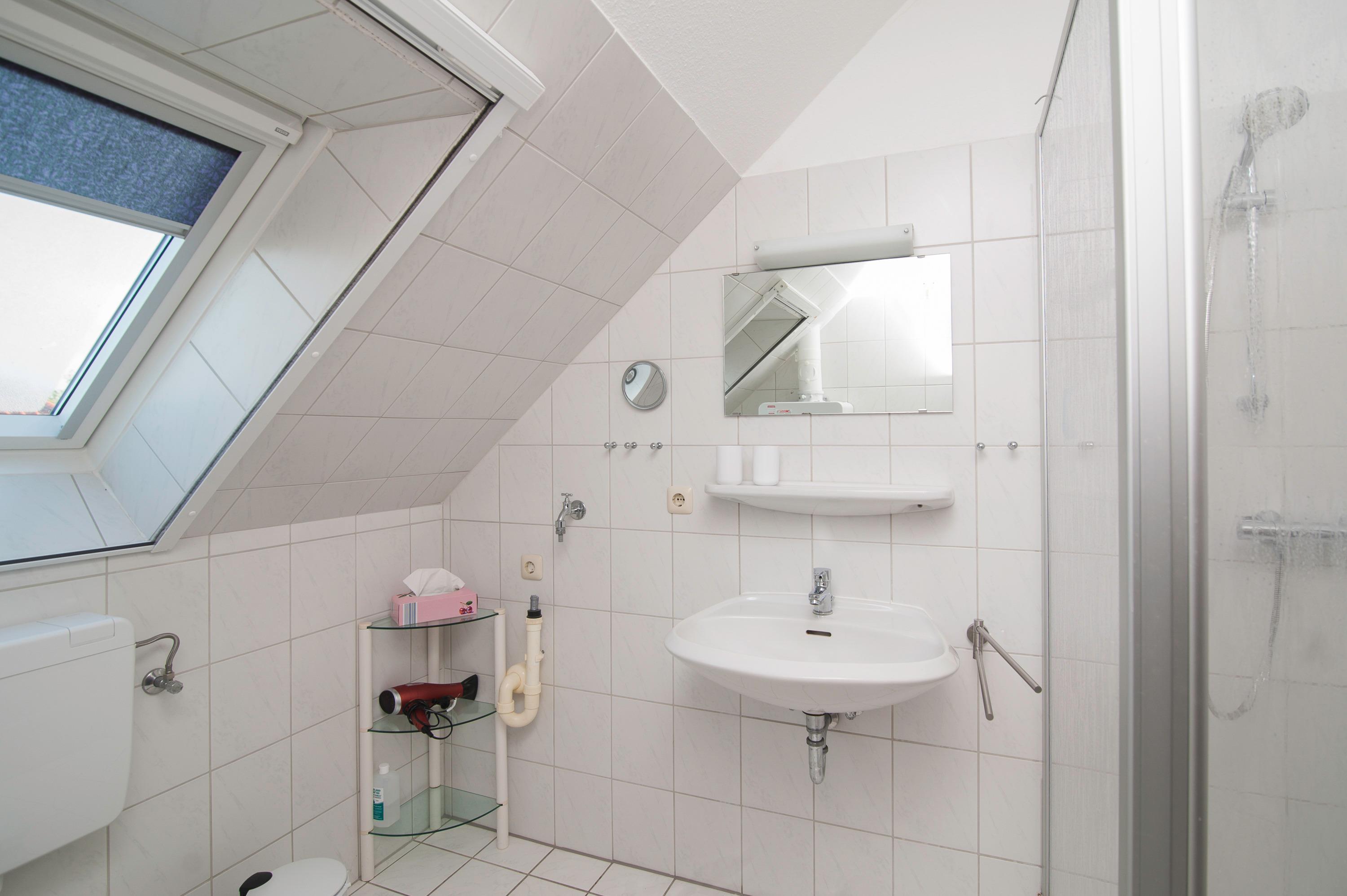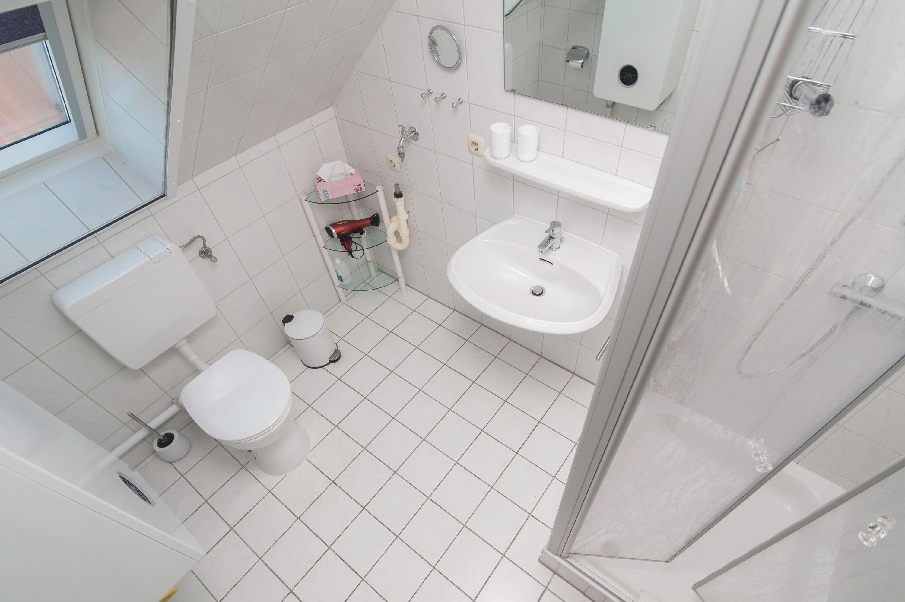 1 Badezimmer mit Dusche, Waschbecken, WC und Föhn.