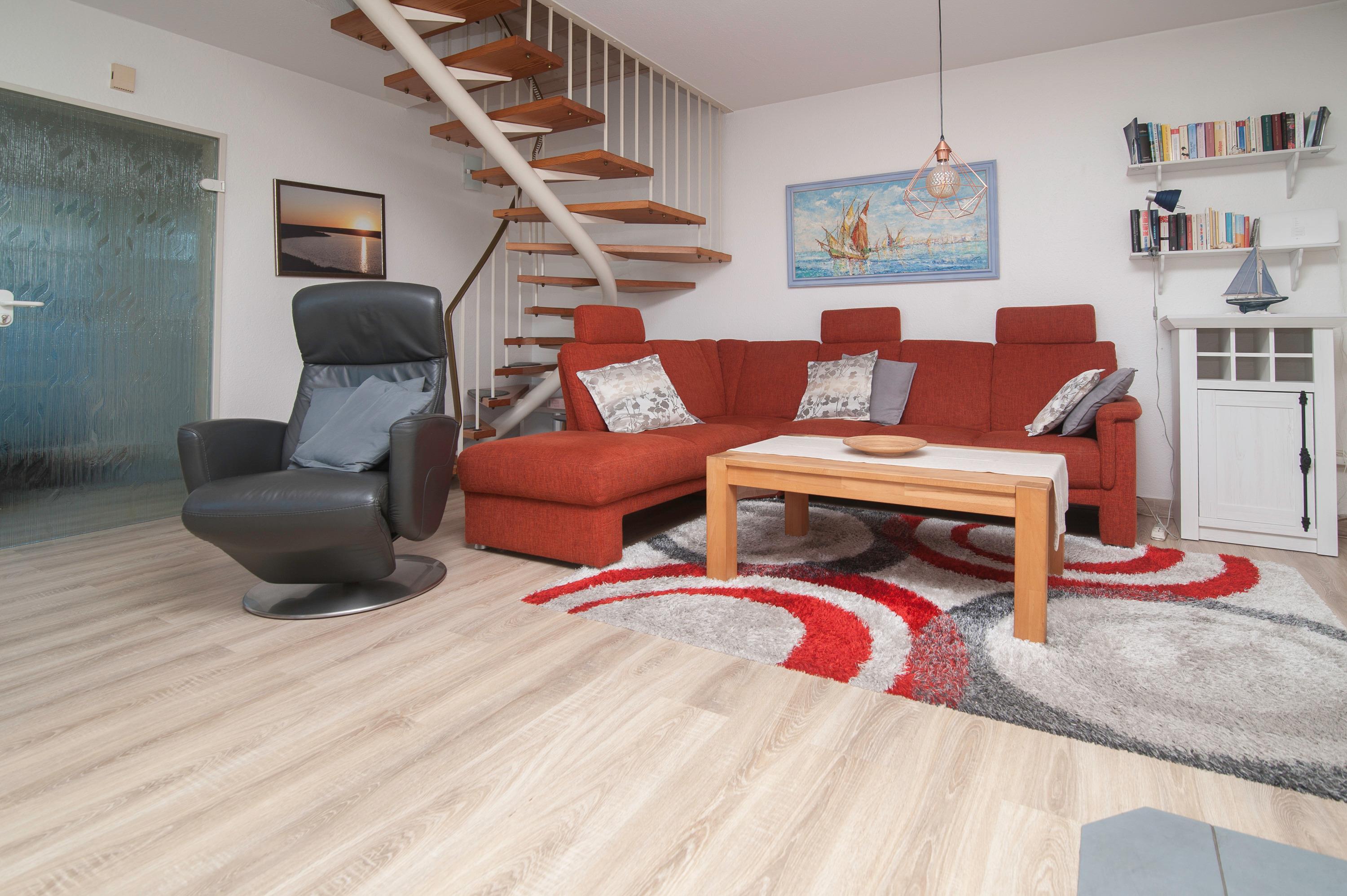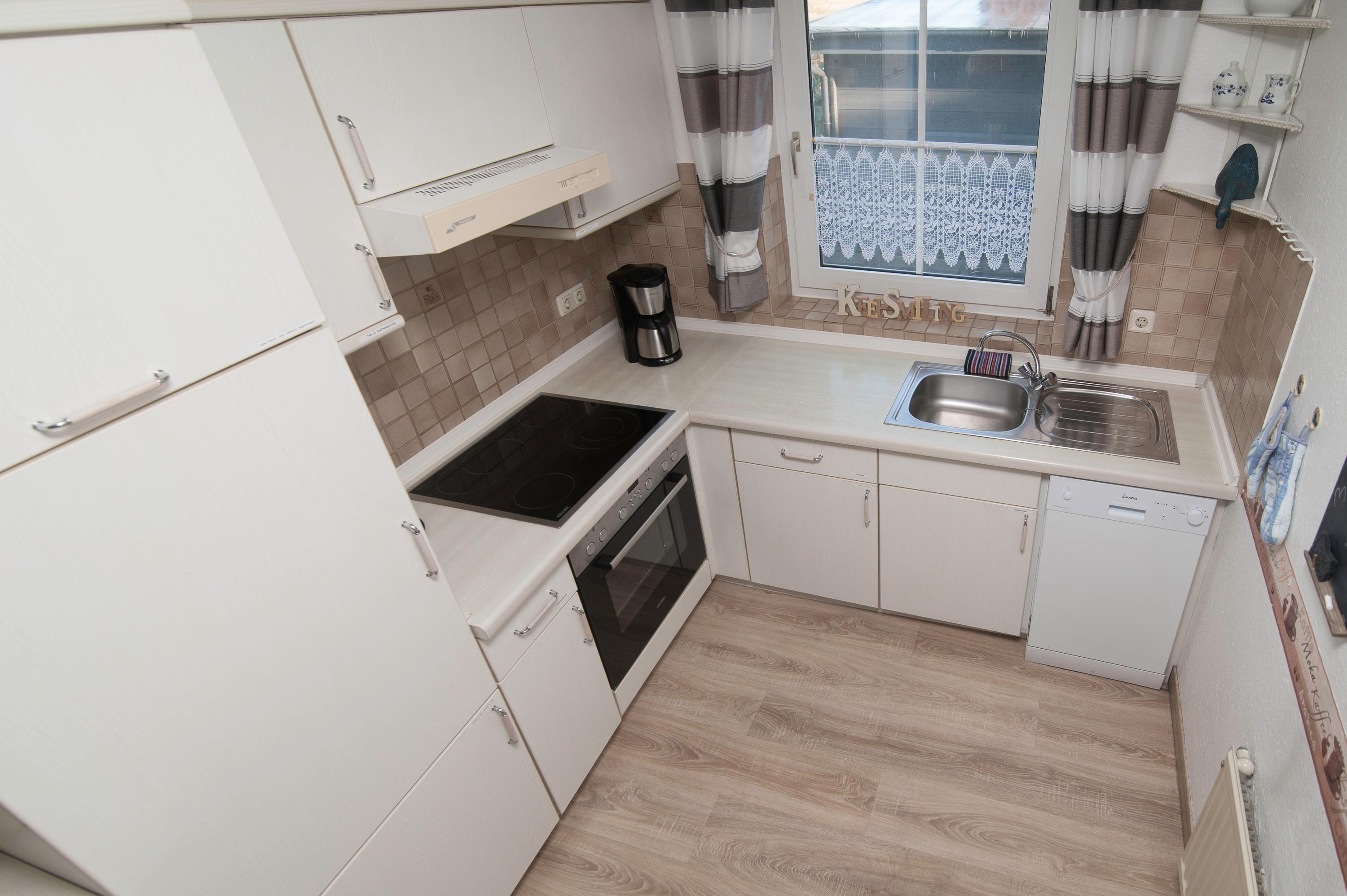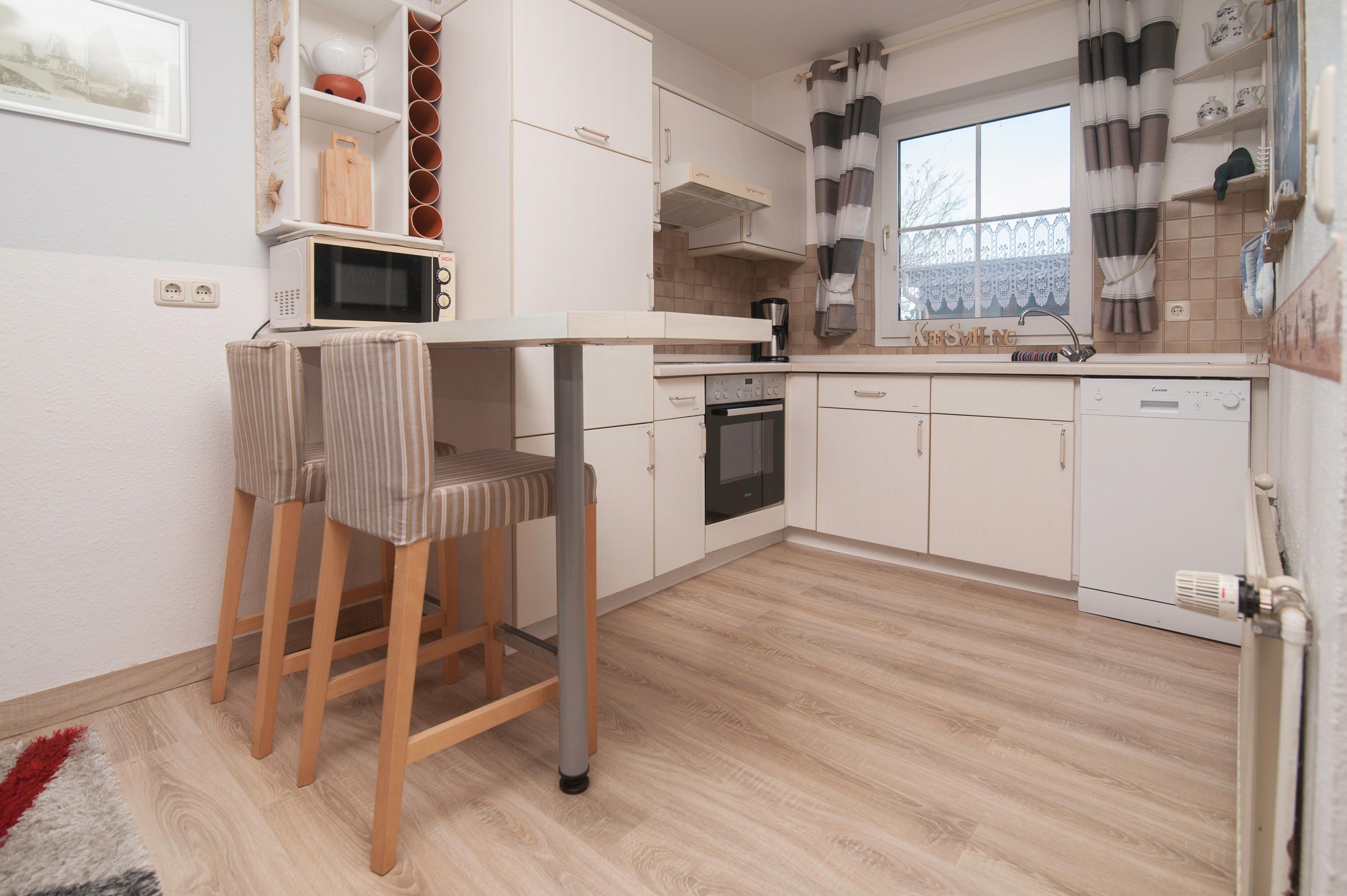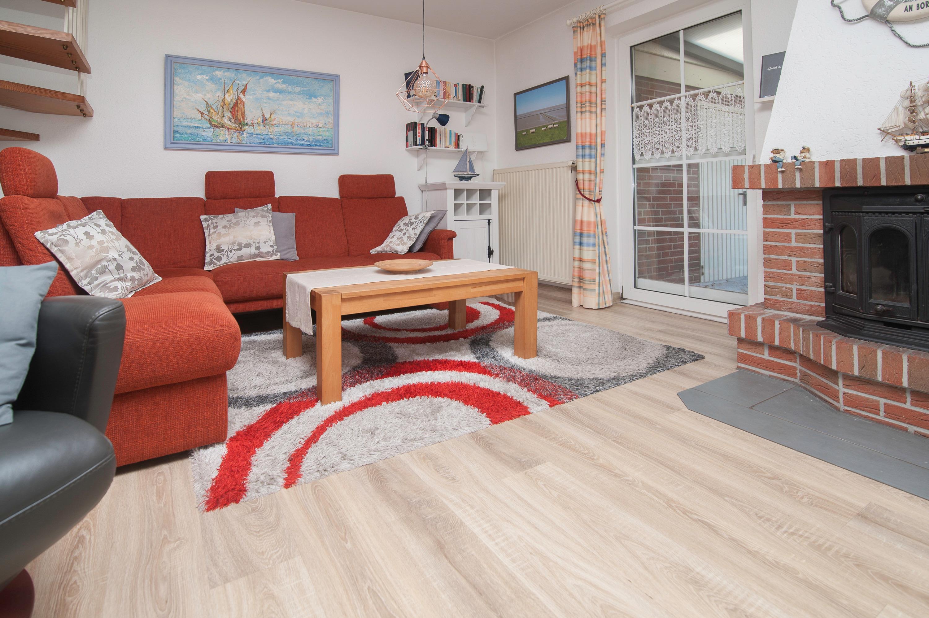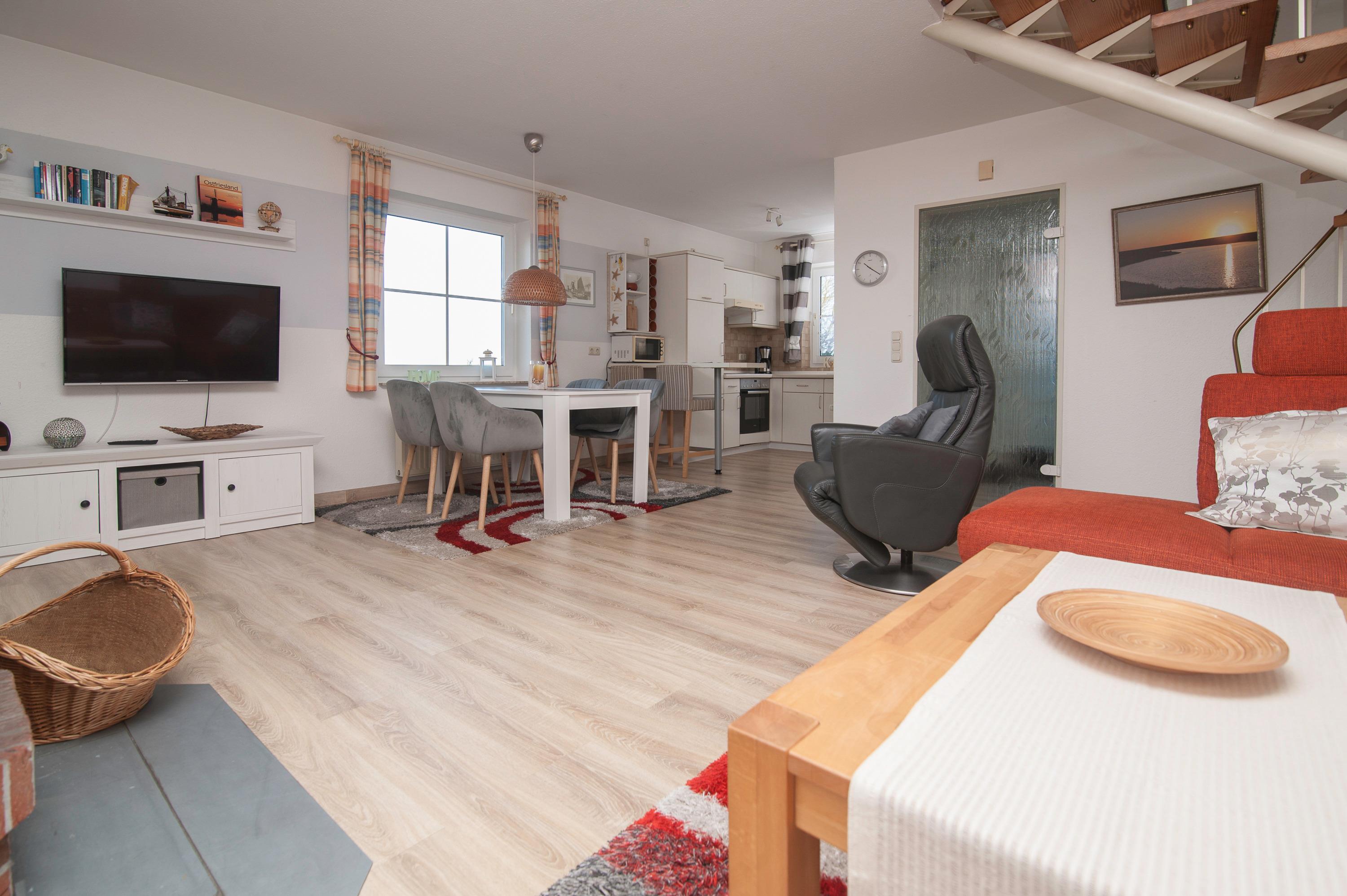 Geschmackvoll gestalteter Wohnraum mit 43" Grundig HD LCD TV , Sitzgruppe und einem bequemen Relax-Sessel, Essplatz für 4 Personen, ein DSL WLAN-Gastzugang ist vorhanden. Ein Kamin sorgt in der kalten Jahreszeit für gemütliche Stunden im Kreis Ihrer Lieben. Die offen gestaltete Einbauküche ist komplett ausgestattet: Herd mit Cerankochfeld, Dunstabzugshaube, Mikrowelle, Geschirrspüler, Kühlschrank mit Gefrierfach, Filterkaffeemaschine, Toaster und vielem mehr.