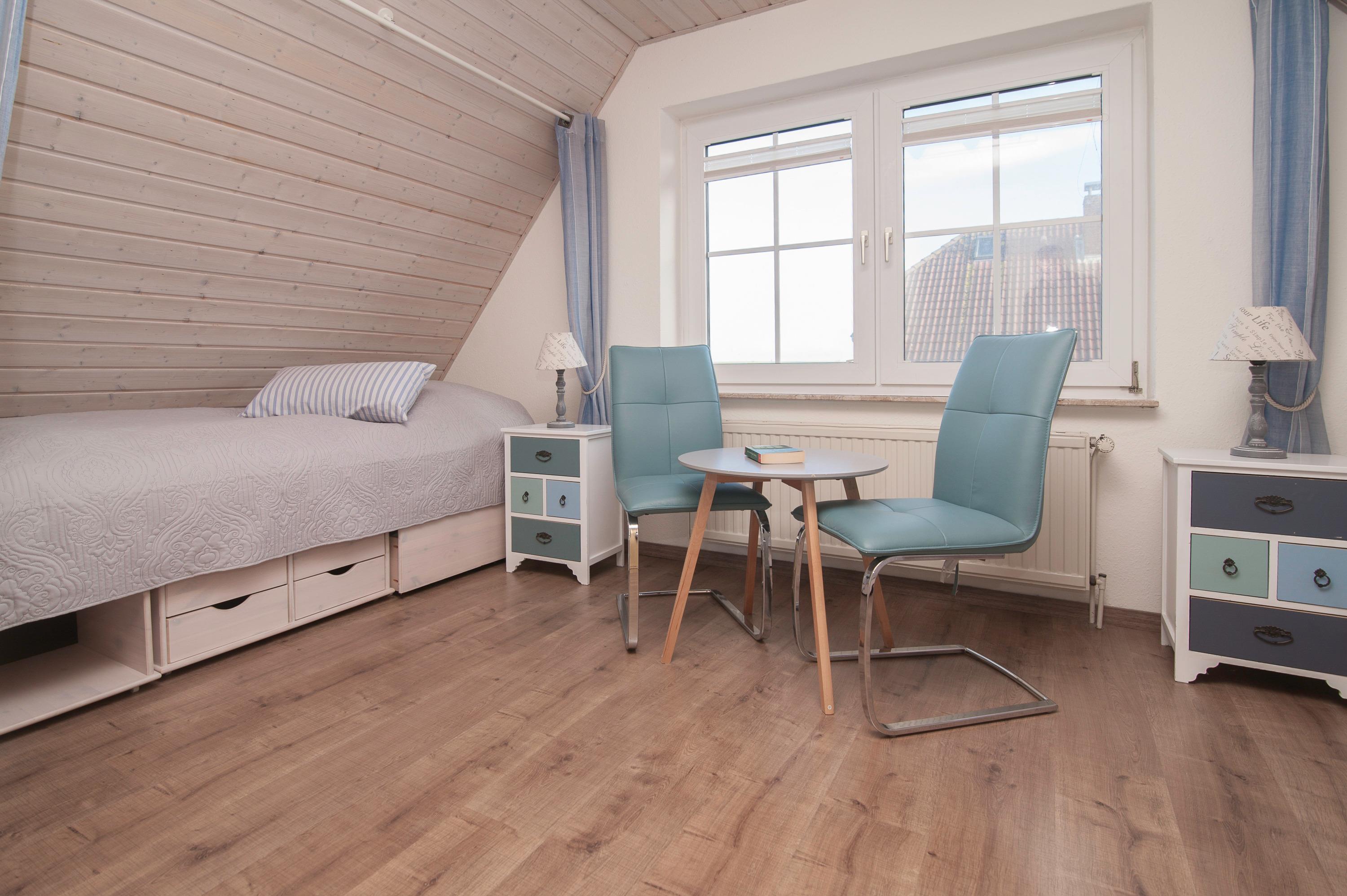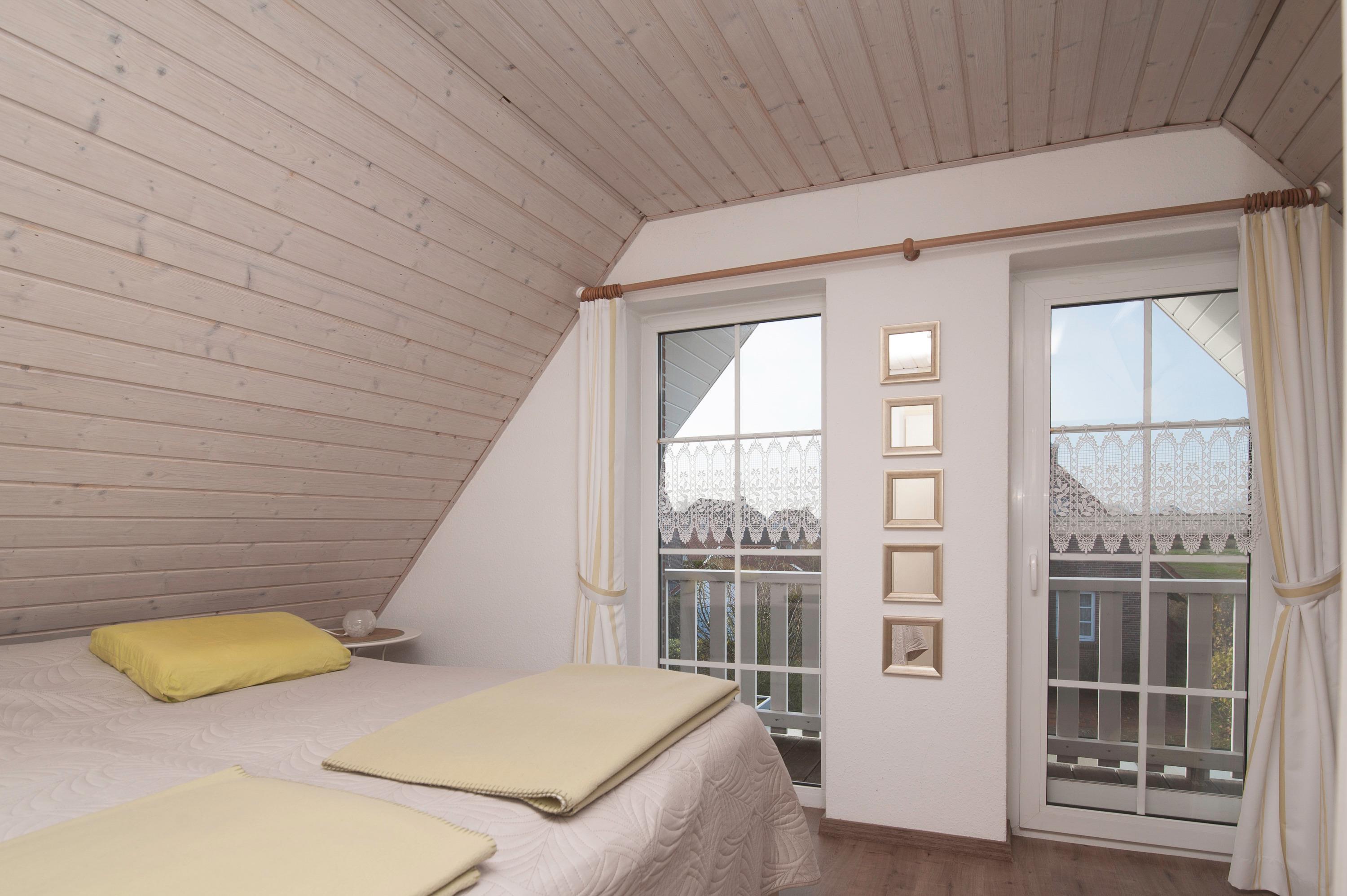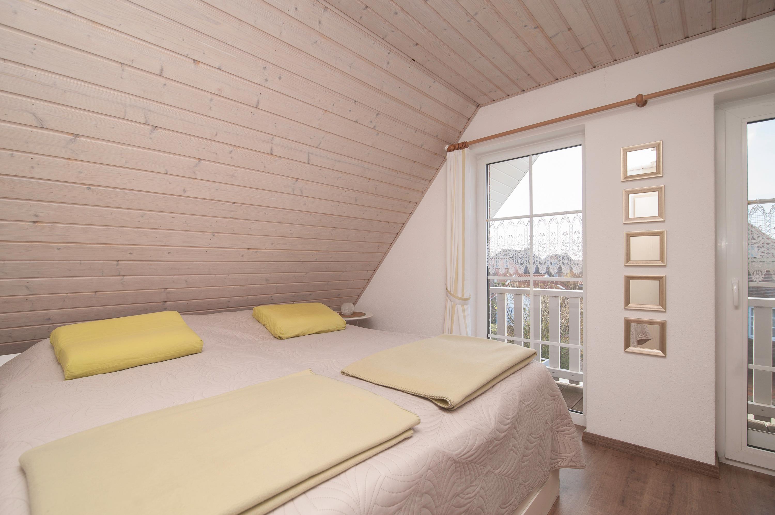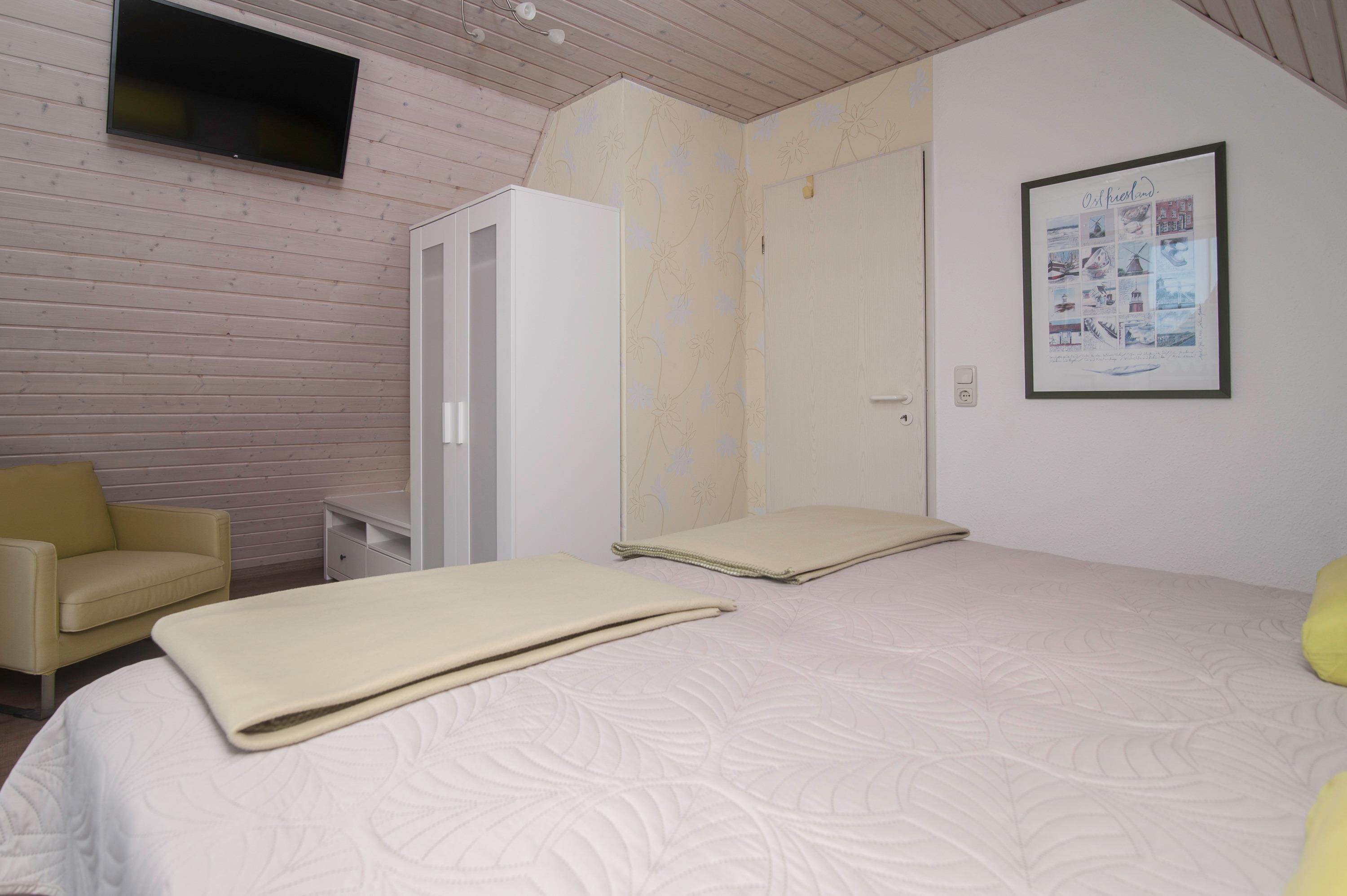 Im Obergeschoss erwarten Sie zwei liebevoll eingerichtete Schlafzimmer. Ein Schlafzimmer mit Doppelbett (Bodyguard Matratzen 90 x 200 cm mit Topper) und 32"JTC LED HD-TV und ein weiteres Schlafzimmer mit zwei Einzelbetten (90 x 200 cm). Das Badezimmer mit Dusche, Waschbecken und WC ist ebenfalls Obergeschoss.