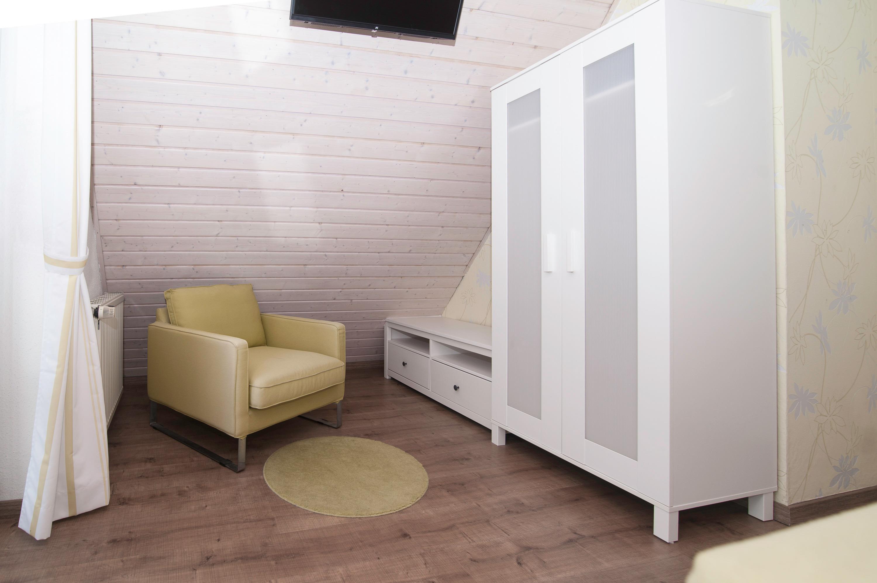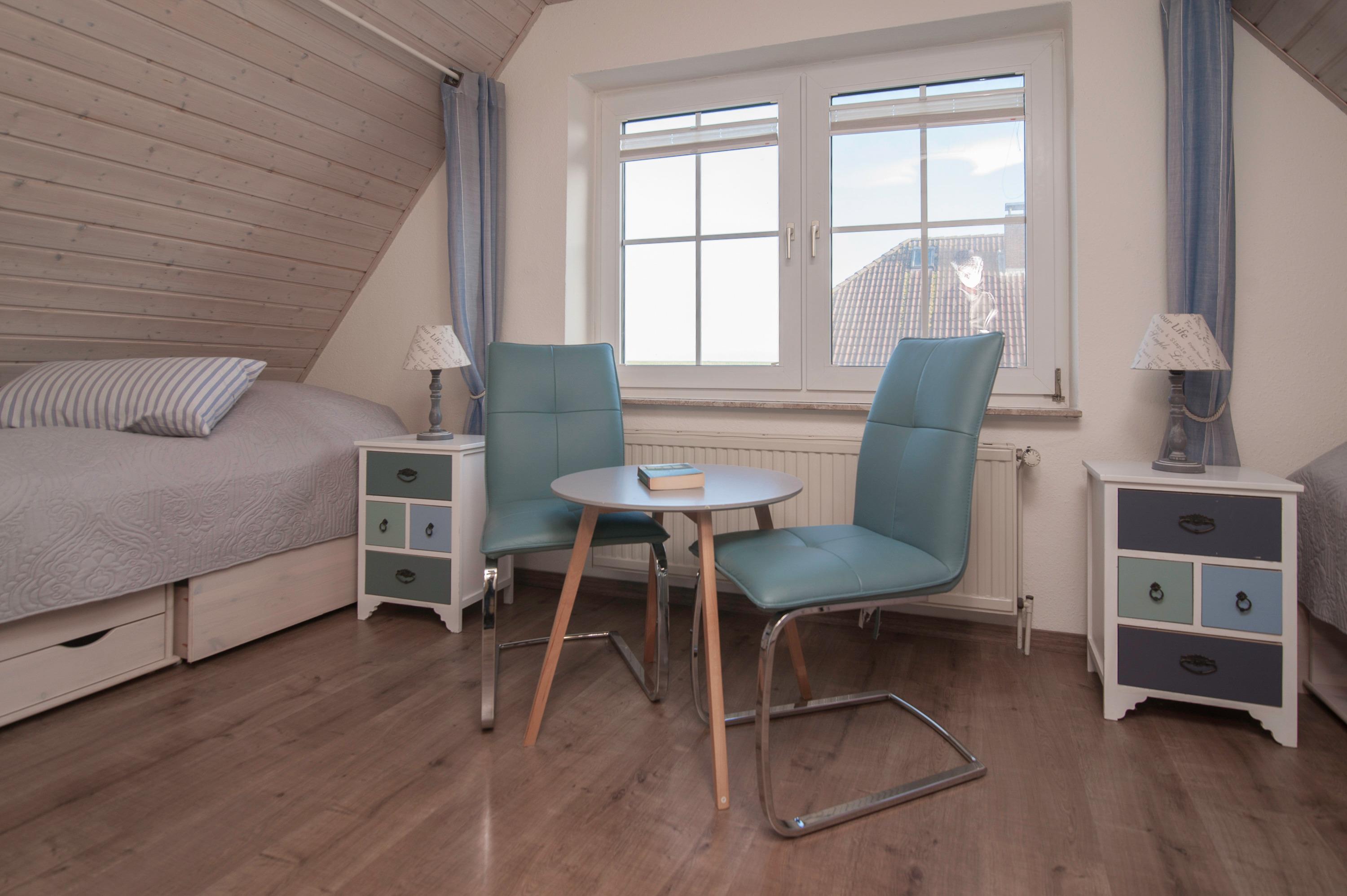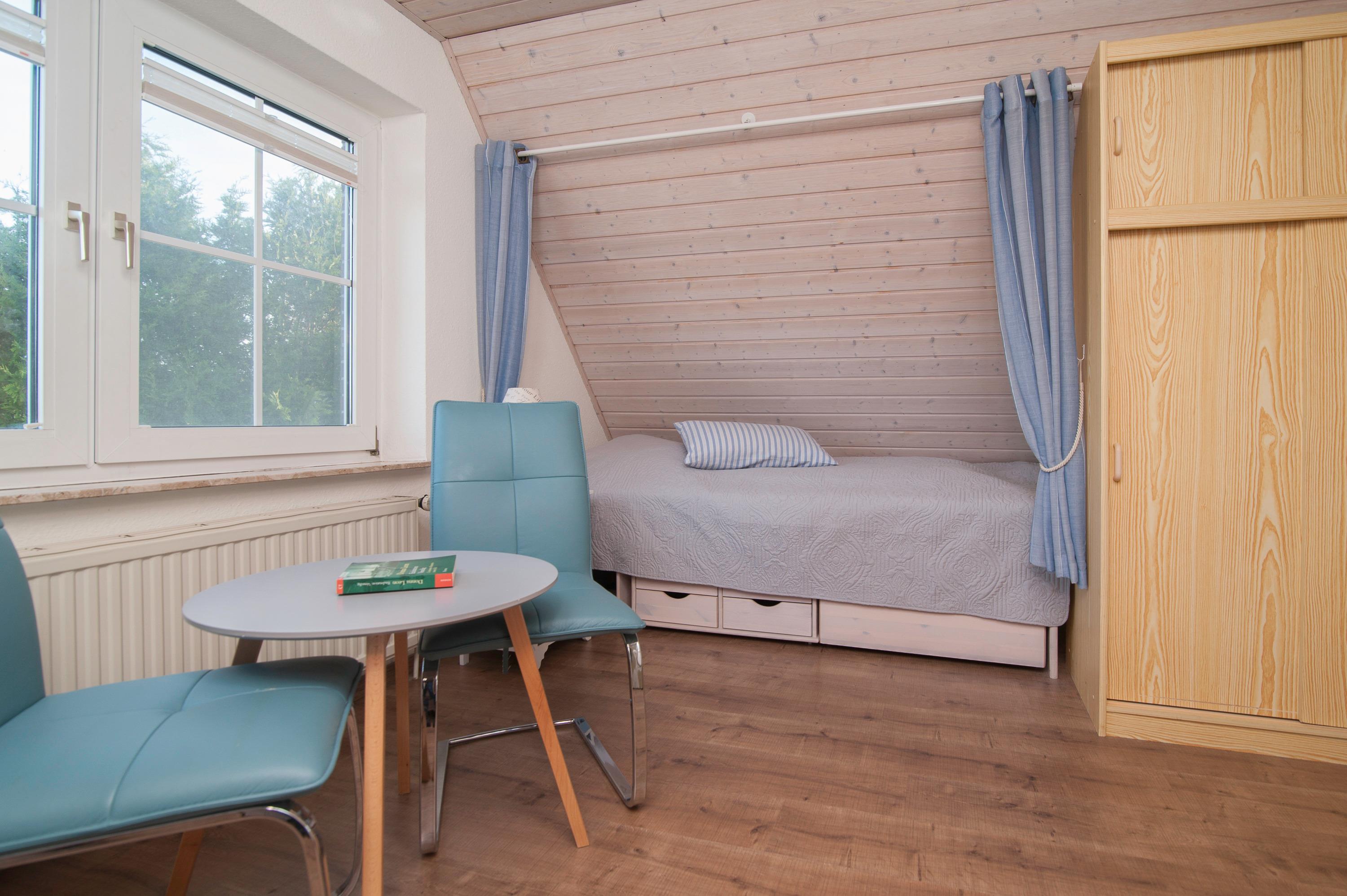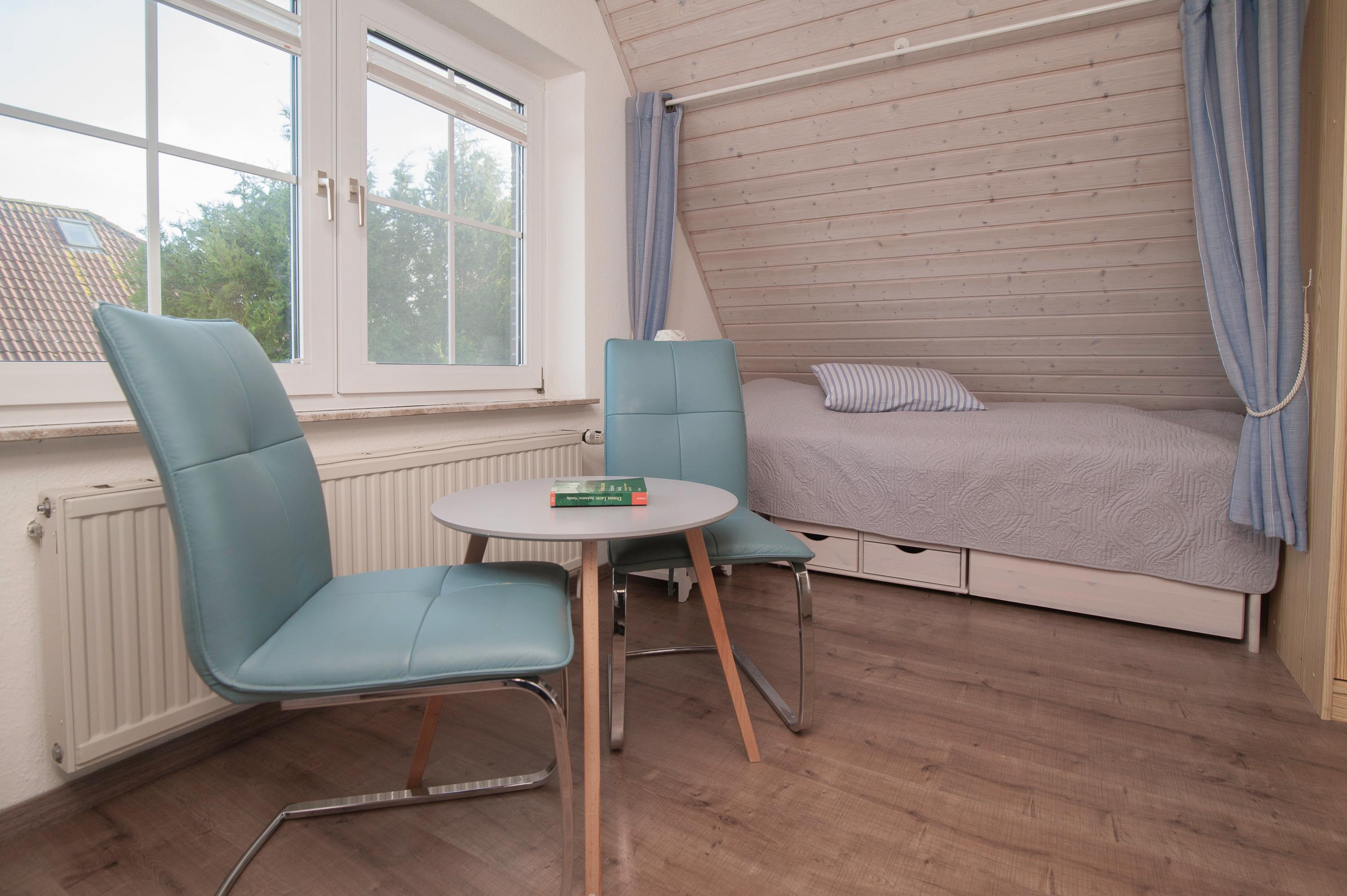 Im Obergeschoss erwarten Sie zwei liebevoll eingerichtete Schlafzimmer. Ein Schlafzimmer mit Doppelbett (Bodyguard Matratzen 90 x 200 cm mit Topper) und 32"JTC LED HD-TV und ein weiteres Schlafzimmer mit zwei Einzelbetten (90 x 200 cm). Das Badezimmer mit Dusche, Waschbecken und WC ist ebenfalls Obergeschoss.