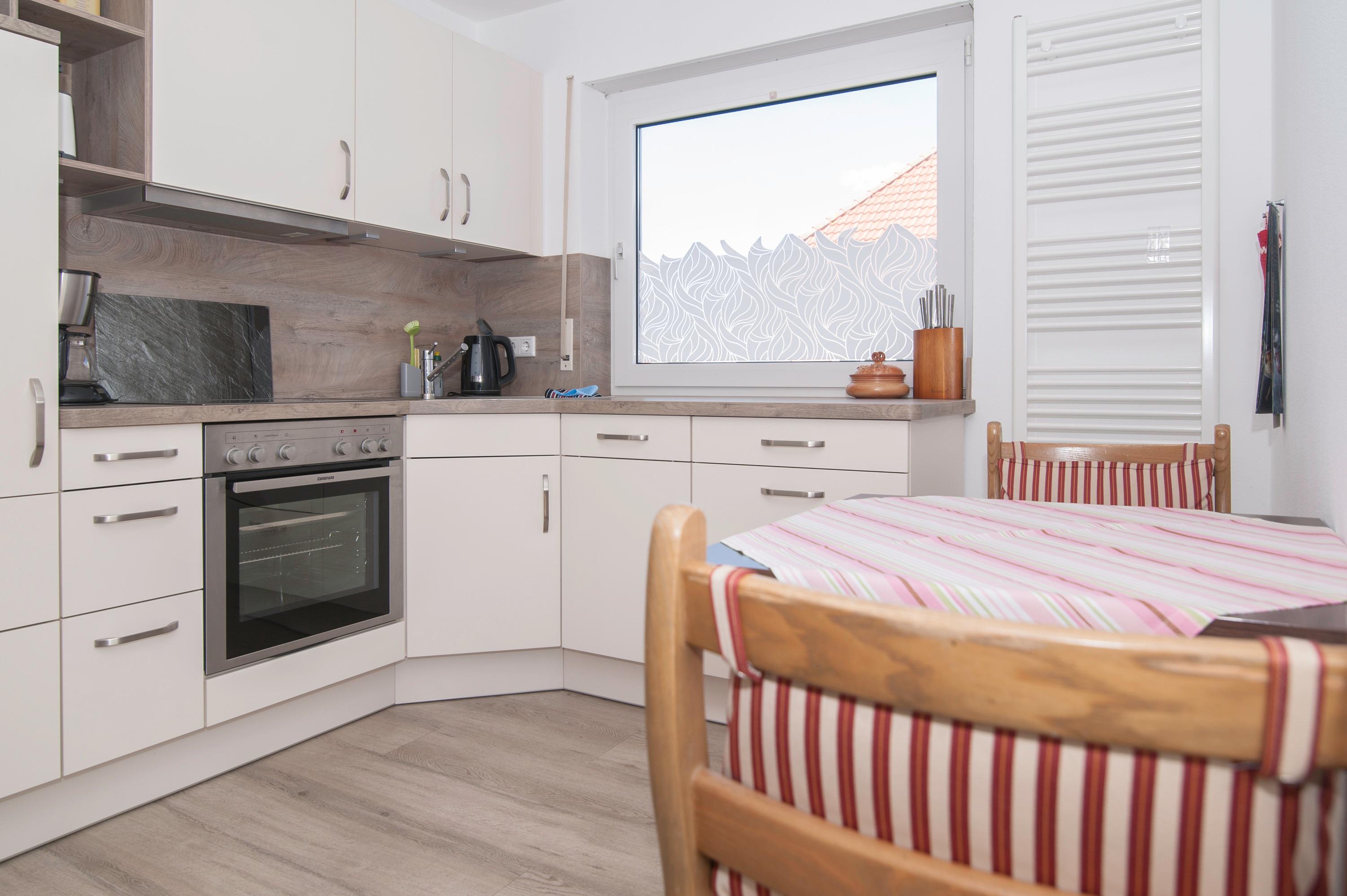Die separate, voll ausgestattete Küche, Herd mit Cerankochfeld, Dunstabzugshaube, Mikrowelle, Geschirrspüler, ein Kühlschrank mit Gefrierfach, Filterkaffeemaschine, Handrührgerät, Toaster, Eierkocher, Koch- und Essgeschirr. Von der Küche haben Sie Zugang zur Terrasse.