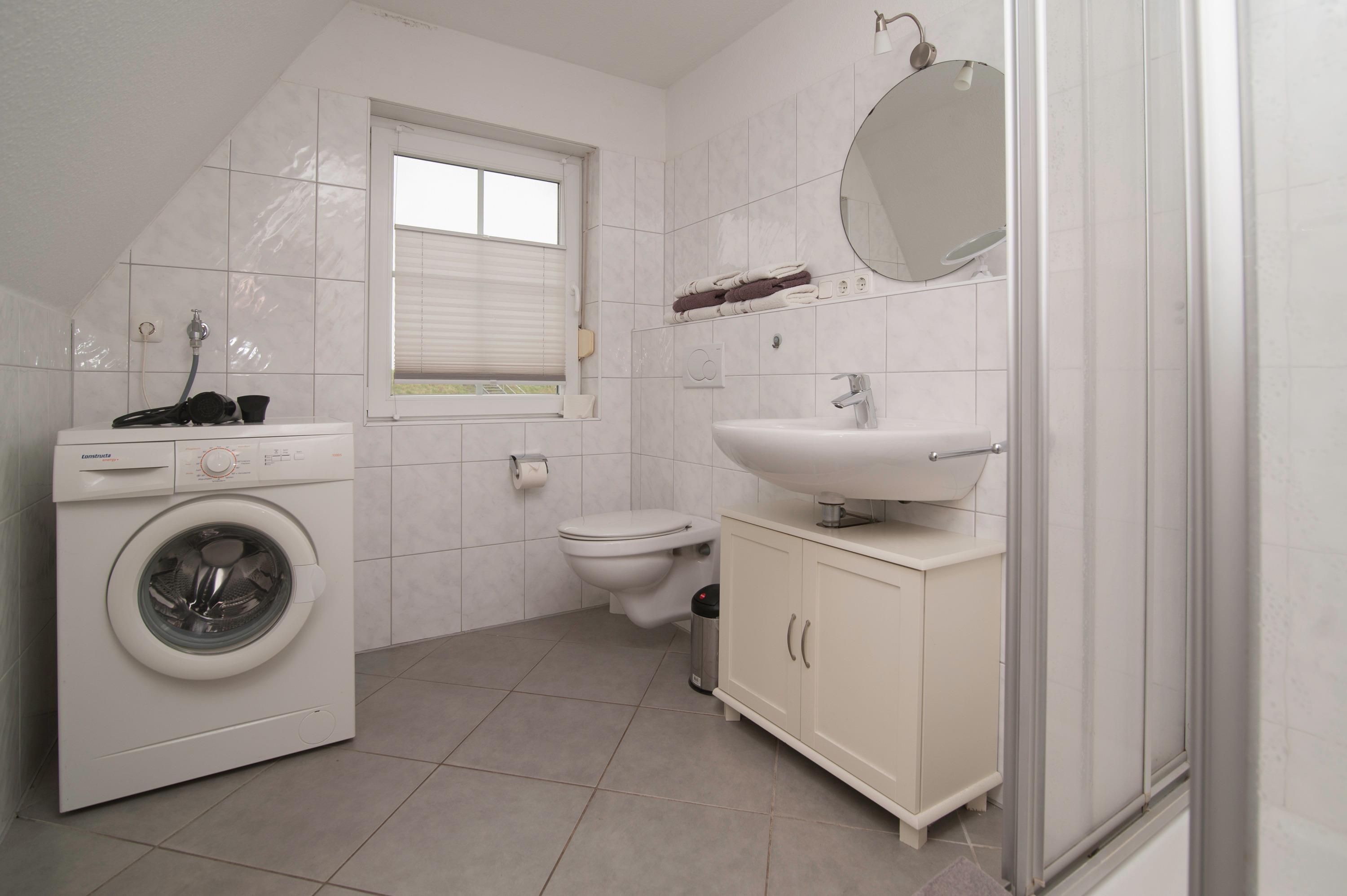 Badezimmer mit Dusche, Waschbecken, WC, Waschmaschine (5kg) und Föhn im Obergeschoß, Schlafraum mit einem Doppelbett (2 x 100 x 200 cm) und Kinderreisebett im Obergeschoß dort befindet sich auch das zweite Schlafraum mit zwei Einzelbetten (90 x 200 cm)