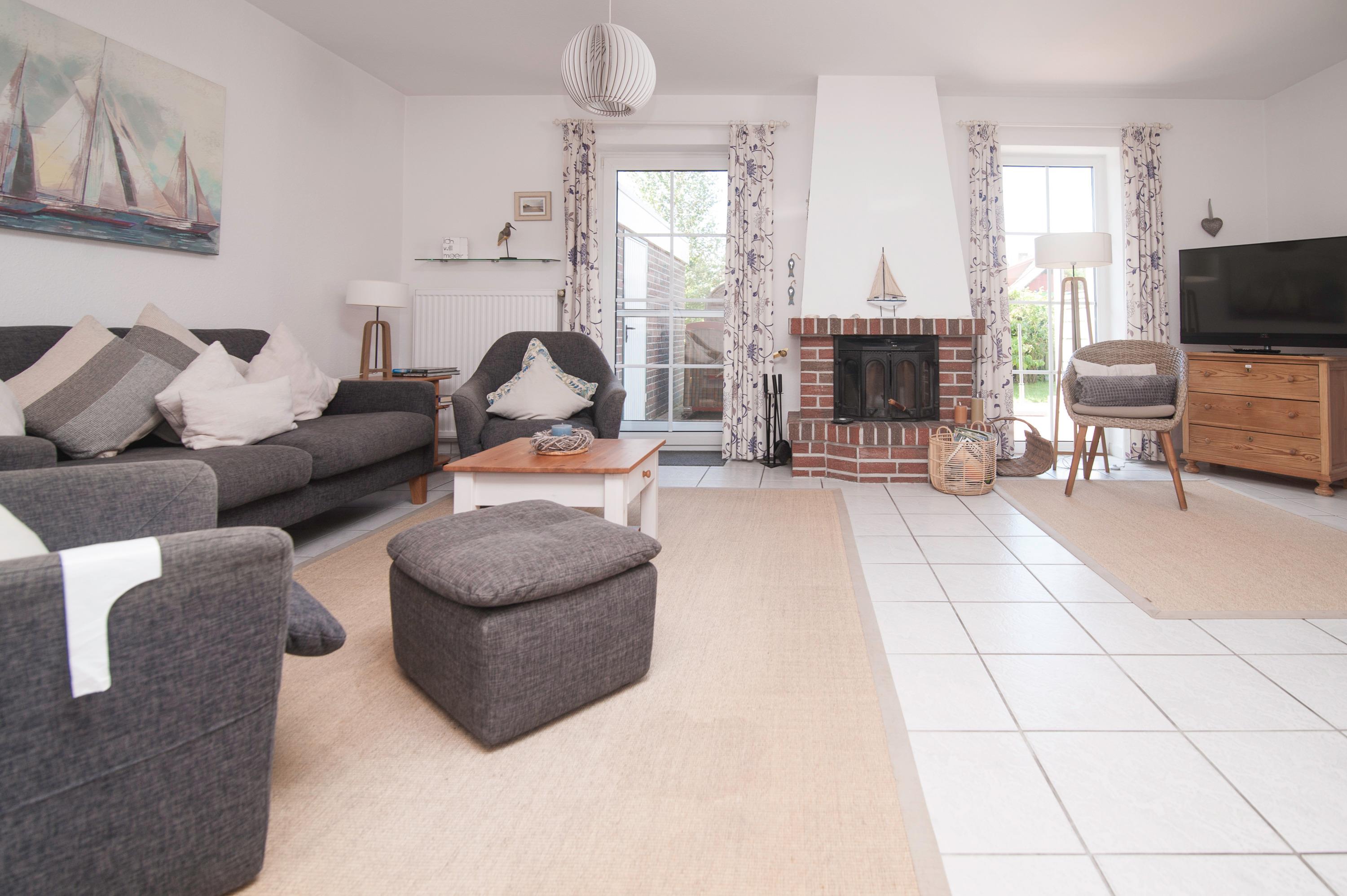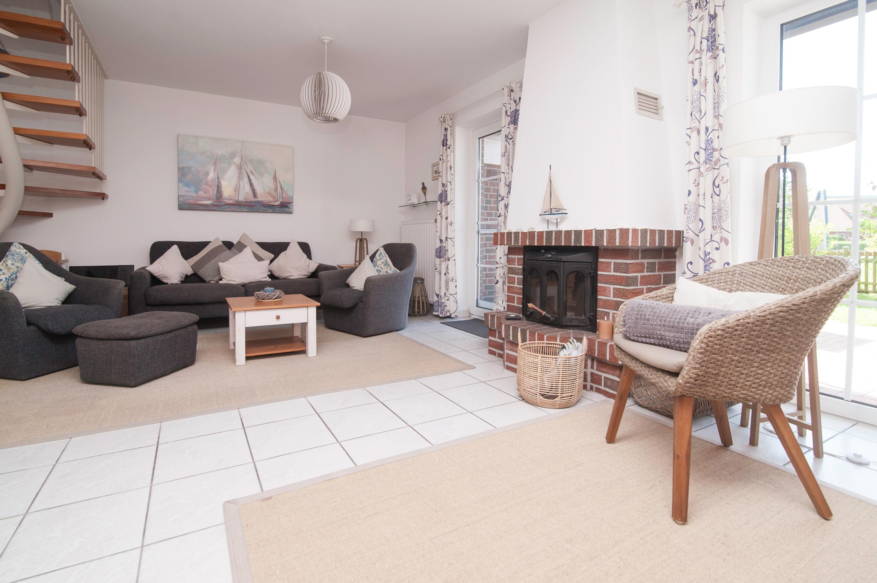 Schöner Wohnraum mit Kamin, 43"Metz FullHD LED-TV , Sitzgruppe, Stereoanlage, Essplatz, für 4 Personen, ein DSL WLAN-Gastzugang ist vorhanden.