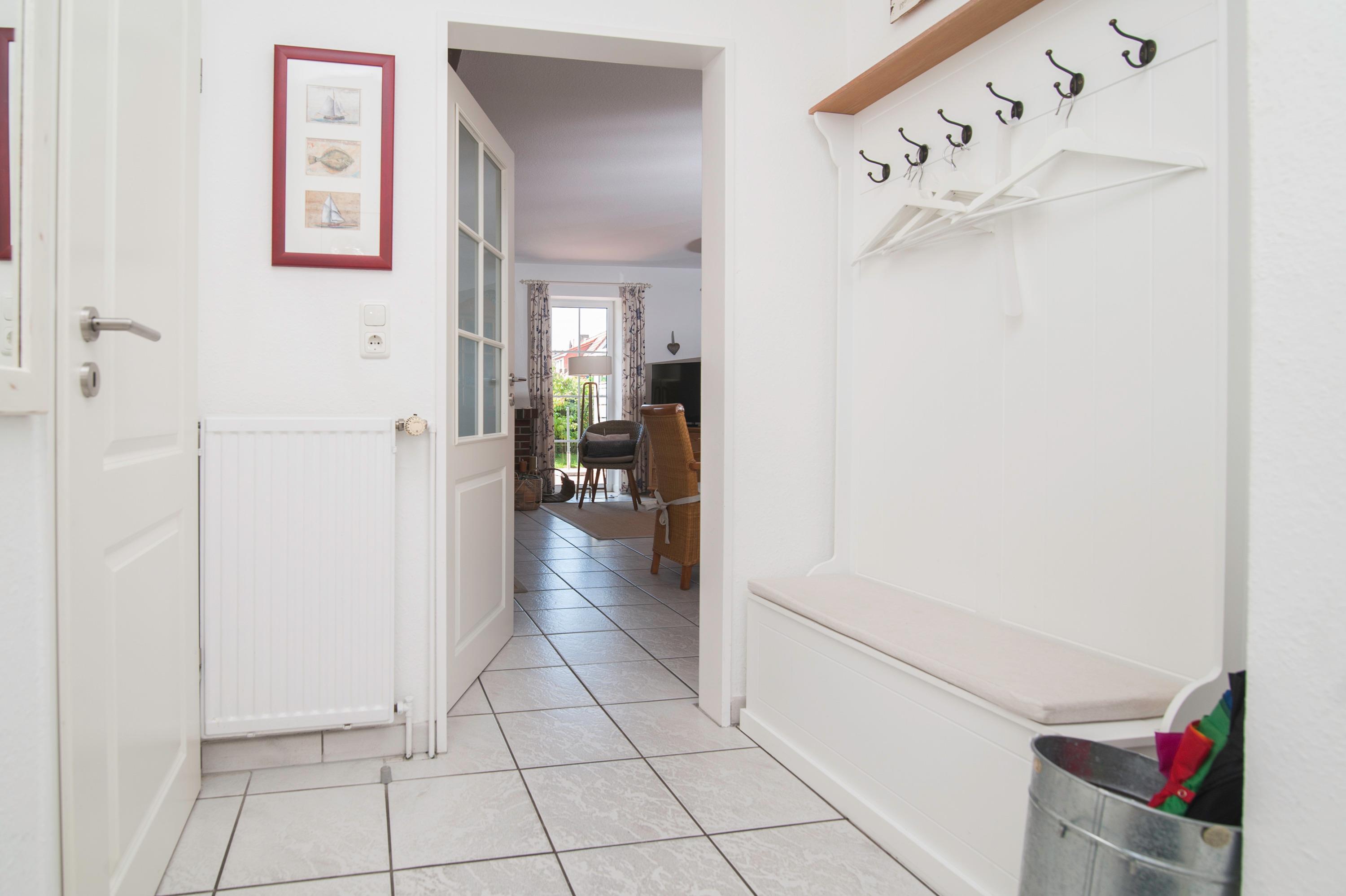 Die Terrasse und der kleine Garten, in Südwestlage, hinter dem Haus - ausgestattet mit Gartenmöbeln, Windschutz und einem Strandkorb - laden zum Verweilen ein. Eine Außensteckdose ist vorhanden.