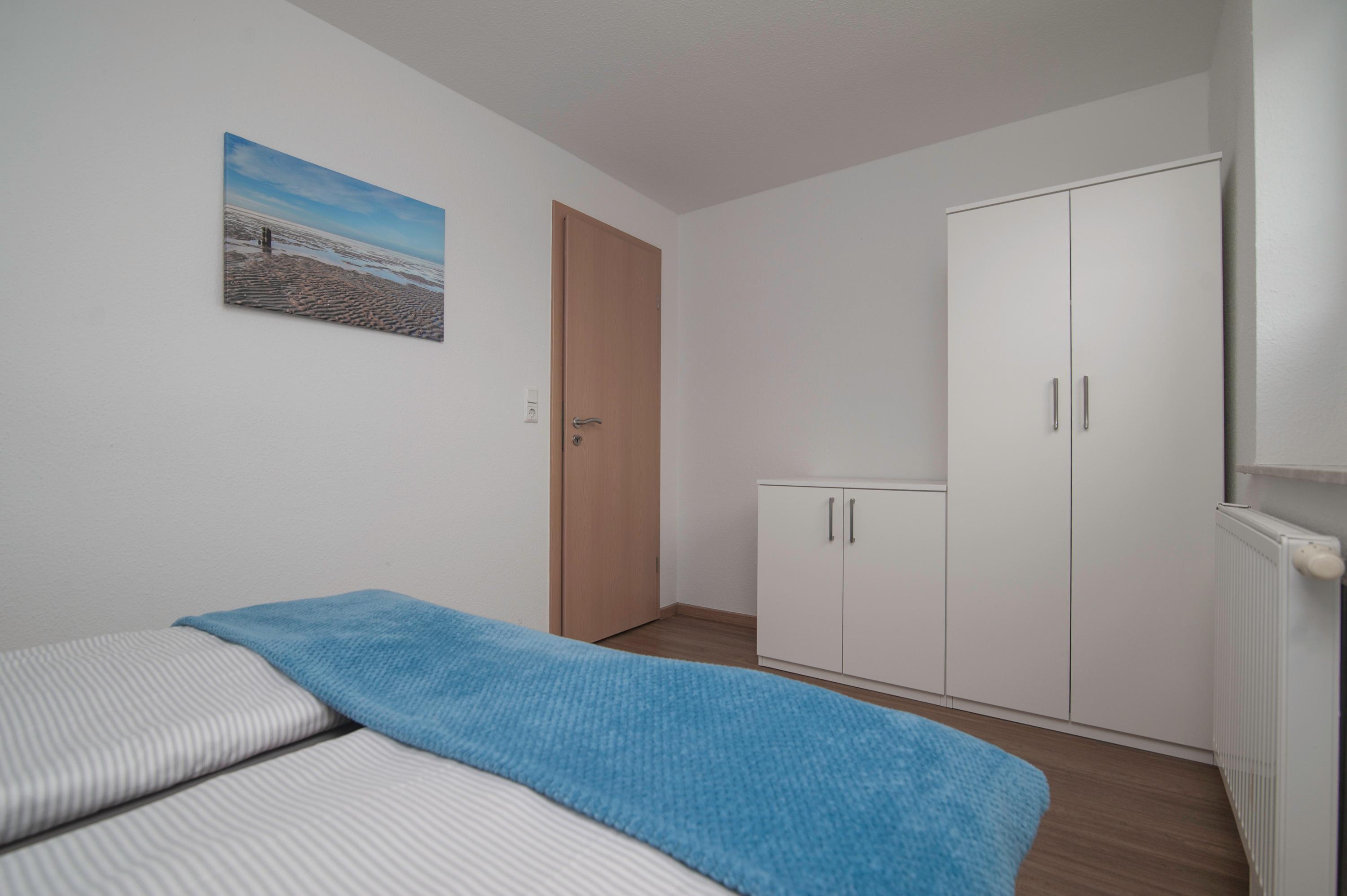 3 Schlafzimmer im Obergeschoß: 1 Schlafzimmer mit Doppelbett (1,60 mx 2,00 m), 1 Schlafzimmer mit 2 einzelnen Betten[nbsp] (0,80 x 2,00m) und 1 Schlafzimmer mit einem Einzelbett. in der Größe. Der Fußboden ist mit Vinyllaminat ausgestattet. Das Badezimmer mit WC, Badewanne und Dusche sowie Waschmaschine sind ebenfalls im Obergeschoß. Bügelbrett und Bügeleisen und ein Wäscheständer stehen ebenfalls zur Verfügung.