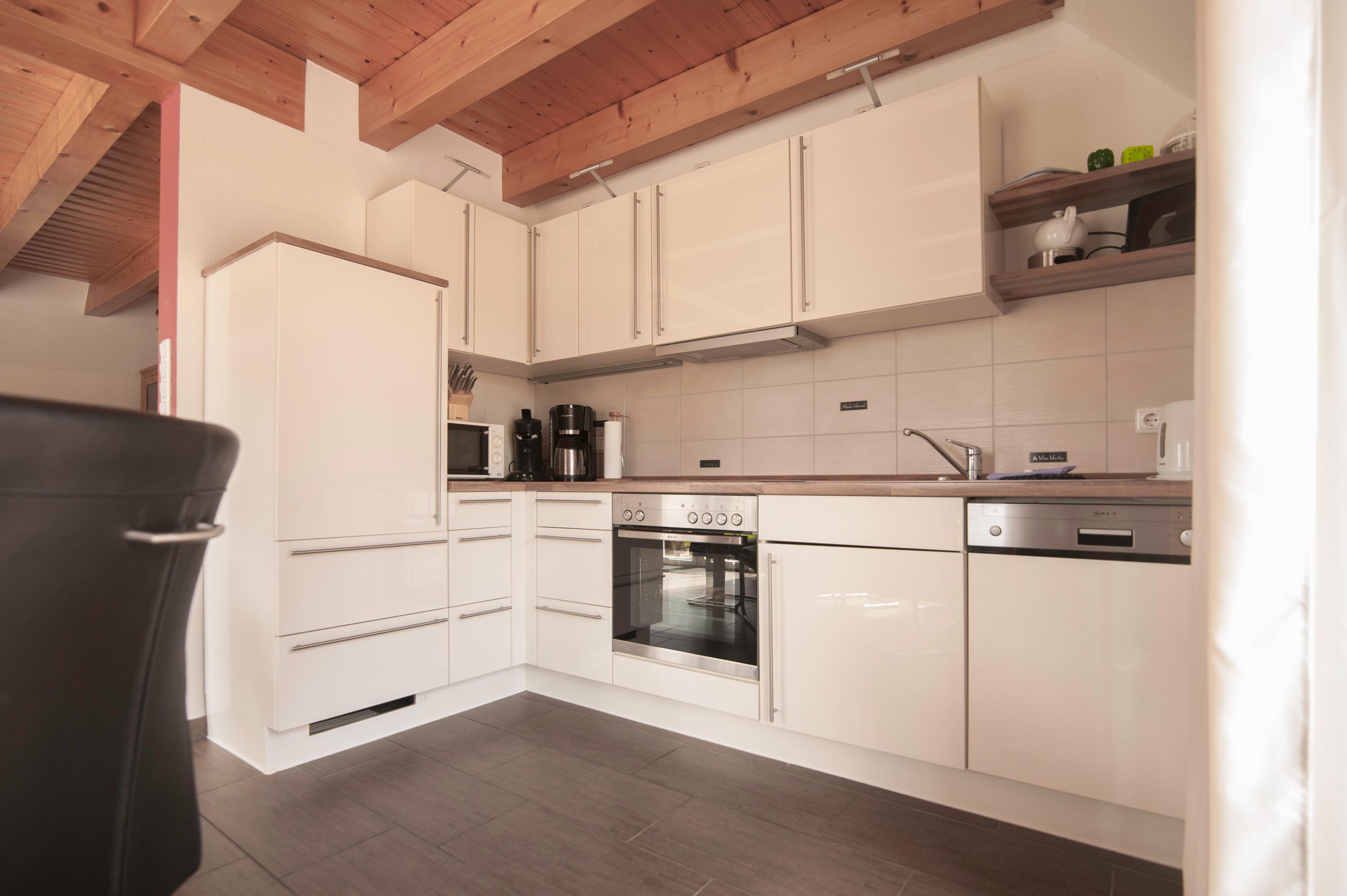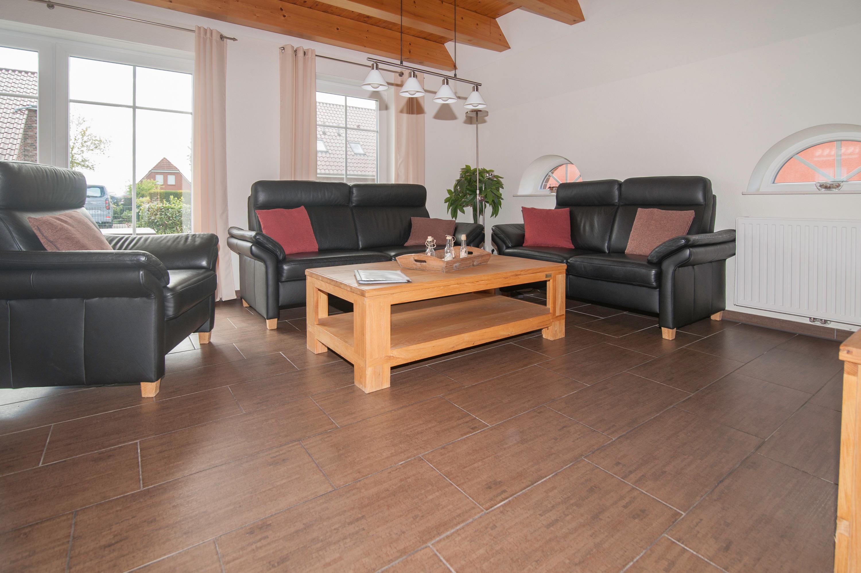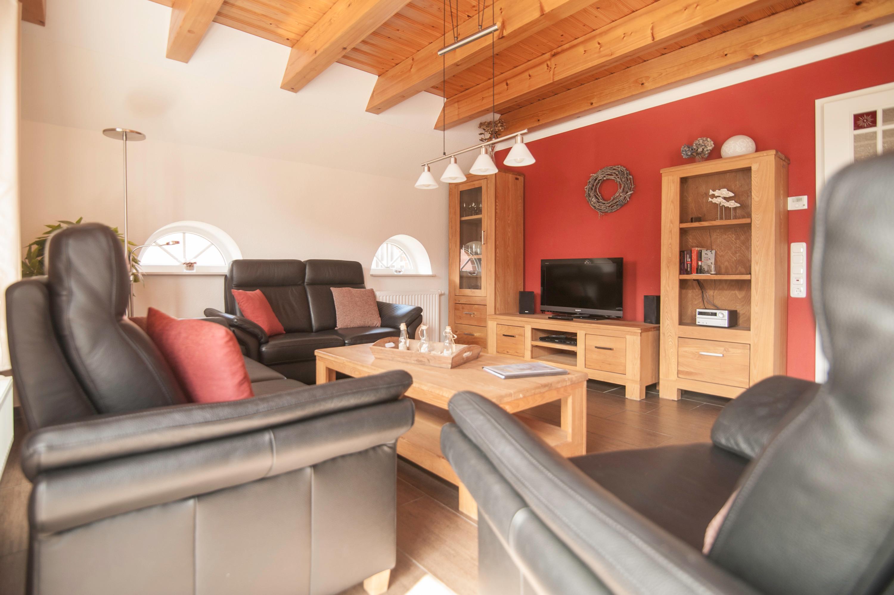 Der großzügige Wohnraum mit einer Ledersitzgruppe, einem 32"Sony Full HD LCD-TV und DVD/CD-Player lädt zu entspannten Stunden ein. Die offene Einbauküche ist komplett ausgestattet mit Herd mit Cerankochfeld, Mikrowelle mit Grill, Dunstabzug, Geschirrspüler, Kühlschrank mit Gefrierfach, Filterkaffee- und Kaffeepadmaschine und vielem mehr. Der Essbereich mit 6 Stühlen bietet ausreichend Platz für gemeinsame Mahlzeiten und spannende Spieleabende. Ein Glasfaser WLAN-Gastzugang ist vorhanden.