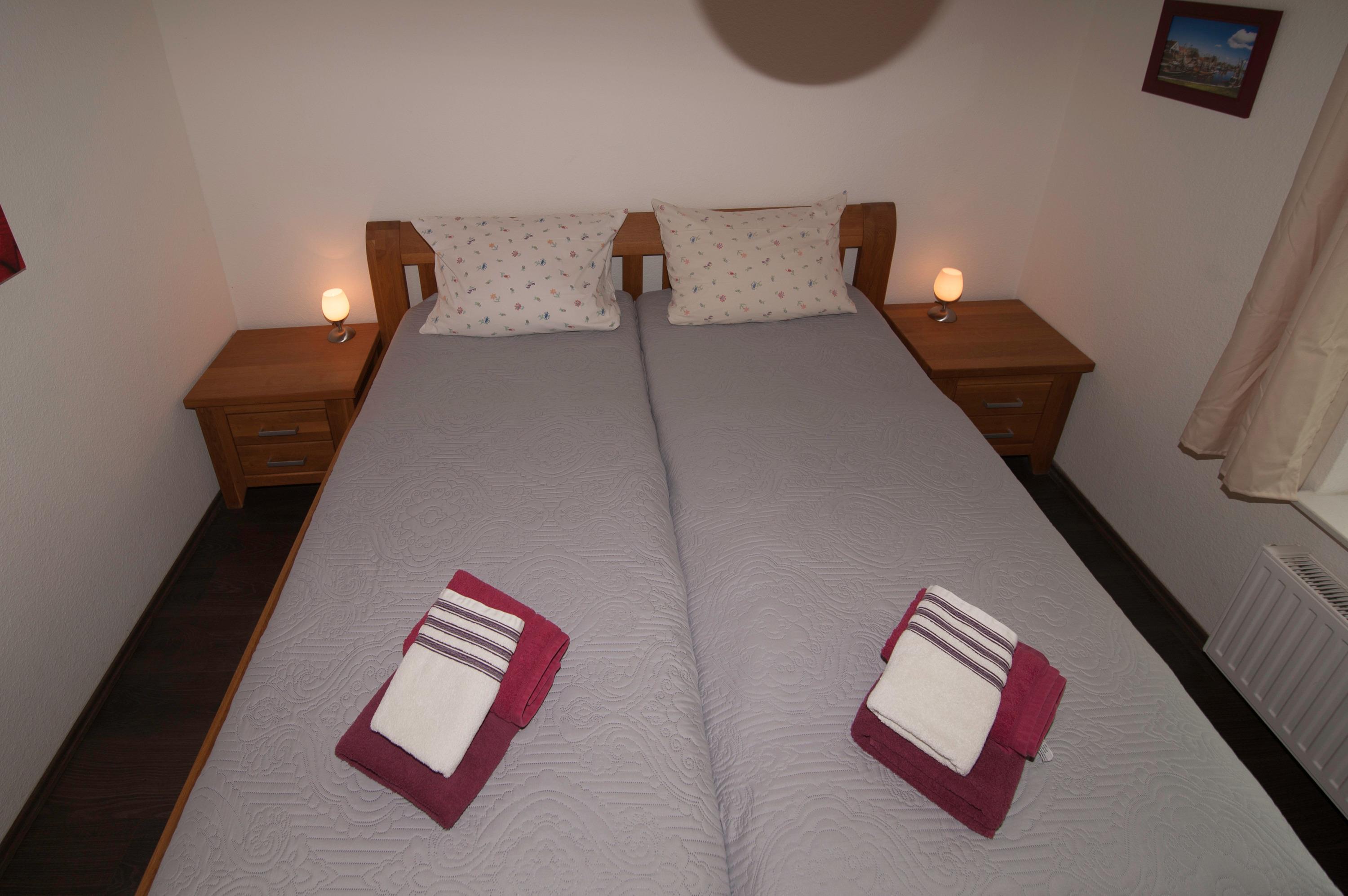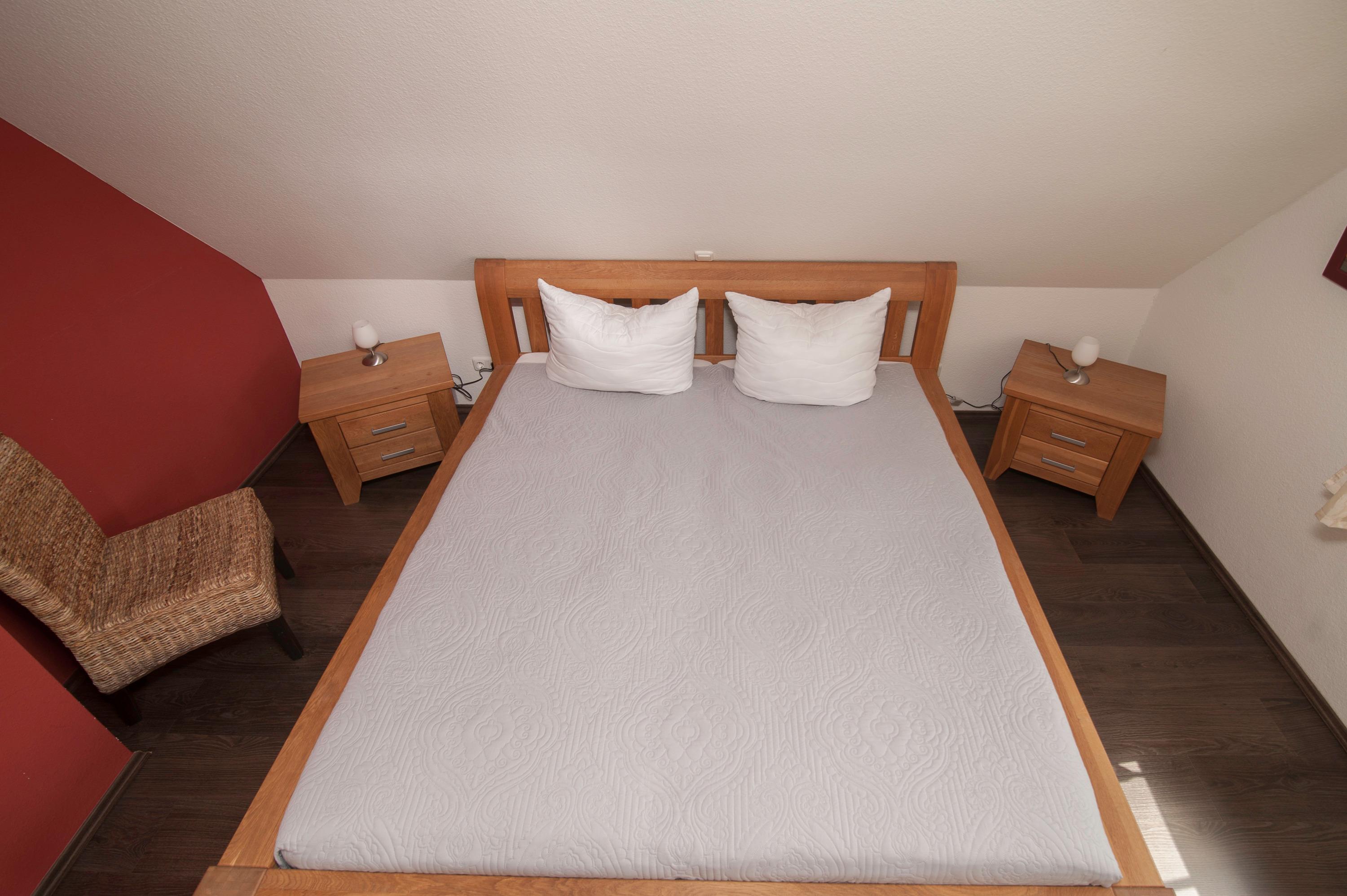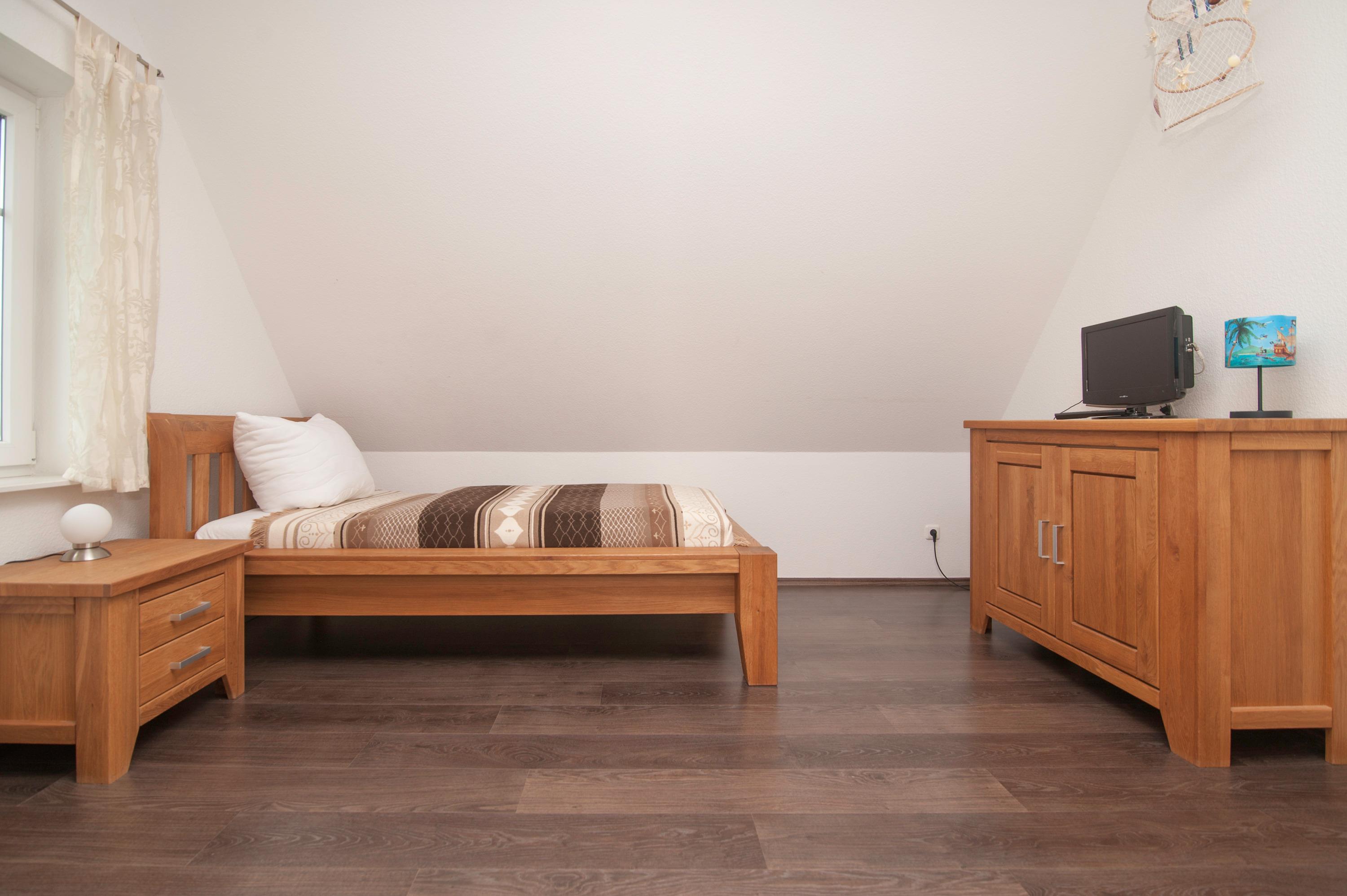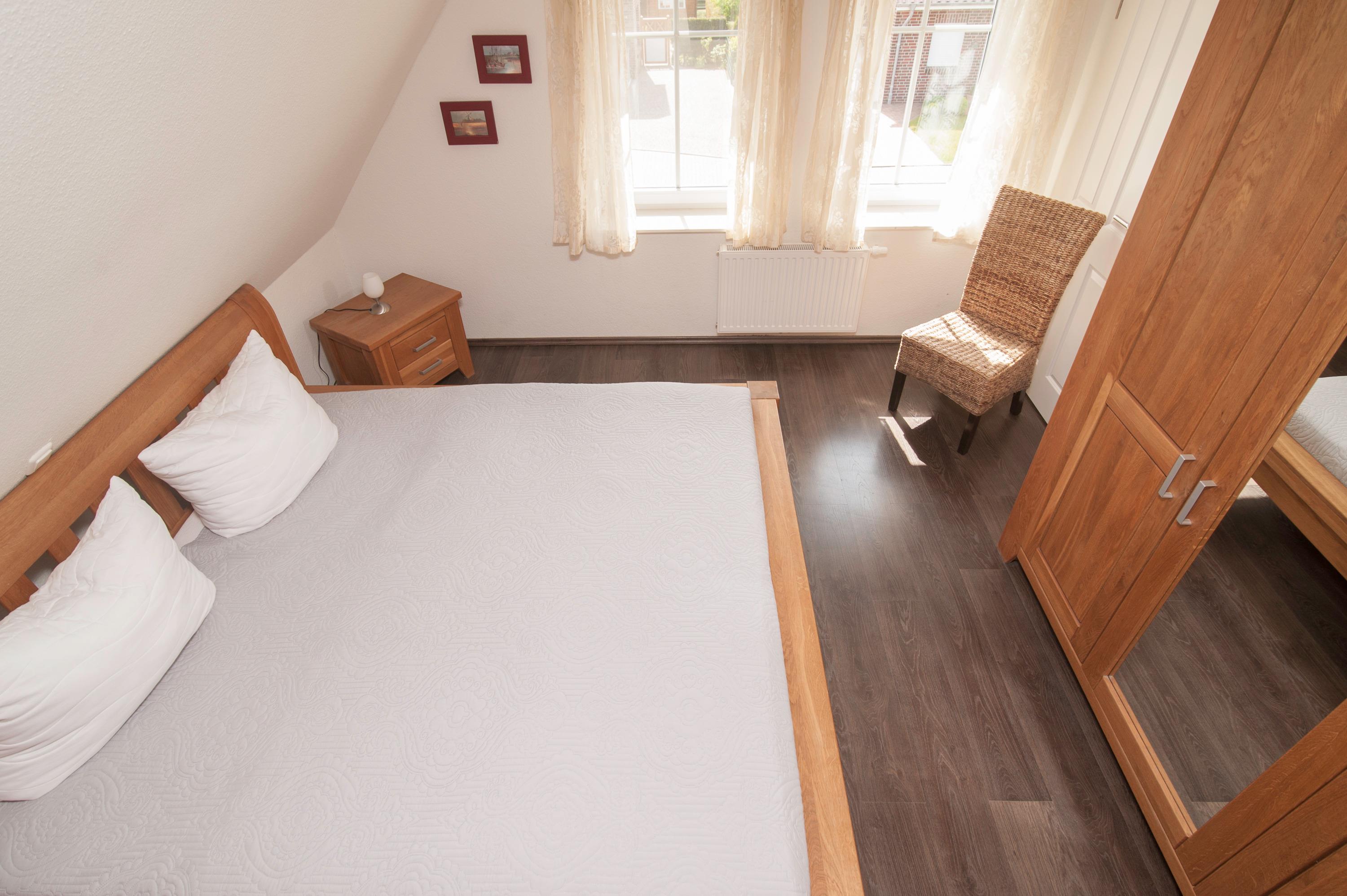 Ein Schlafzimmer mit Doppelbett befindet sich im Erdgeschoß (2 Matratzen 90 x 200cm). Im Obergeschoß befindet sich ein weiteres mit 2 Einzelbetten (100 x 200cm) ,19"LCD-TV sowie mit einem Kinderbett sowie ein 3. Schlafzimmer (Deichblick) mit einem Doppelbett. Das Bad im Erdgeschoß ist mit Dusche (niedriger Einstieg), WC , Waschtisch und Föhn ausgestattet. Ein zusätzliches Bad mit Dusche und WC befindet sich im Obergeschoß. Für die kleinen Gäste stehen Treppenschutzgitter und ein Hochstuhl zur Verfügung.