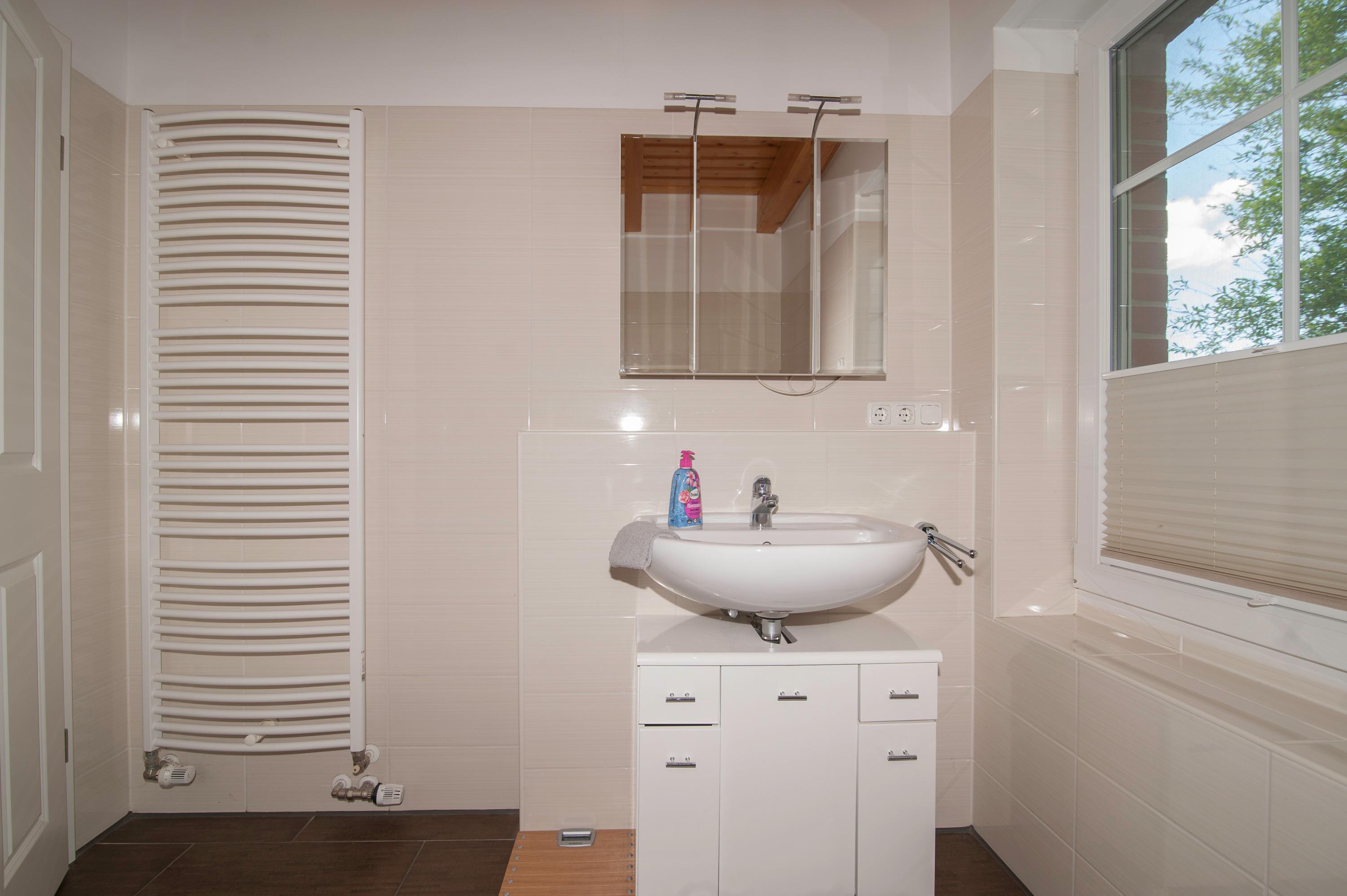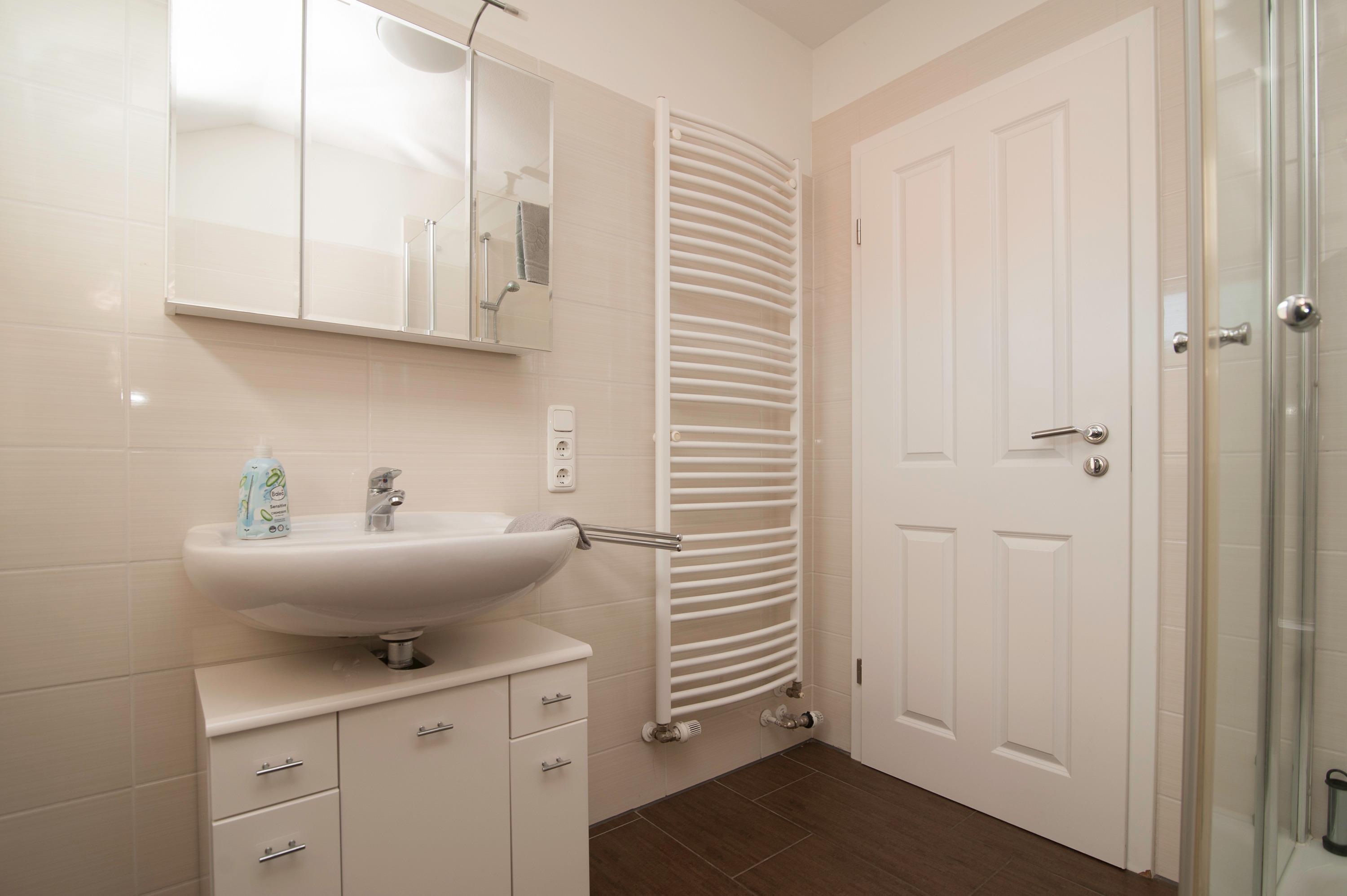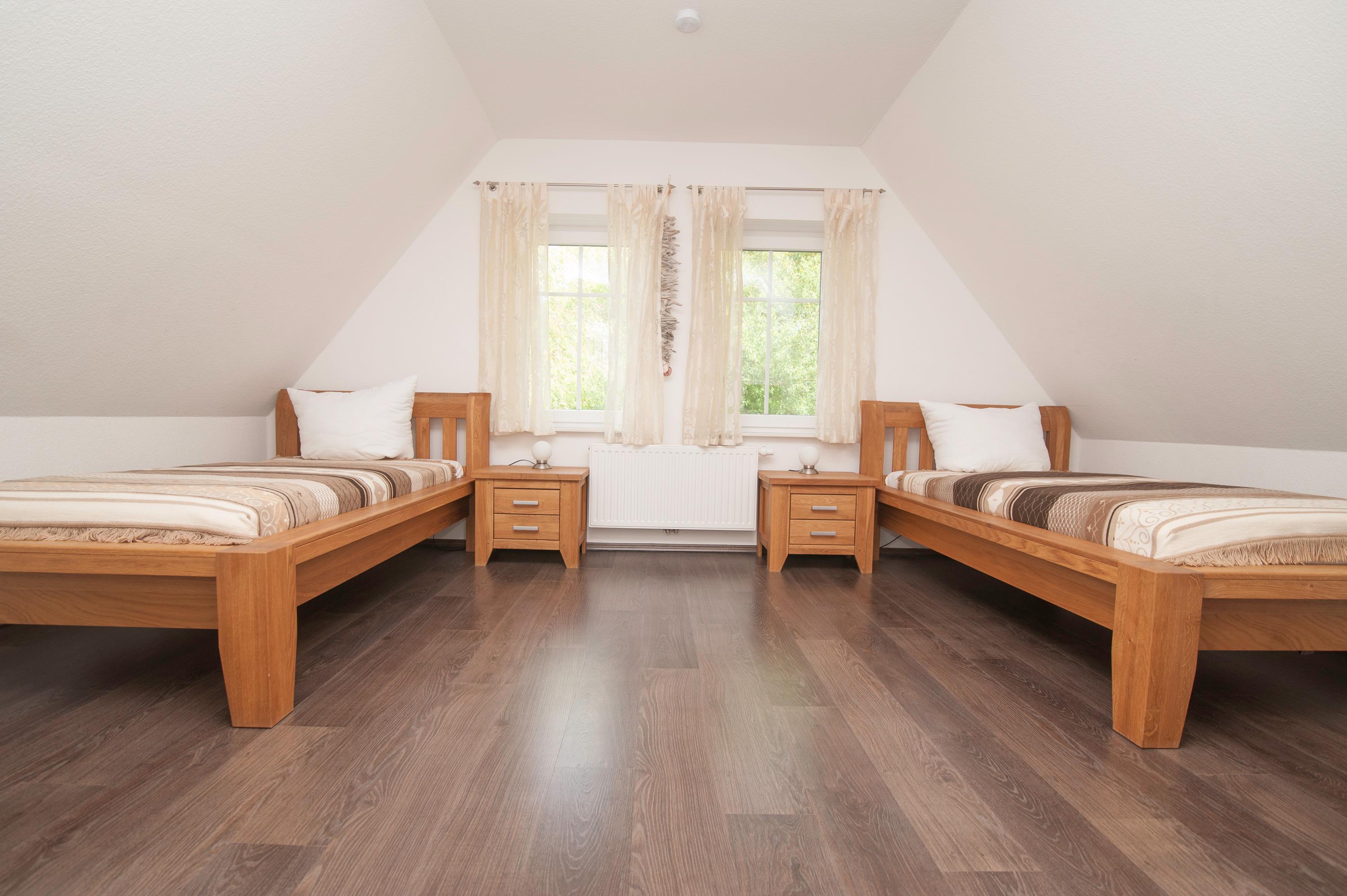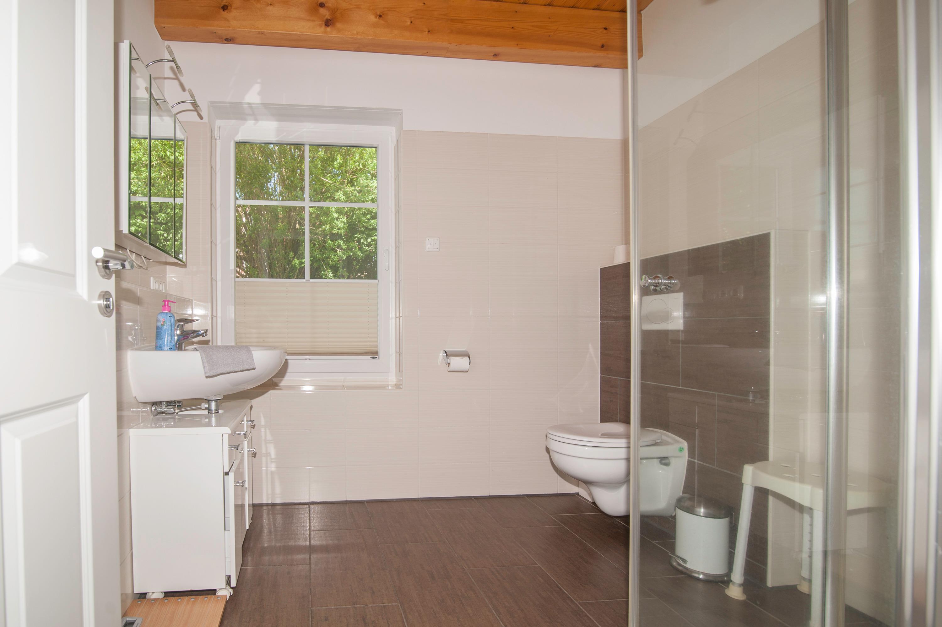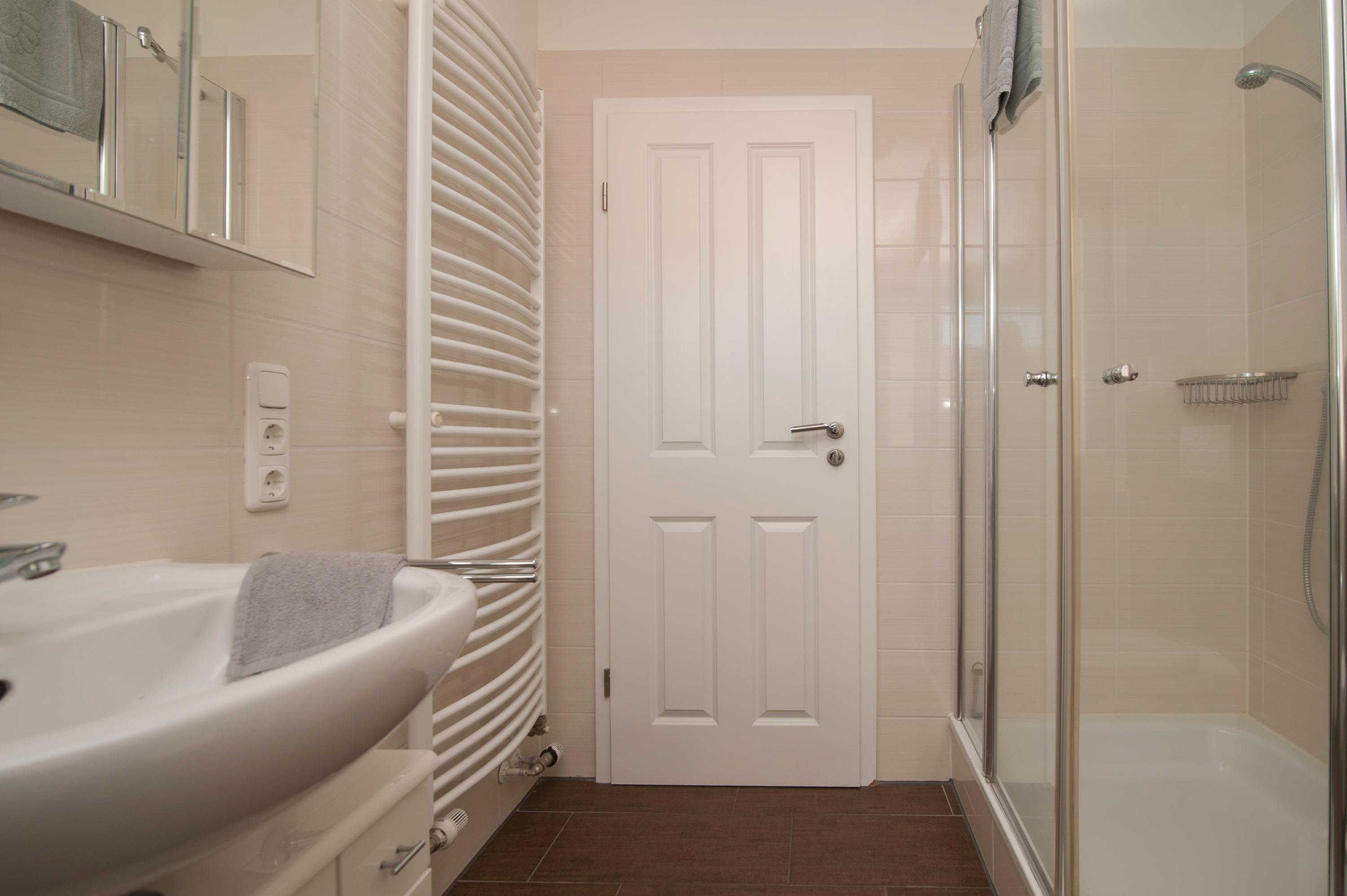 Ein Schlafzimmer mit Doppelbett befindet sich im Erdgeschoß (2 Matratzen 90 x 200cm). Im Obergeschoß befindet sich ein weiteres mit 2 Einzelbetten (100 x 200cm) ,19"LCD-TV sowie mit einem Kinderbett sowie ein 3. Schlafzimmer (Deichblick) mit einem Doppelbett. Das Bad im Erdgeschoß ist mit Dusche (niedriger Einstieg), WC , Waschtisch und Föhn ausgestattet. Ein zusätzliches Bad mit Dusche und WC befindet sich im Obergeschoß. Für die kleinen Gäste stehen Treppenschutzgitter und ein Hochstuhl zur Verfügung.