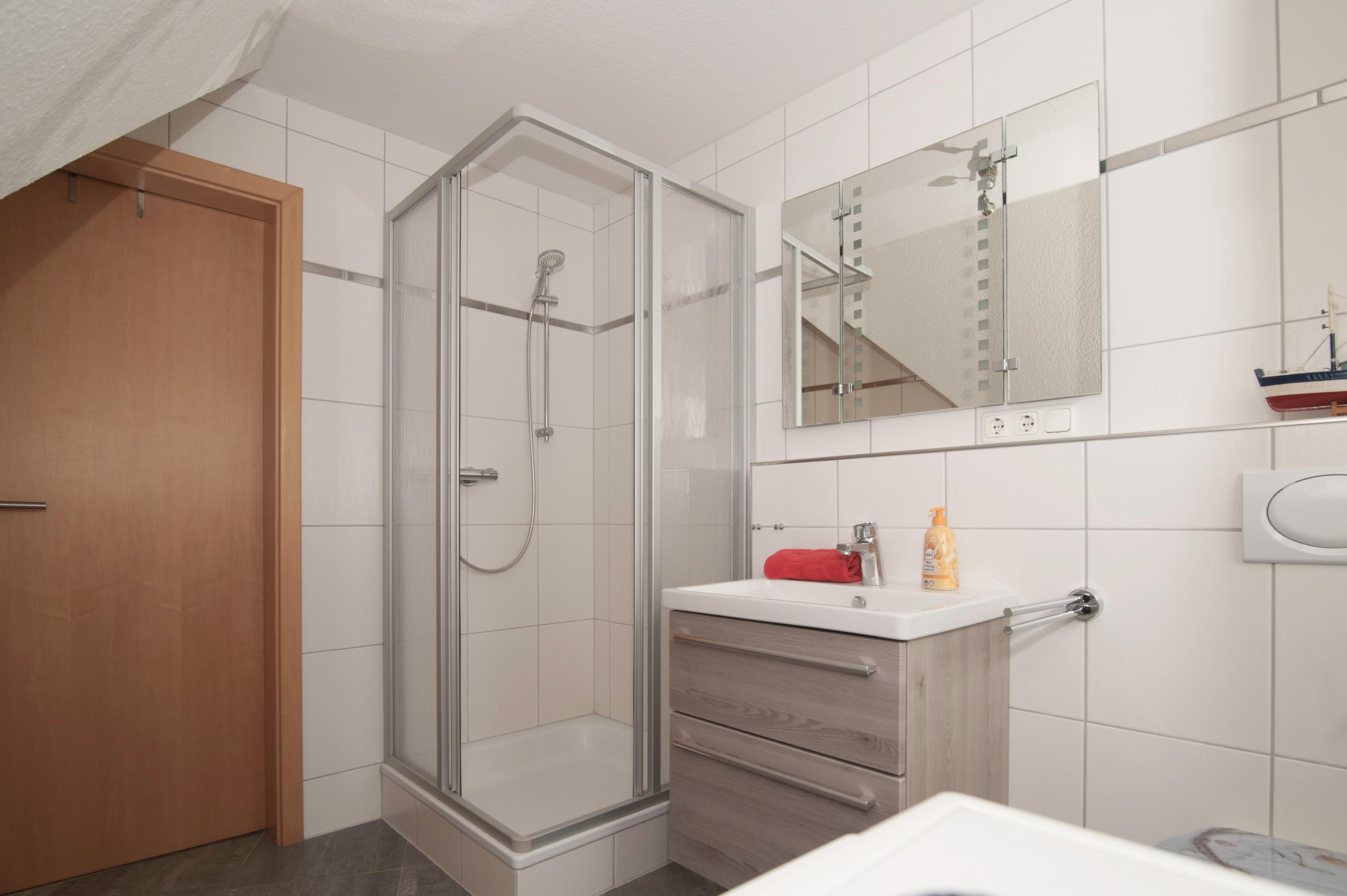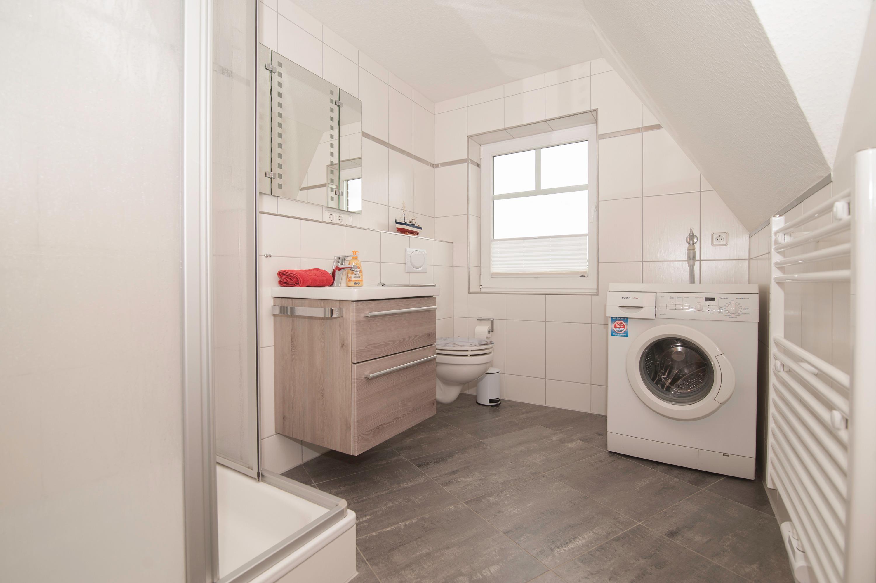 Auch das Badezimmer ist im Obergeschoß mit Dusche, Fußbodenerwärmungsanlage und Waschmaschine (5kg). Im Abstellraum finden sie u.a. Kinderreisebett, Hochstuhl, Wäscheständer, Bügelbrett und Bügeleisen.