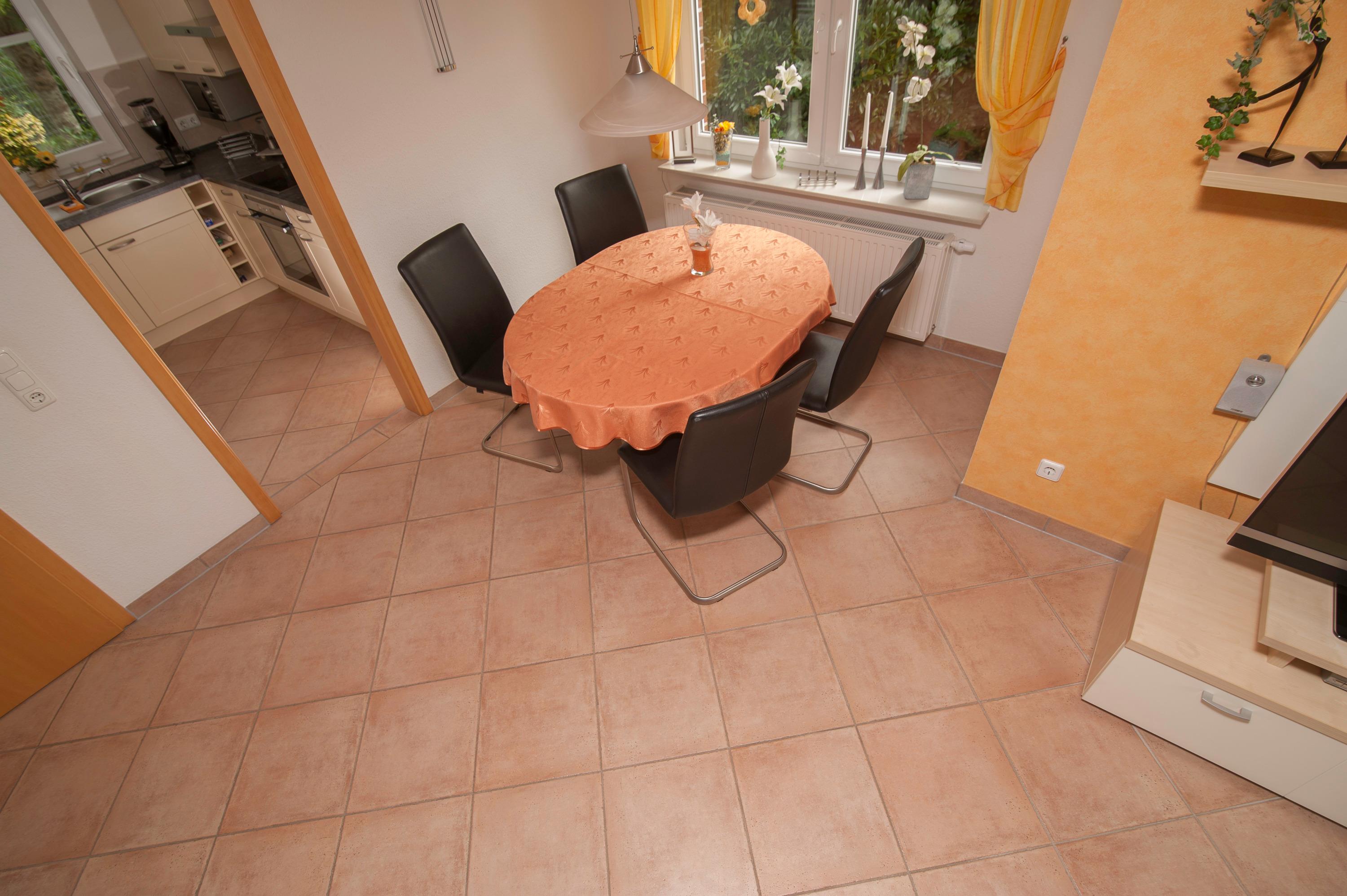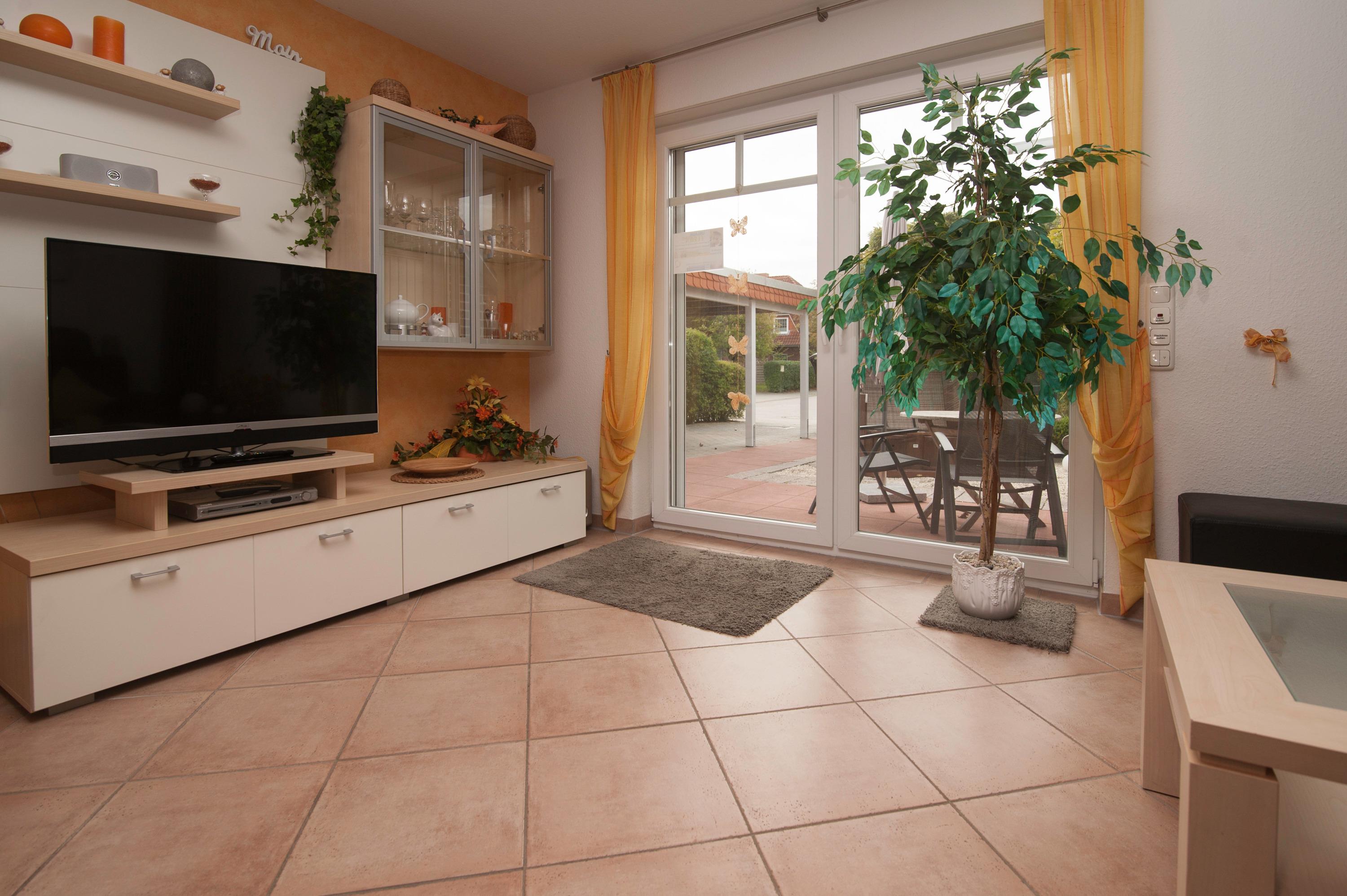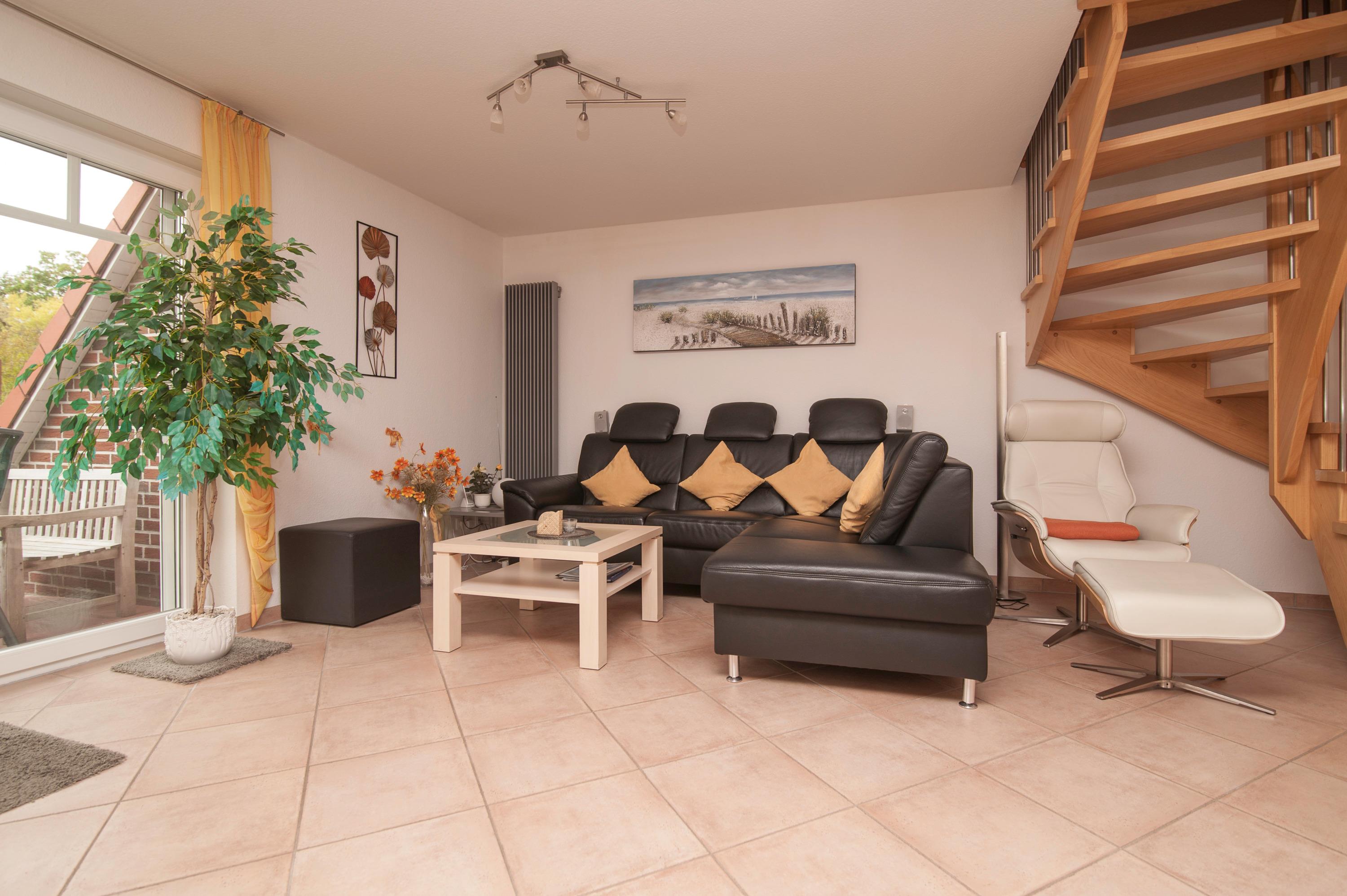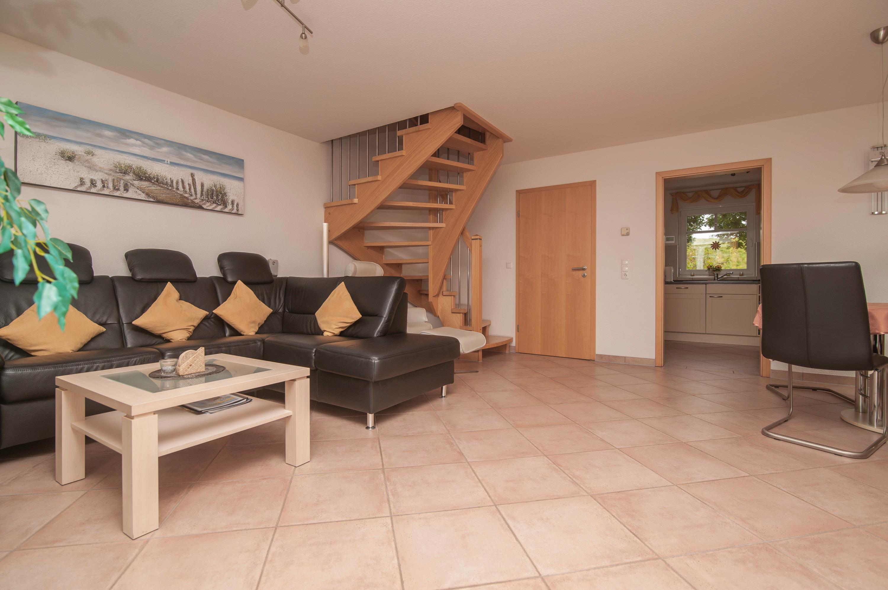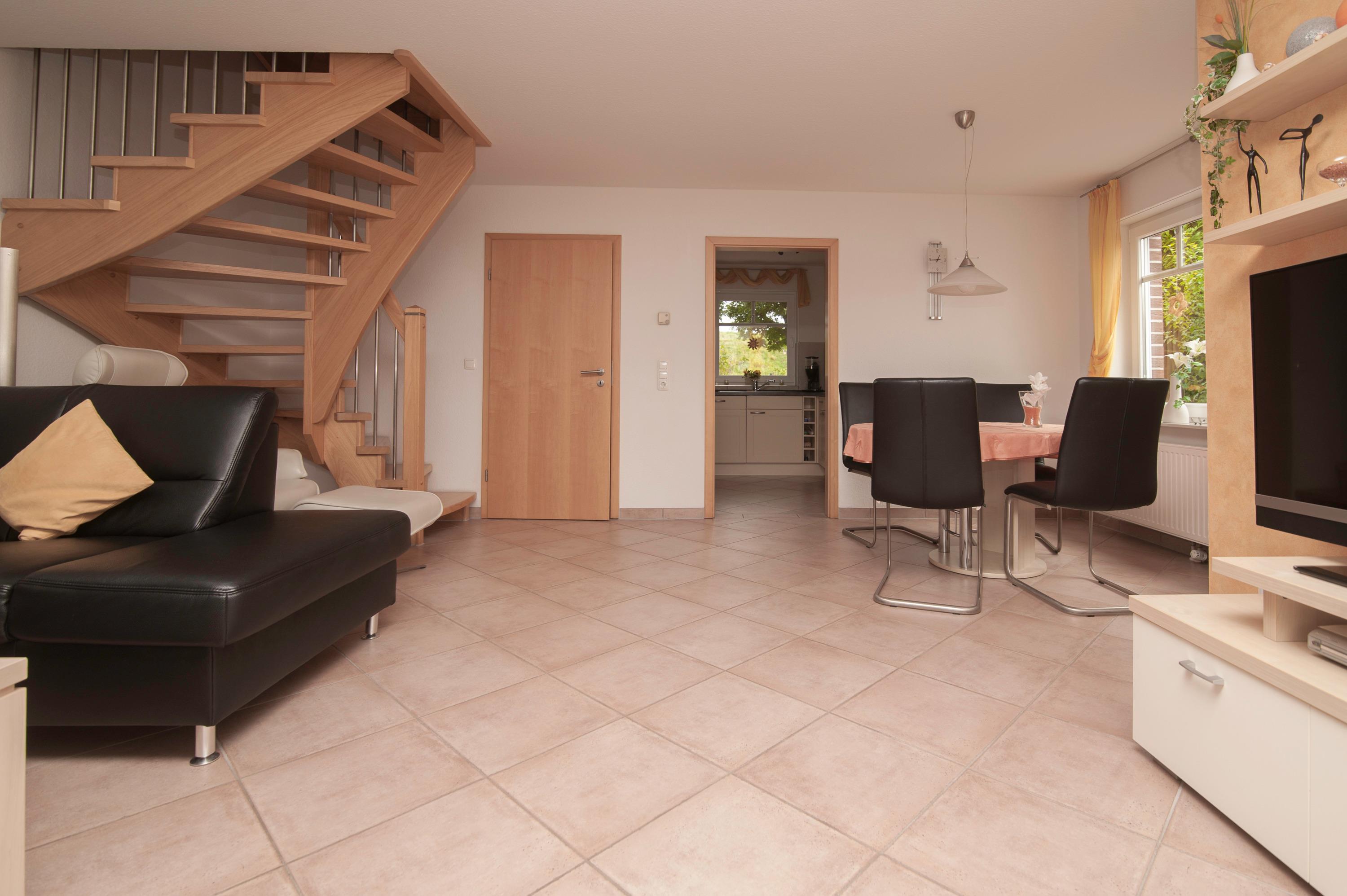 Im Erdgeschoss befindet sich der schöne und helle Ess- und Wohnbereich für 4 Personen, ein 43"Metz LCD-TV, eine DVD / Tuner Sourround Anlage sowie ein zusätzliches Radio. Ein DSL WLAN-Gastzugang ist vorhanden. Ein komfortabler Relaxsessel rundet die hochwertige Einrichtung ab.