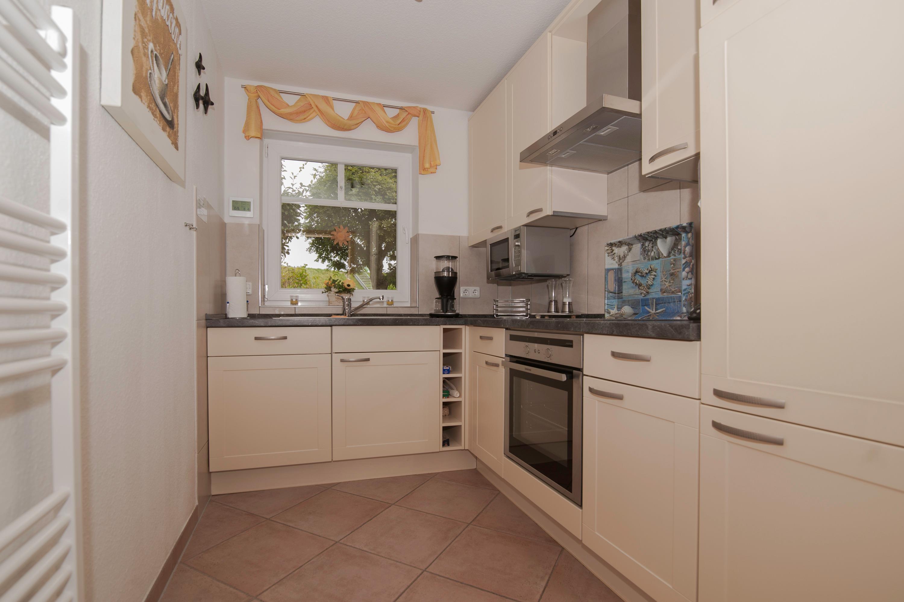 Die komfortable Einbauküche ist mit Herd und Induktionskochfeld, Mikrowelle, Dunstabzugshaube, Kühlschrank mit Gefrierfach, Geschirrspüler, Filterkaffee + Kaffee-Padmaschine und weiterem komplett ausgestattet. Ein Gäste-WC, Abstellraum, und Fußbodenerwärmungsanlage befinden sich hier ebenfalls.