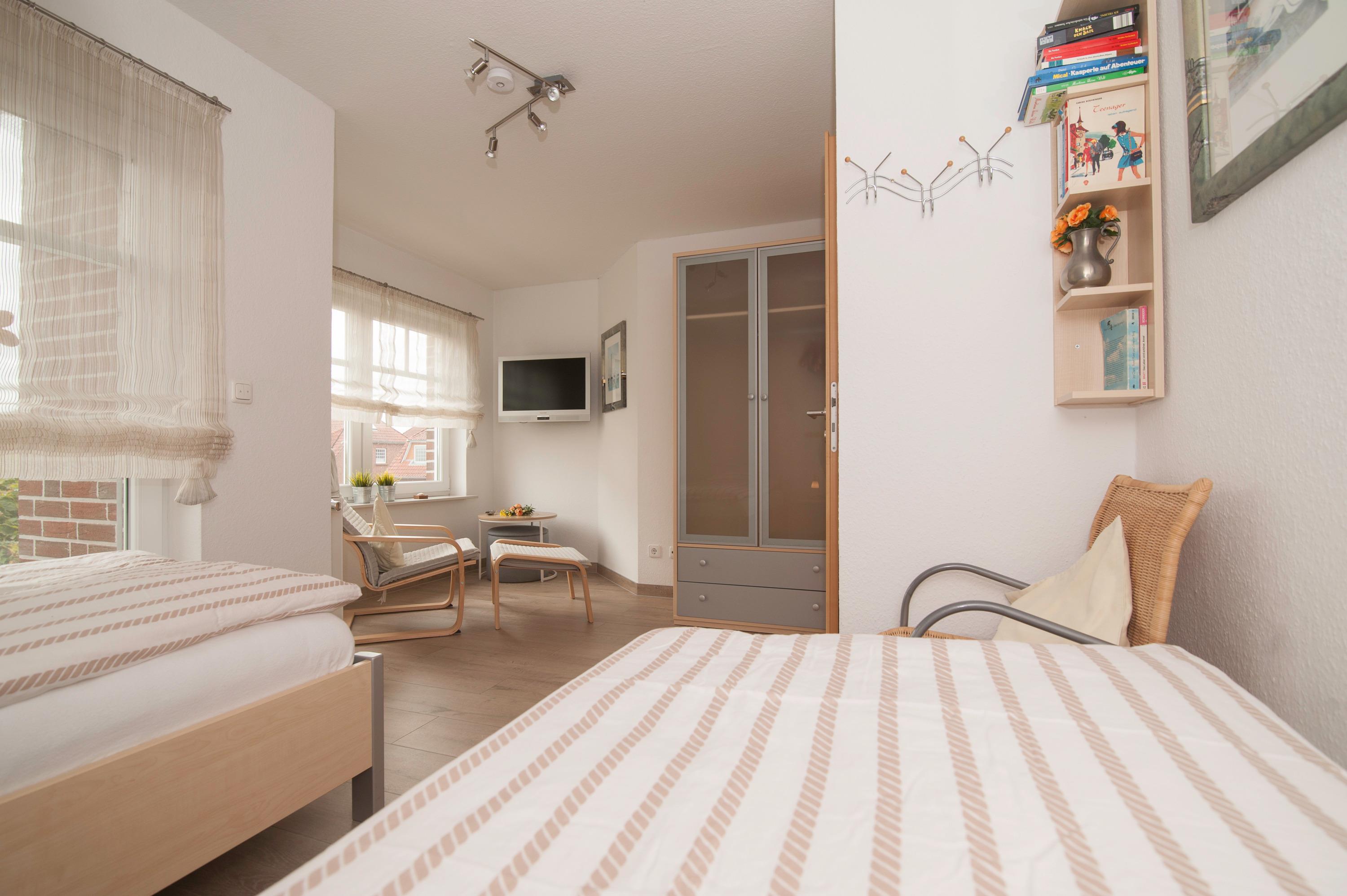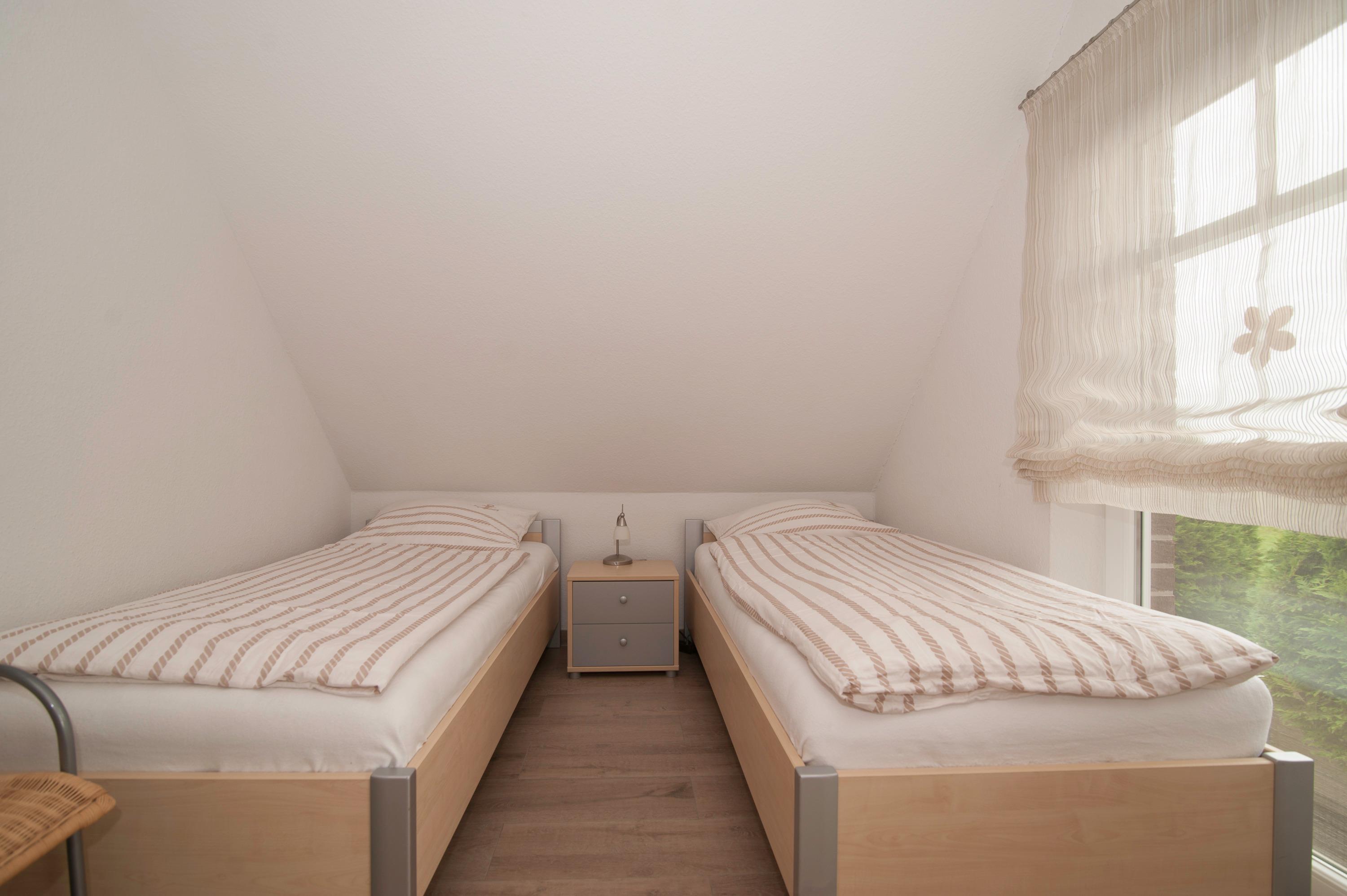Im Obergeschoss befinden sich 2 modern eingerichtete Schlafräume, einmal mit Doppelbett, einmal mit 2 Einzelbetten. Hier steht ein zweites 32"TechniSat LCD-TV zur Verfügung. Die Bettdecken haben ein Maß von 1,55 x 2,20 m.