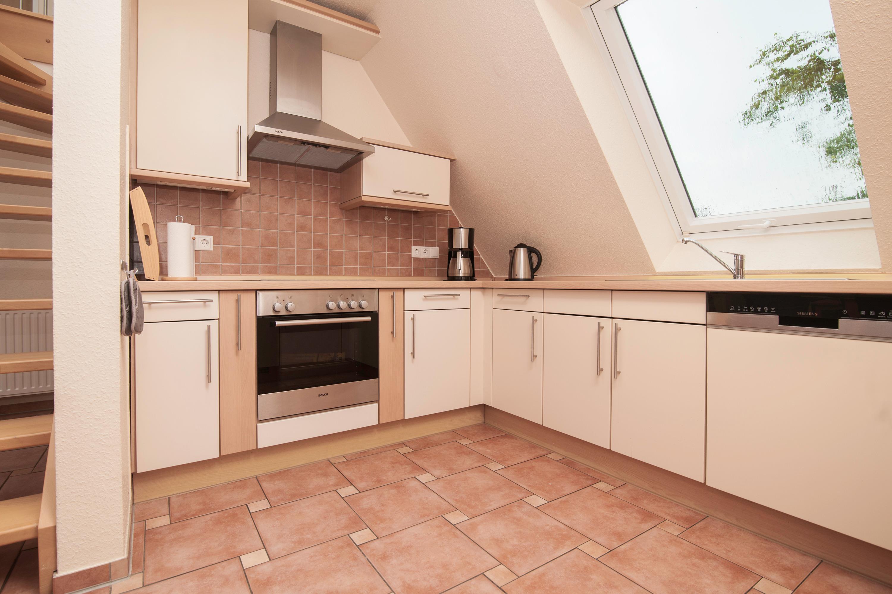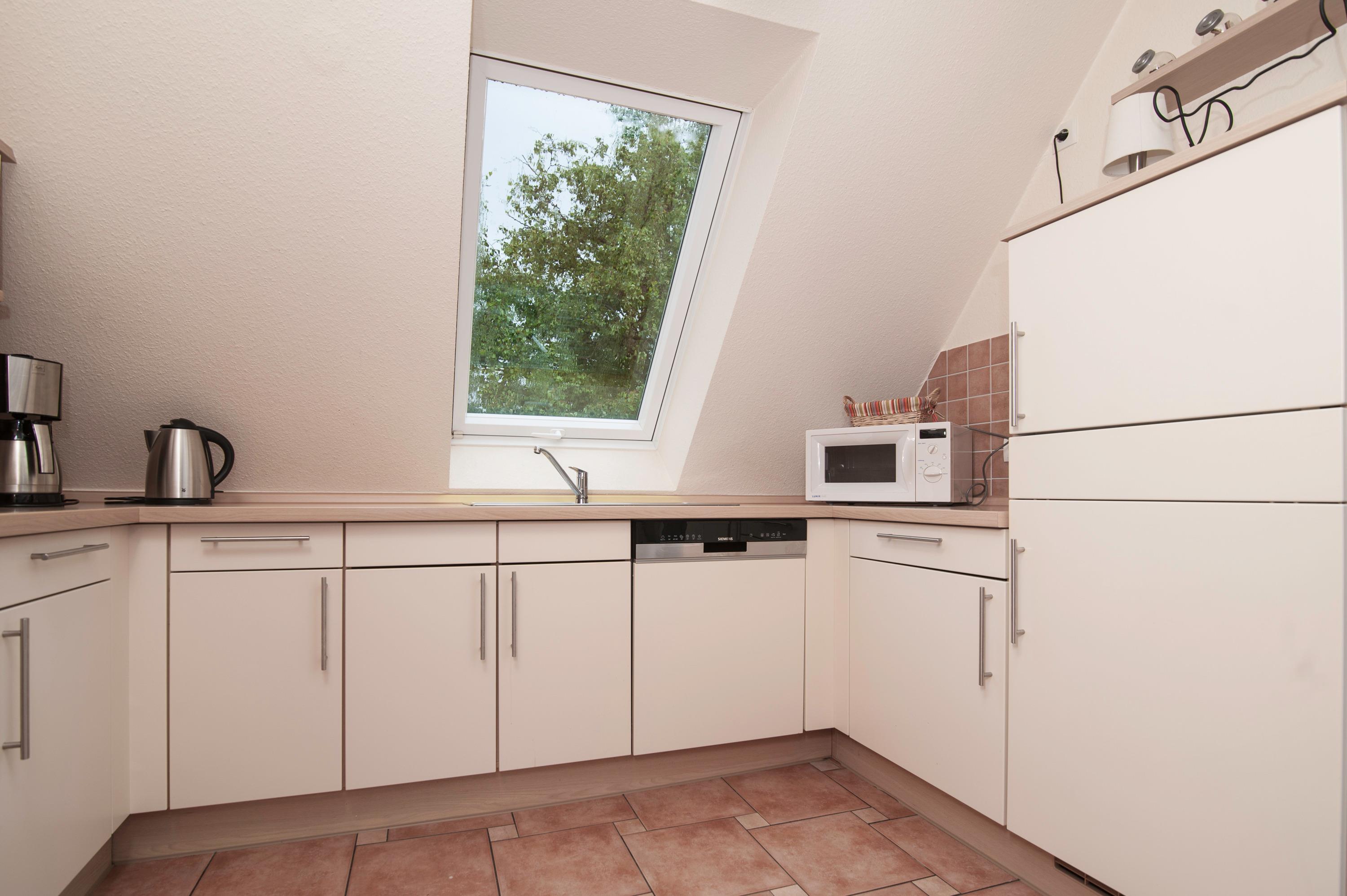 Die Einbauküche ist voll ausgestattet mit Geschirrspüler, Kühlschrank, separatem Gefrierschrank, Mikrowelle, Herd mit Cerankochfeld und Dunstabzugshaube. Die Wohnung verfügt über einen Kaminofen, der besonders an ungemütlichen Tagen für eine gemütliche Atmosphäre sorgt., auch die Sauna garantiert entspannte Stunden.