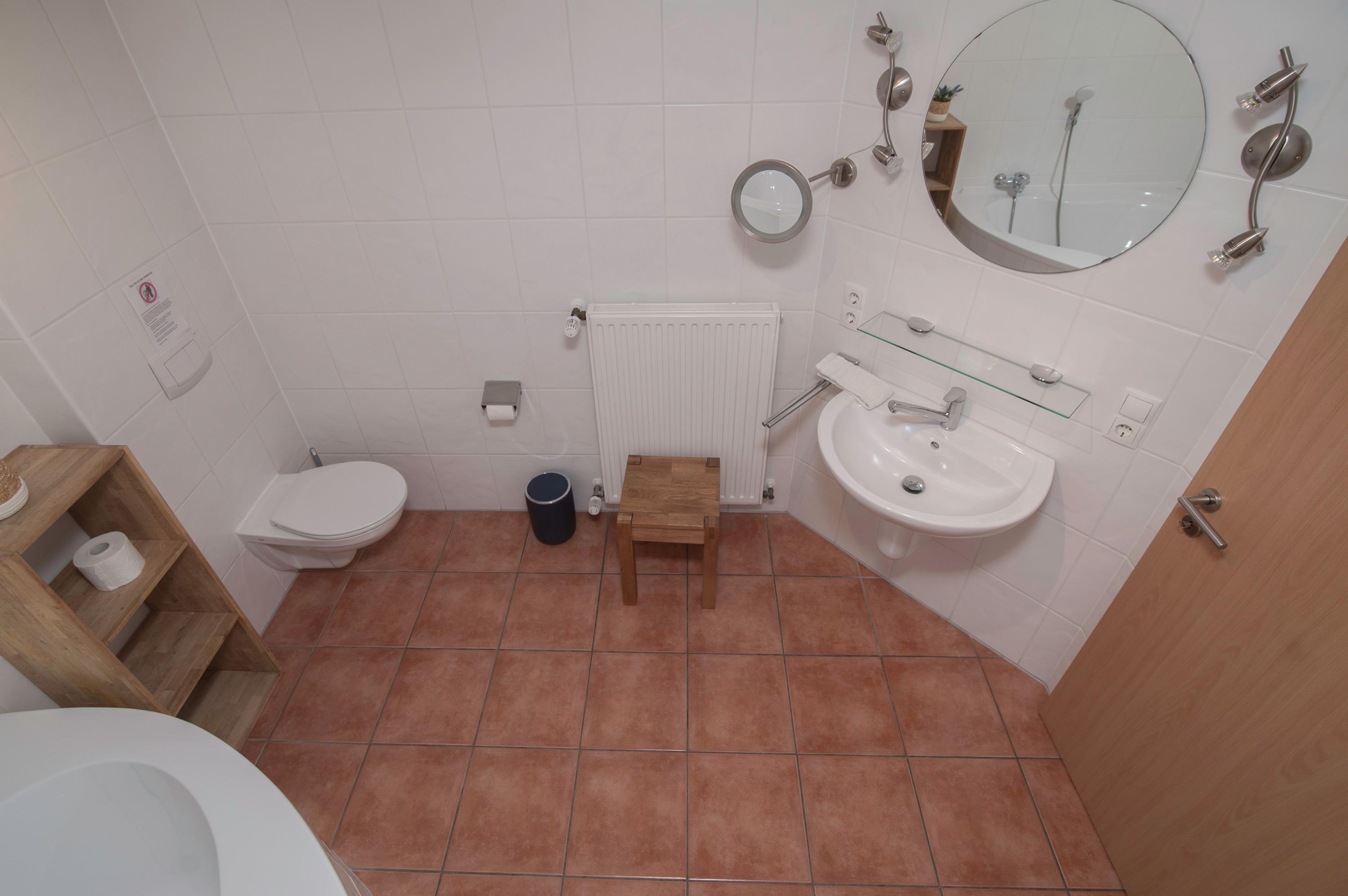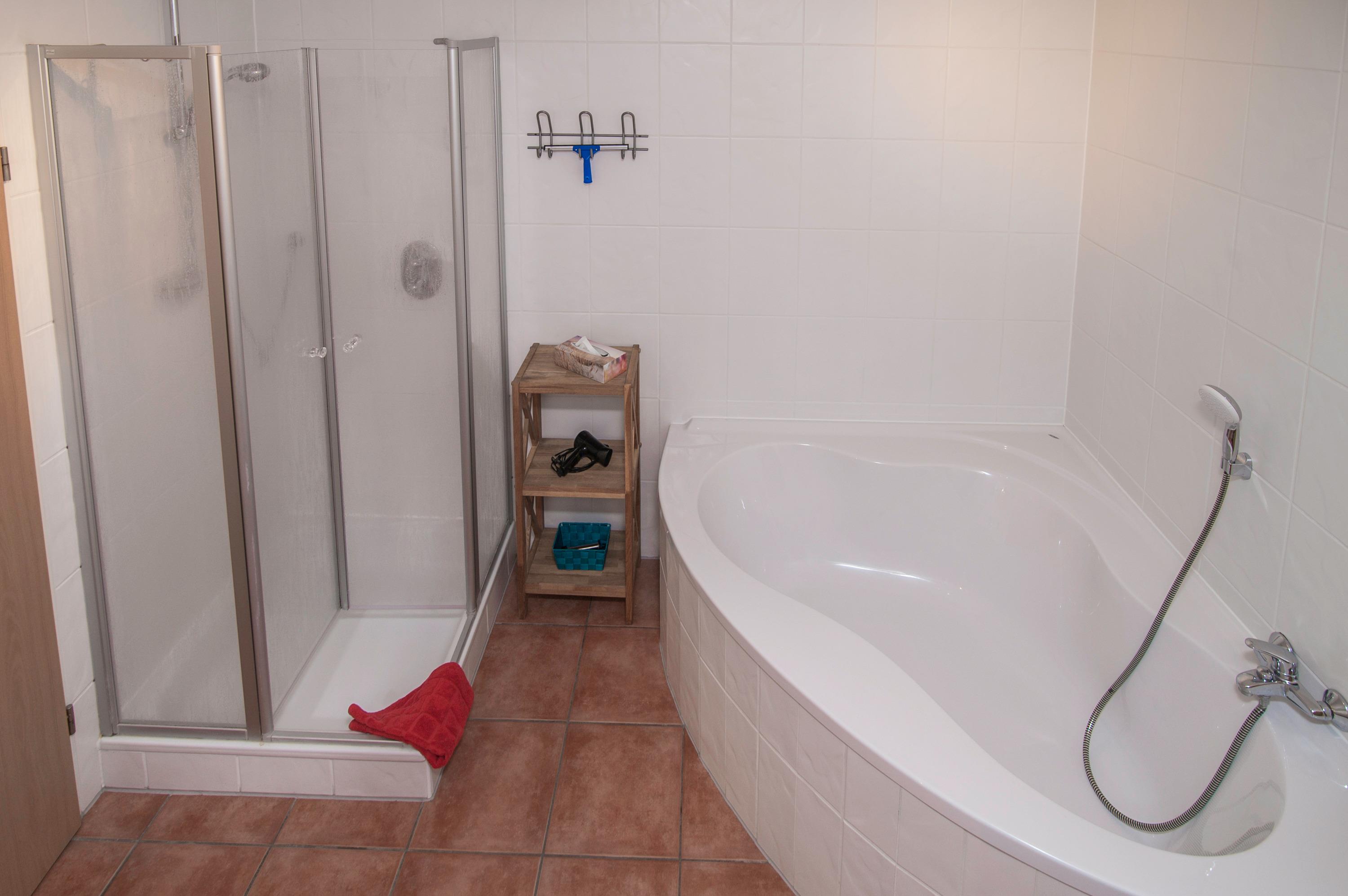 Das innenliegende Badezimmer mit einer Fußbodenheizung verfügt über eine Dusche, ein WC und einer Eckbadewanne. In einem kleinen Abstellraum befinden eine Waschmaschine (5 kg) und ein Kondenstrockner.