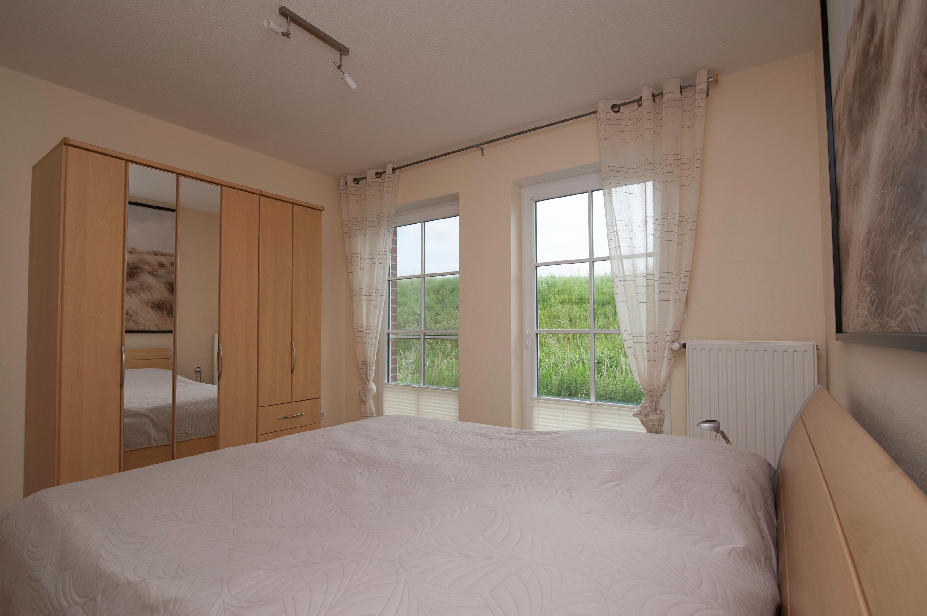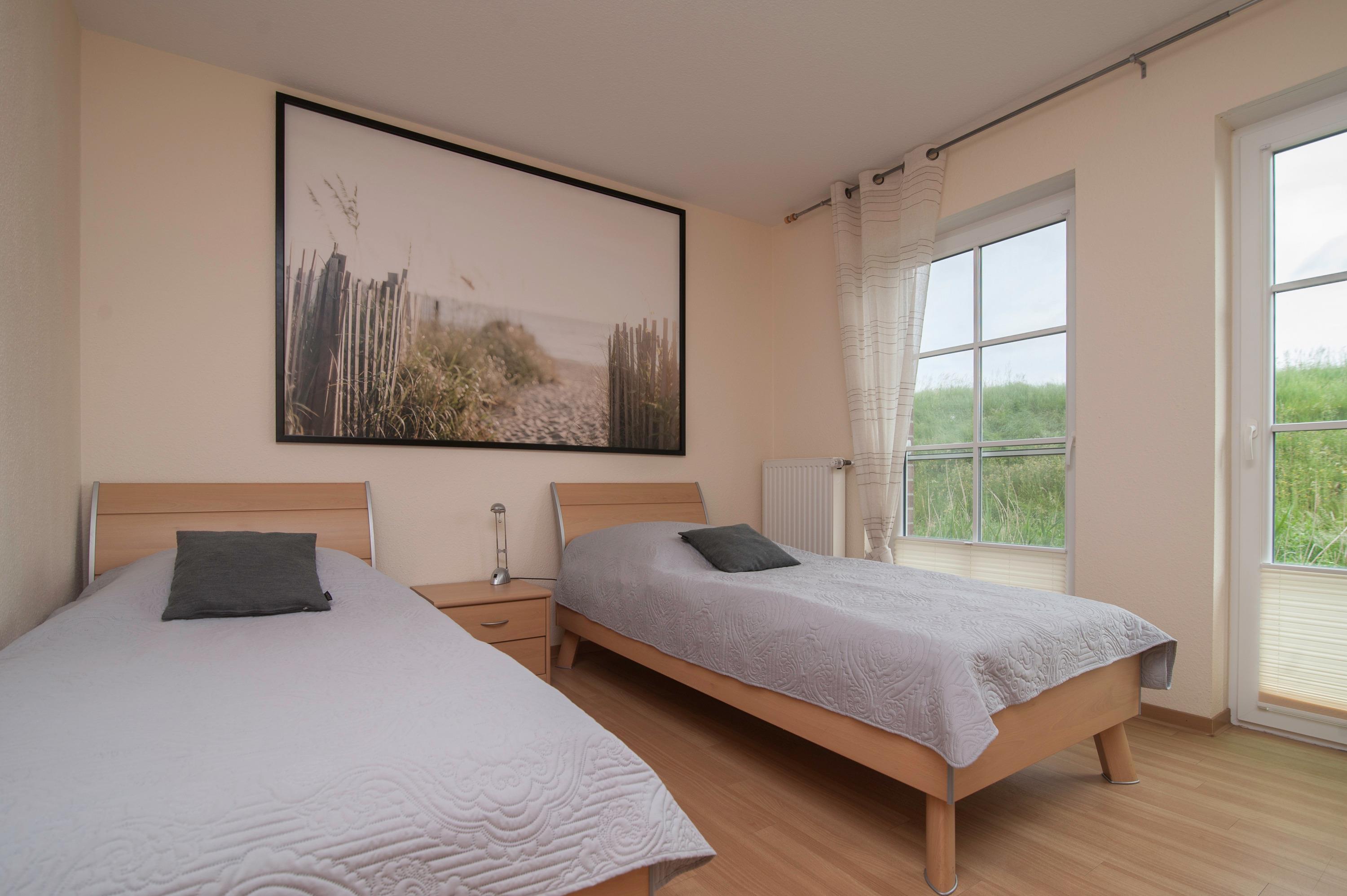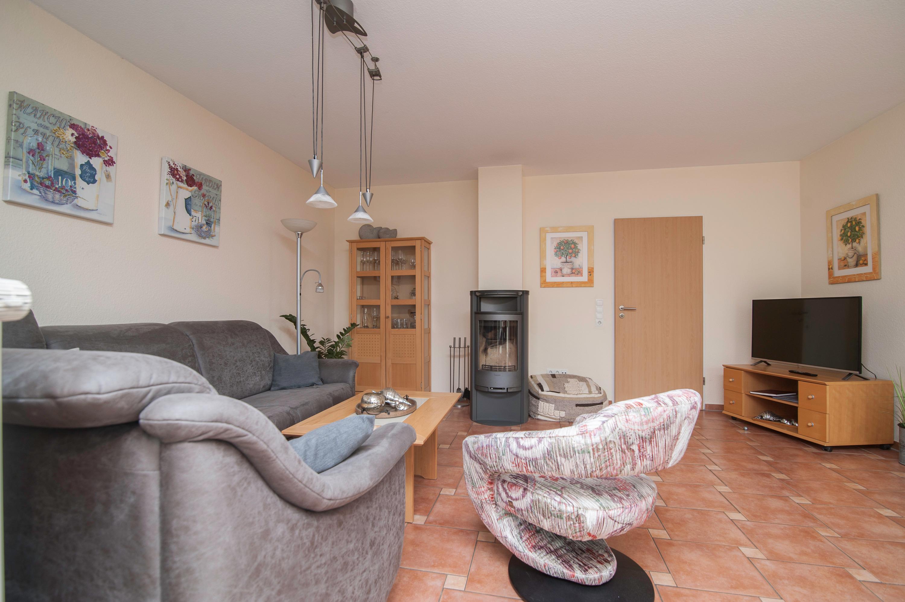 Für eine gemütliche Atmosphäre an kühlen Tagen sorgt der Kaminofen. Die Wohnung bietet Platz für 2 bis 4 Personen. Die Schlafzimmer sind jeweils mit einem Kleiderschrank ausgestattet, eines mit einem Doppelbett (2 x 90 x 200 cm) und das andere mit zwei Einzelbetten in der gleichen Größe. Alle Bettenverfügen über verstellbare Lattenroste. Außenrollos und Insektenschutzgitter sind ebenfalls vorhanden.