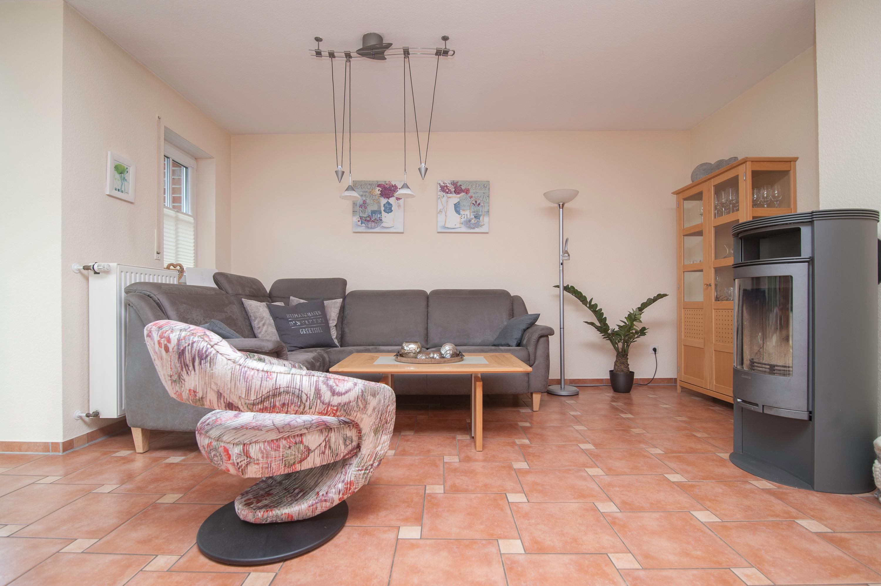Die Ferienwohnung "Angelika" befindet sich im Erdgeschoss und liegt direkt hinter dem Deich in einer ruhigen Sackgassenlage. Sie bietet eine Wohnfläche von ca. 78 qm und ist ideal gelegen, da der malerische Greetsieler Hafen und der belebte Ortskern mit vielen Cafés und Restaurants nur wenige Gehminuten entfernt sind.
