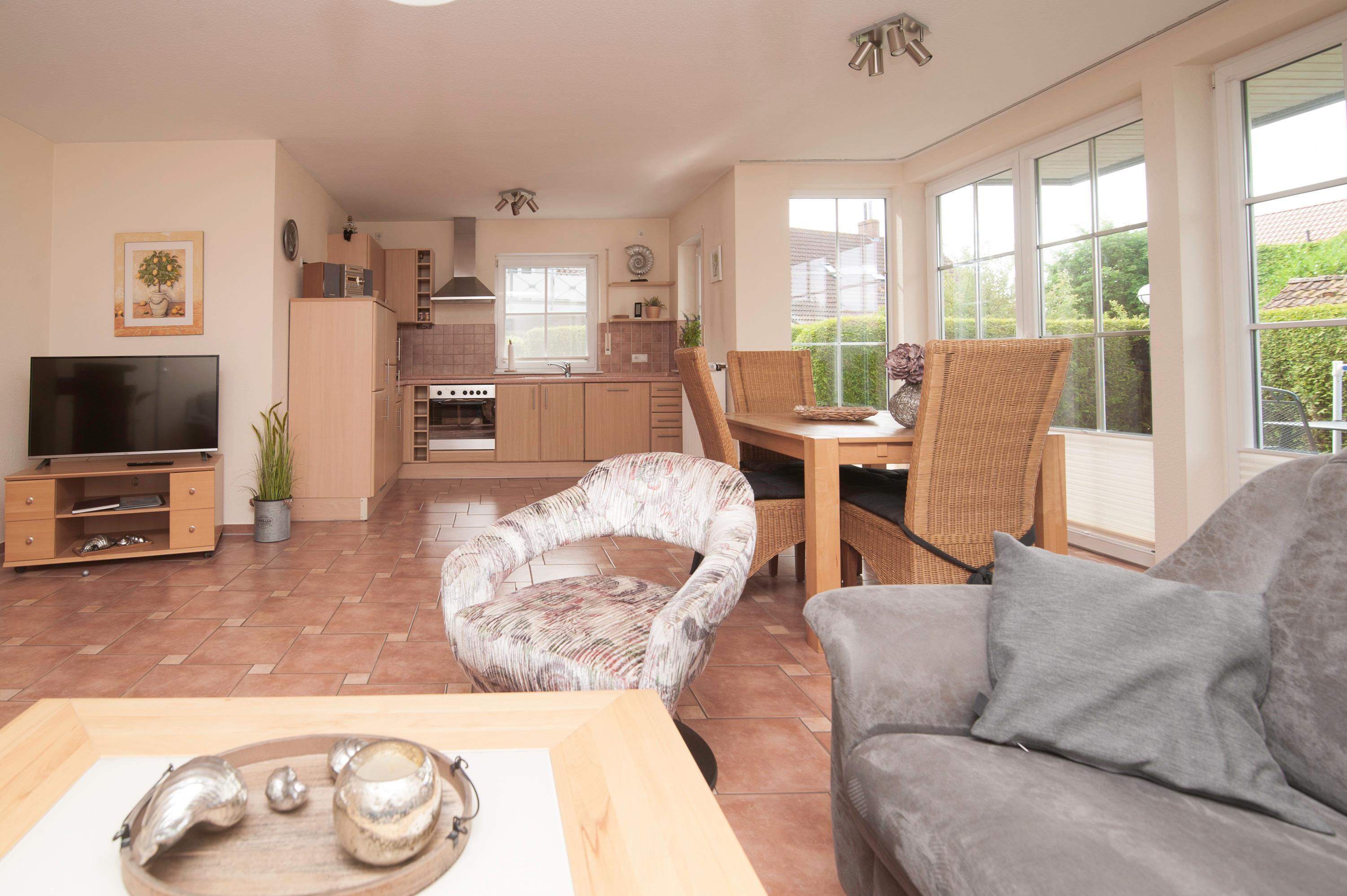 Die Wohnung verfügt über einen hellen Wohnraum, ausgestattet mit einem 43" Metz UHD LED-TV, einer Stereoanlage und einem DSL WLAN-Gastzugang . Der Essbereich führt zur großzügigen Terrasse, die mit passenden Möbeln ausgestattet ist. Die Einbauküche ist komplett eingerichtet mit Geschirrspüler, Kühlschrank und einem Gefrierfach, Mikrowelle, Herd und Dunstabzugshaube.