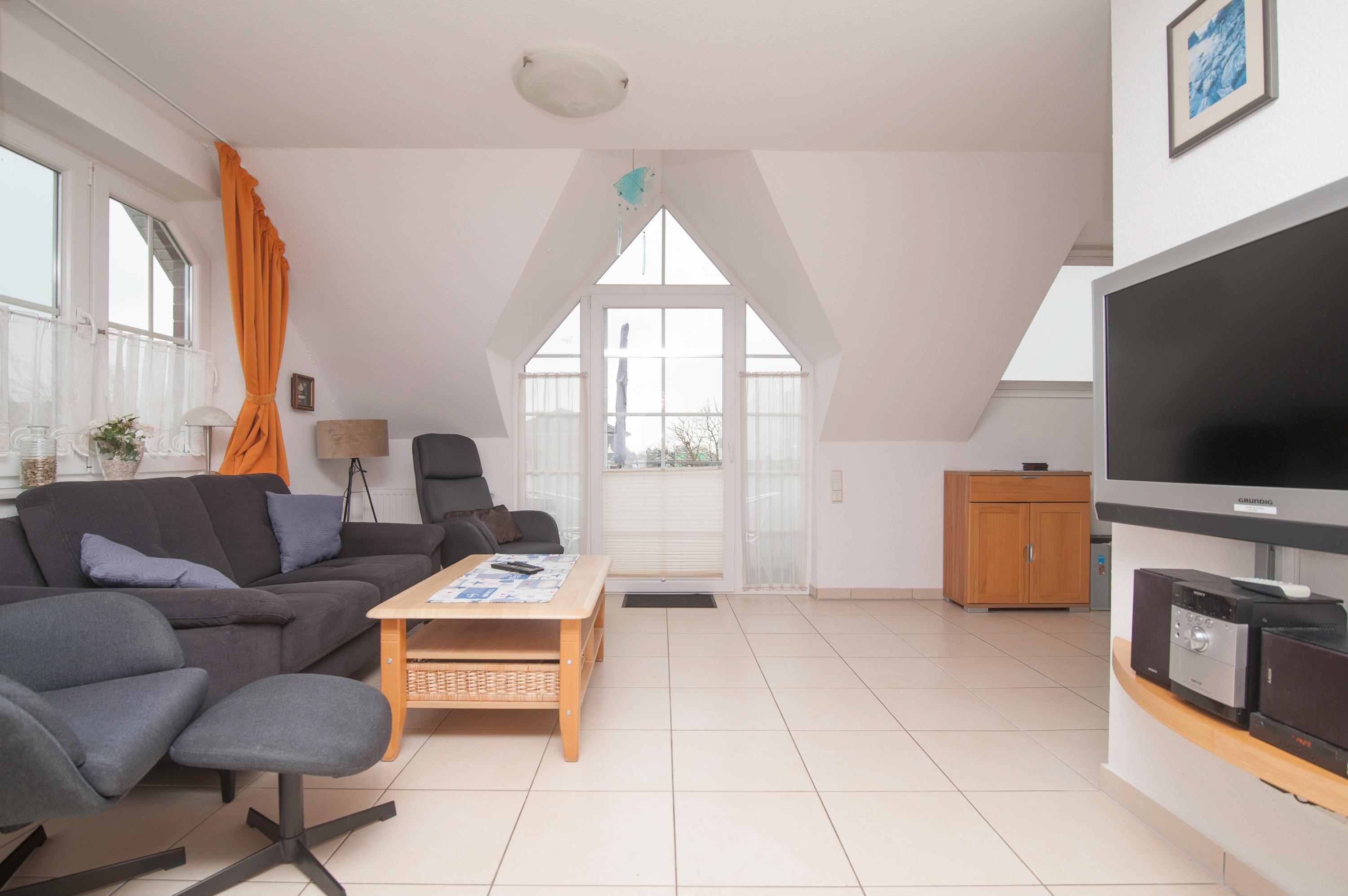 Der Wohn- und Essbereich lädt mit seiner offenen Gestaltung zum Verweilen ein – sei es für gemeinsame Mahlzeiten, einen gemütlichen Fernsehabend oder entspannte Lesestunden. Die voll ausgestattete Küche bietet alles, was Sie für die Zubereitung Ihrer Lieblingsgerichte brauchen – vom Frühstück bis zum Abendessen. Der kleine Balkon ist zur Wasserseite ausgerichtet, hier können Sie den Abend bei einem Glas Wein gemütlich ausklingen lassen.