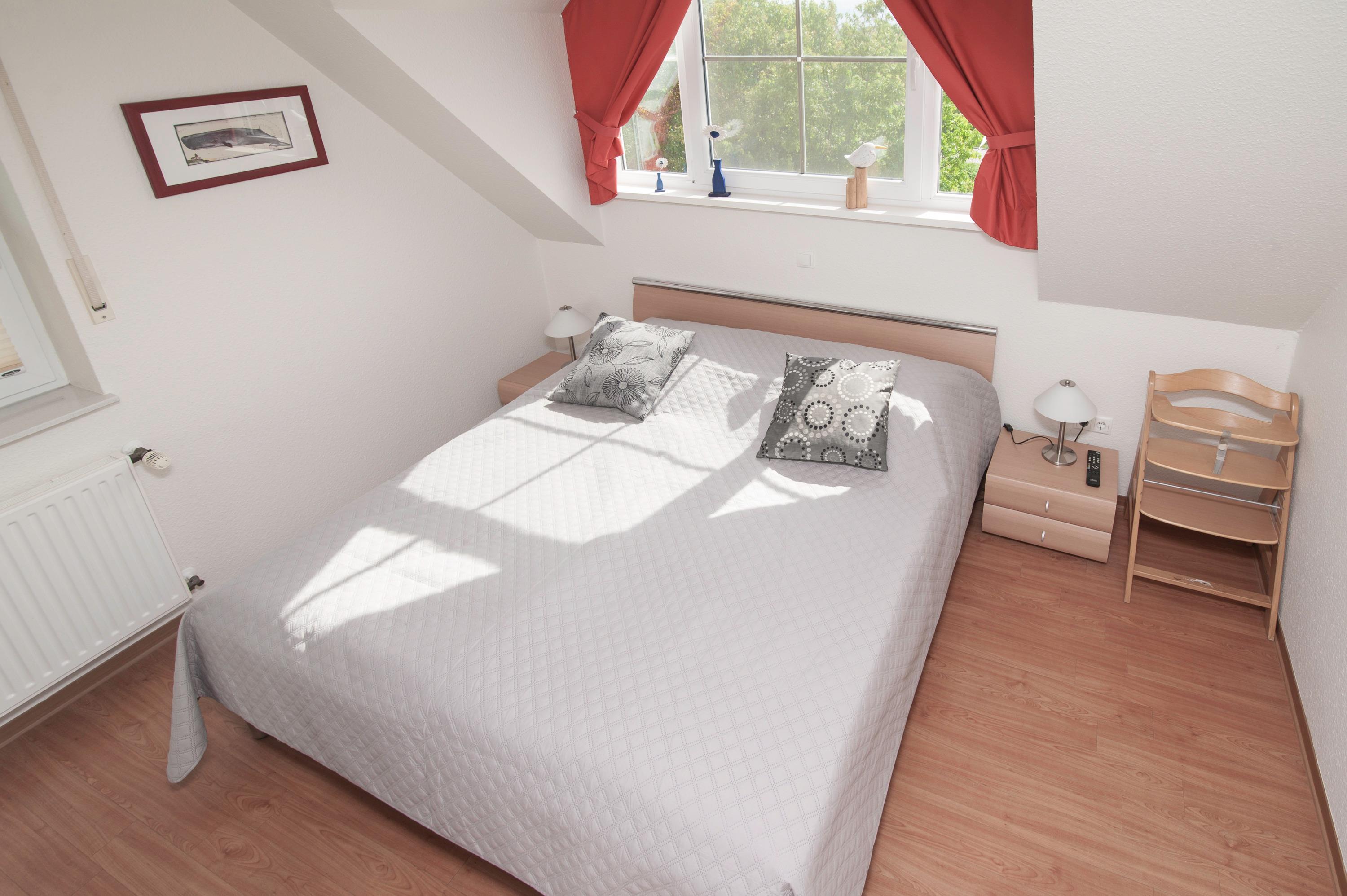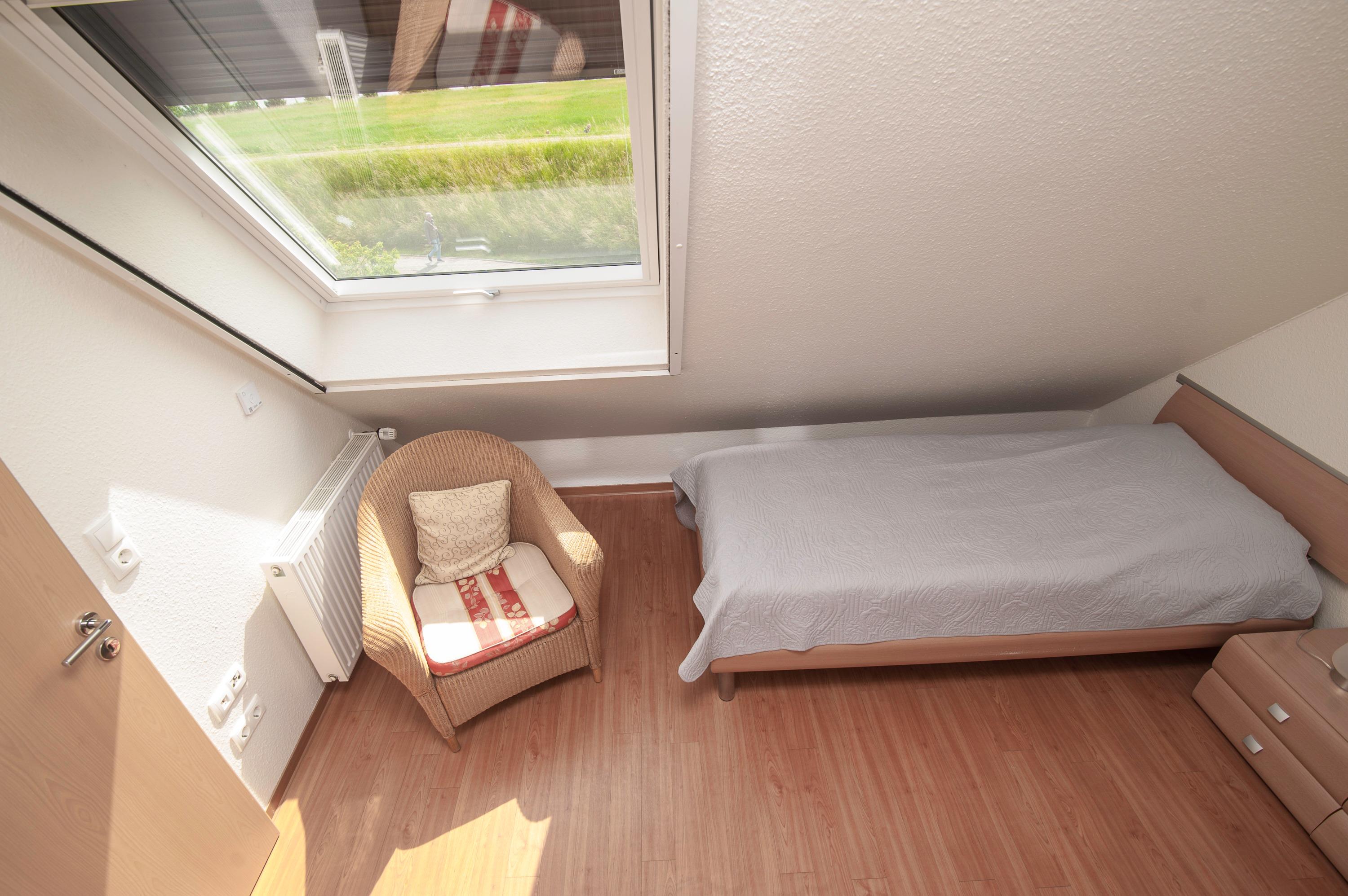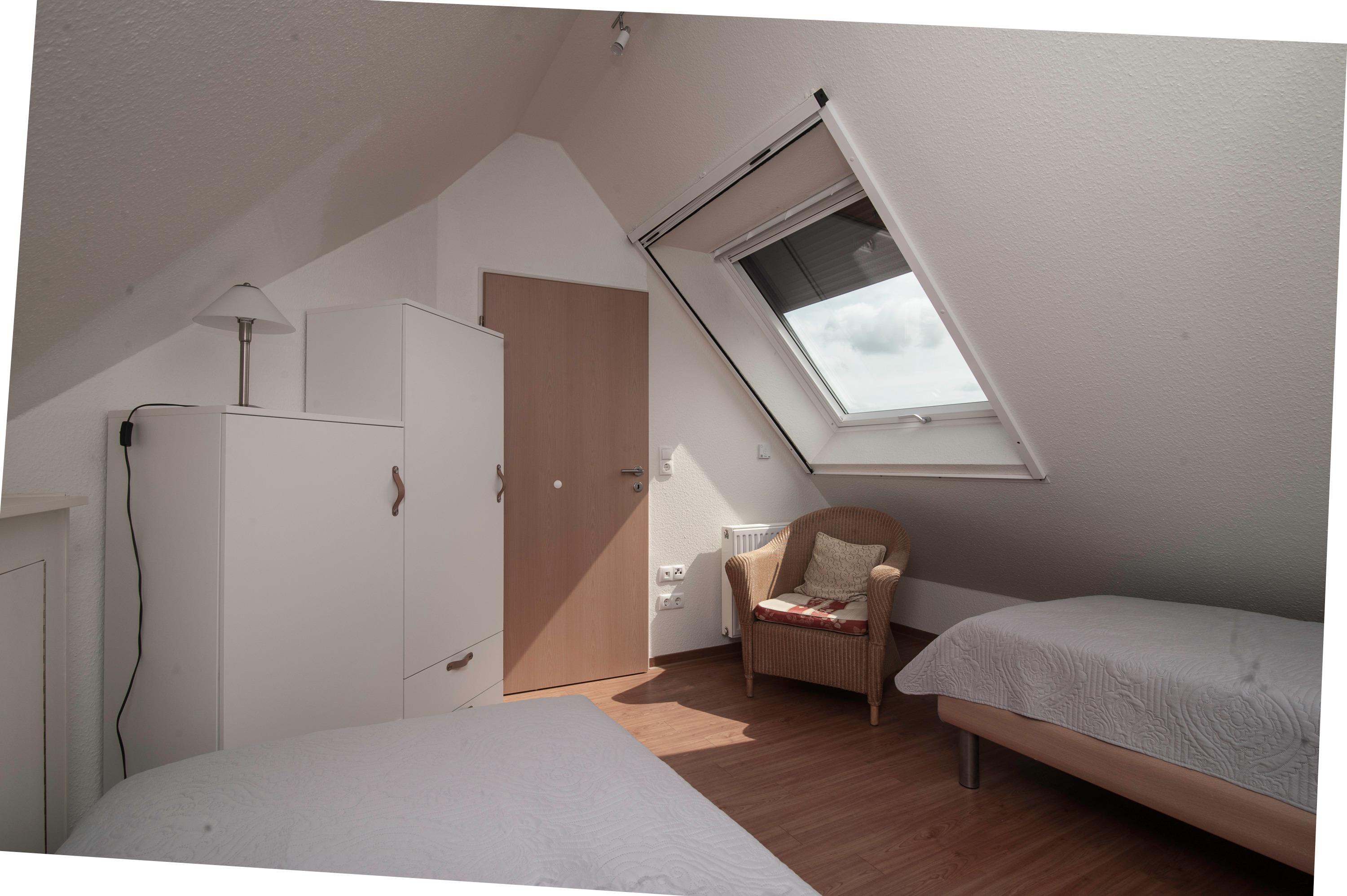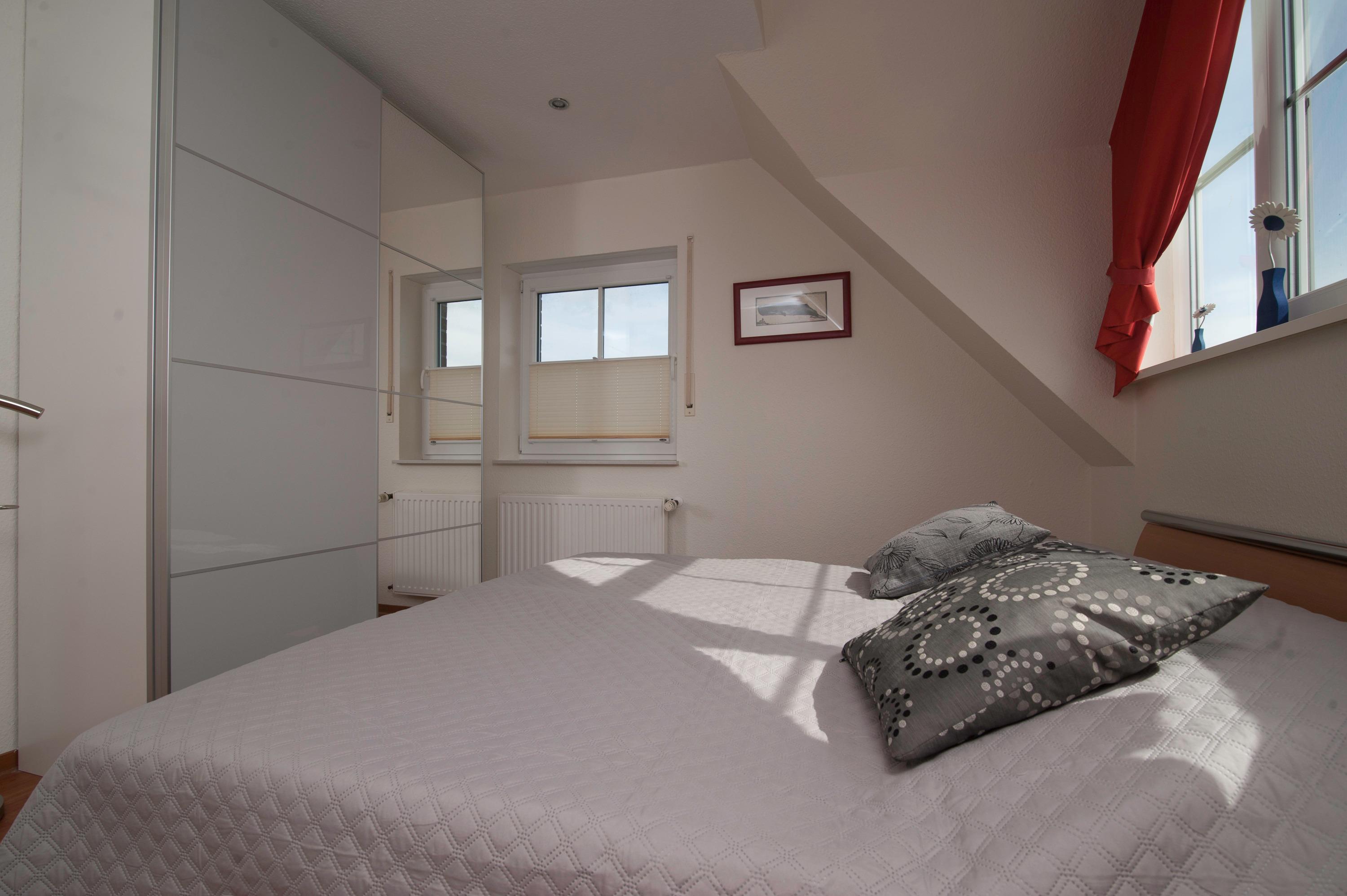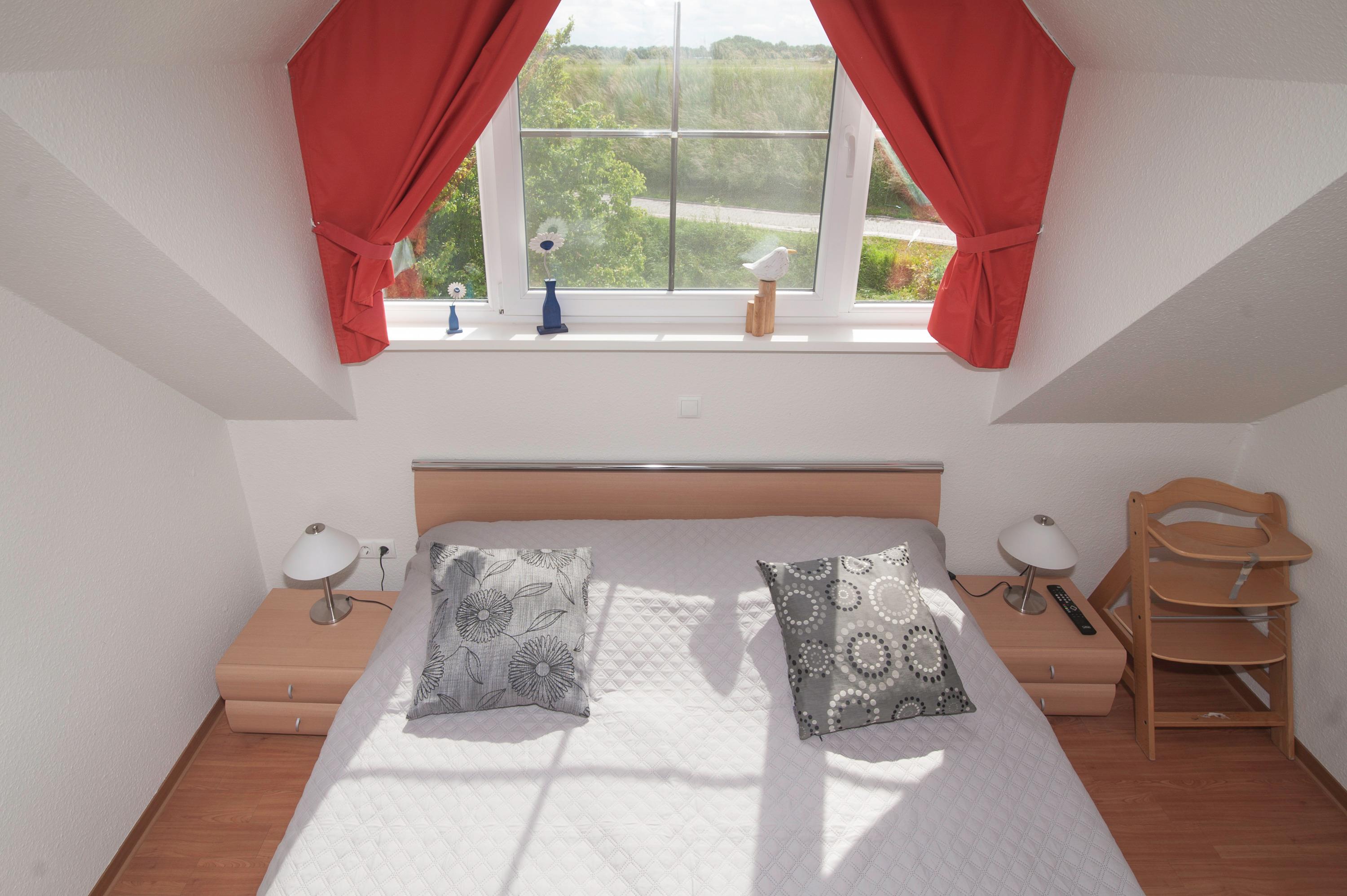 2 Schlafräume: 1 Schlafraum mit Doppelbett (Matratzen je 90 x 200 cm) und 32"Metz LCD-TV. Eine Galerie mit Sitzecke ist ein Rückzugsort zum entspannen, von hier haben Sie einen tollen Blick durch das Runde Fenster über den Deich zum Fahrwasser, können gemütlich in einem spannenden Buch schmökern oder Musik aus dem Internet Radio genießen. Auf dieser Ebene befindet sich das 2. Schlafzimmer mit 2 Einzelbetten (je 90 x 200 cm), das Velux Dachfenster ist mit Außenjalousie und Innenrollo ausgerüstet.