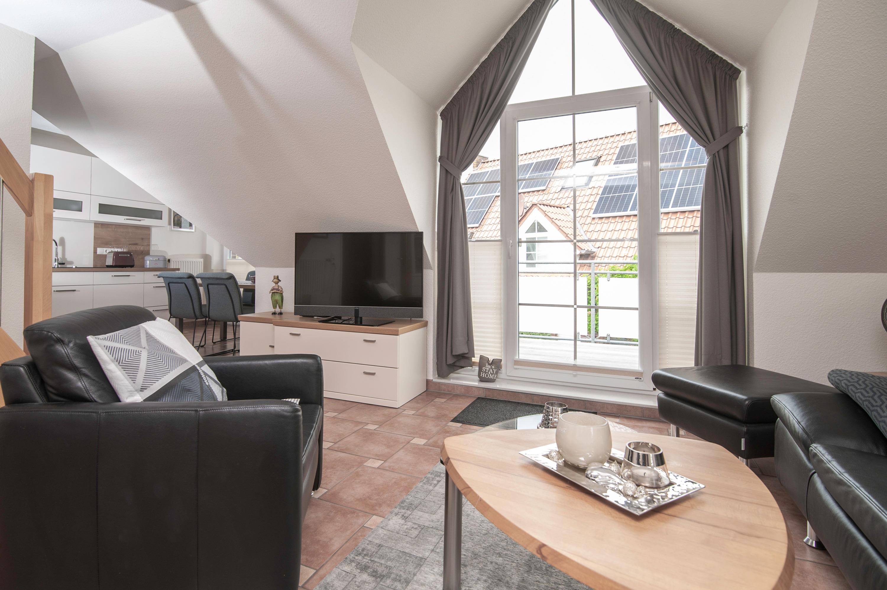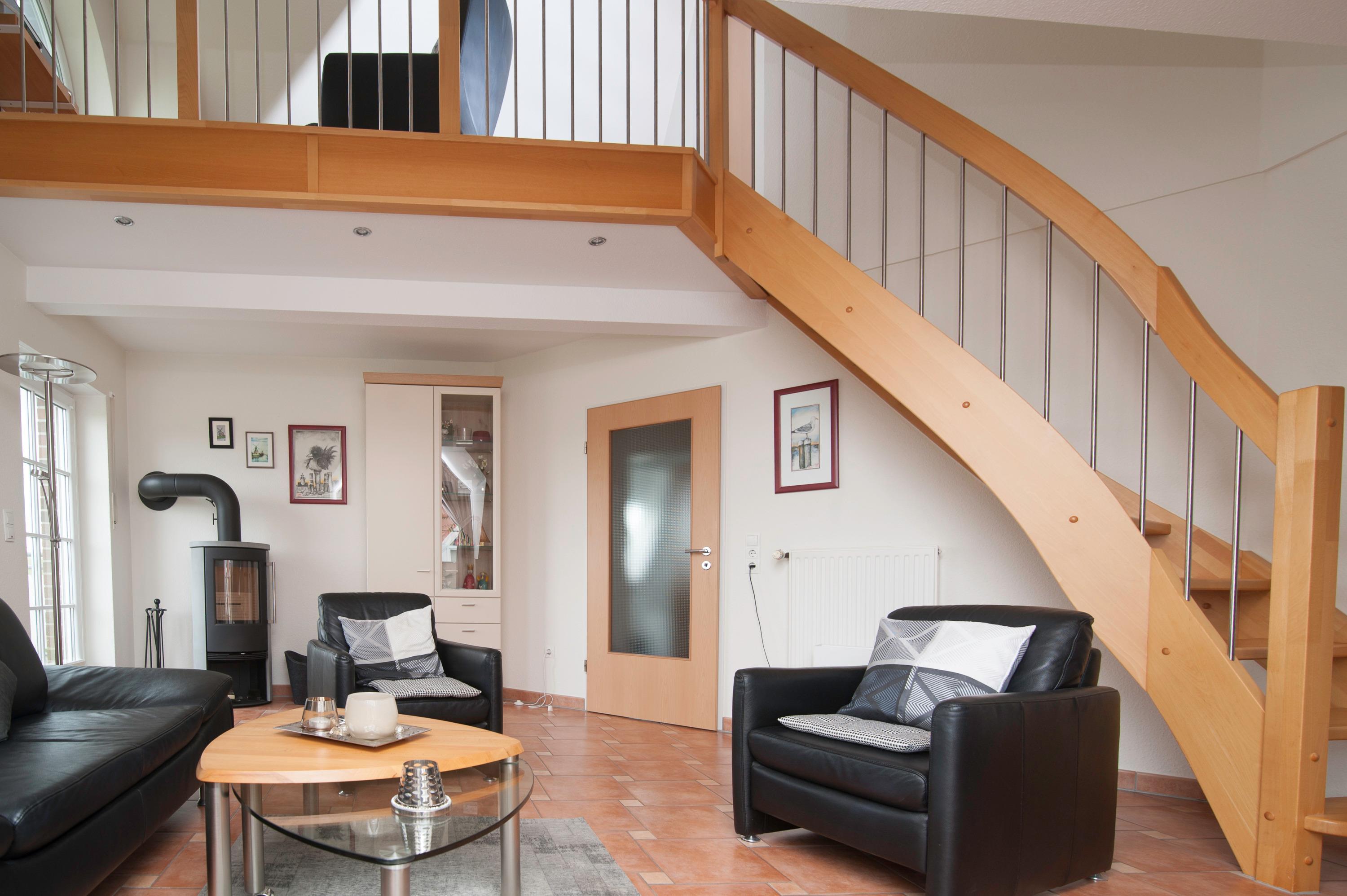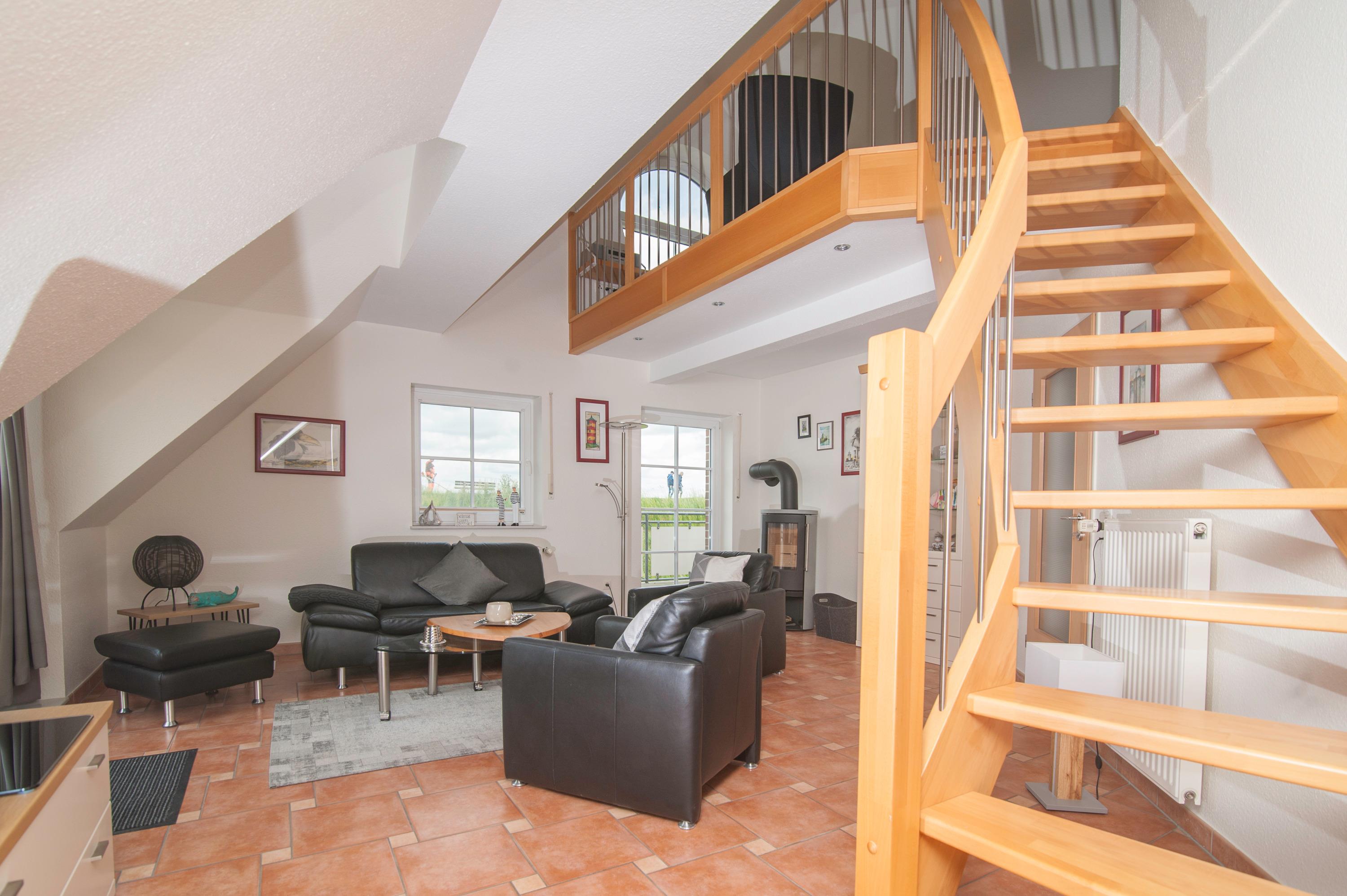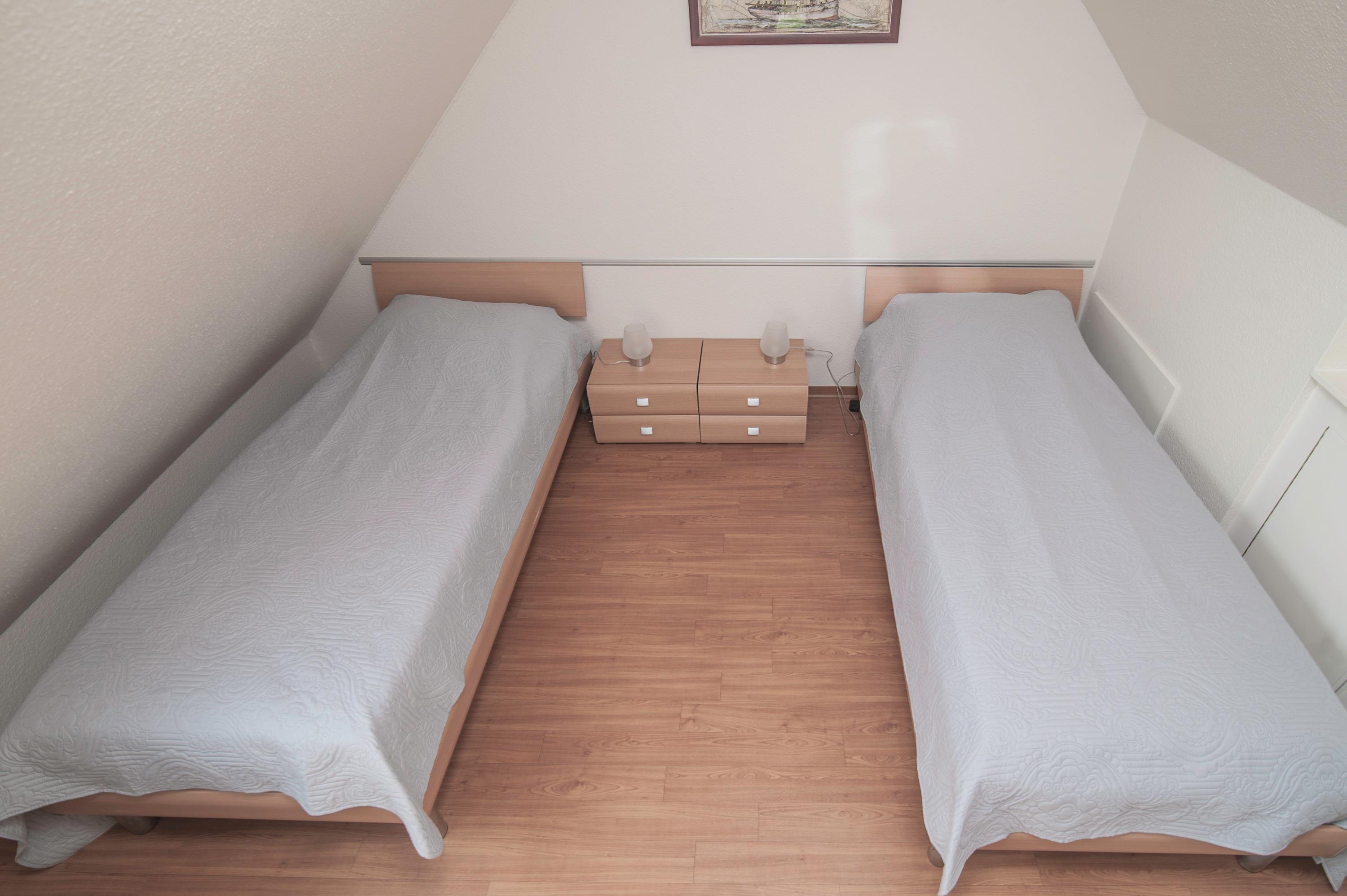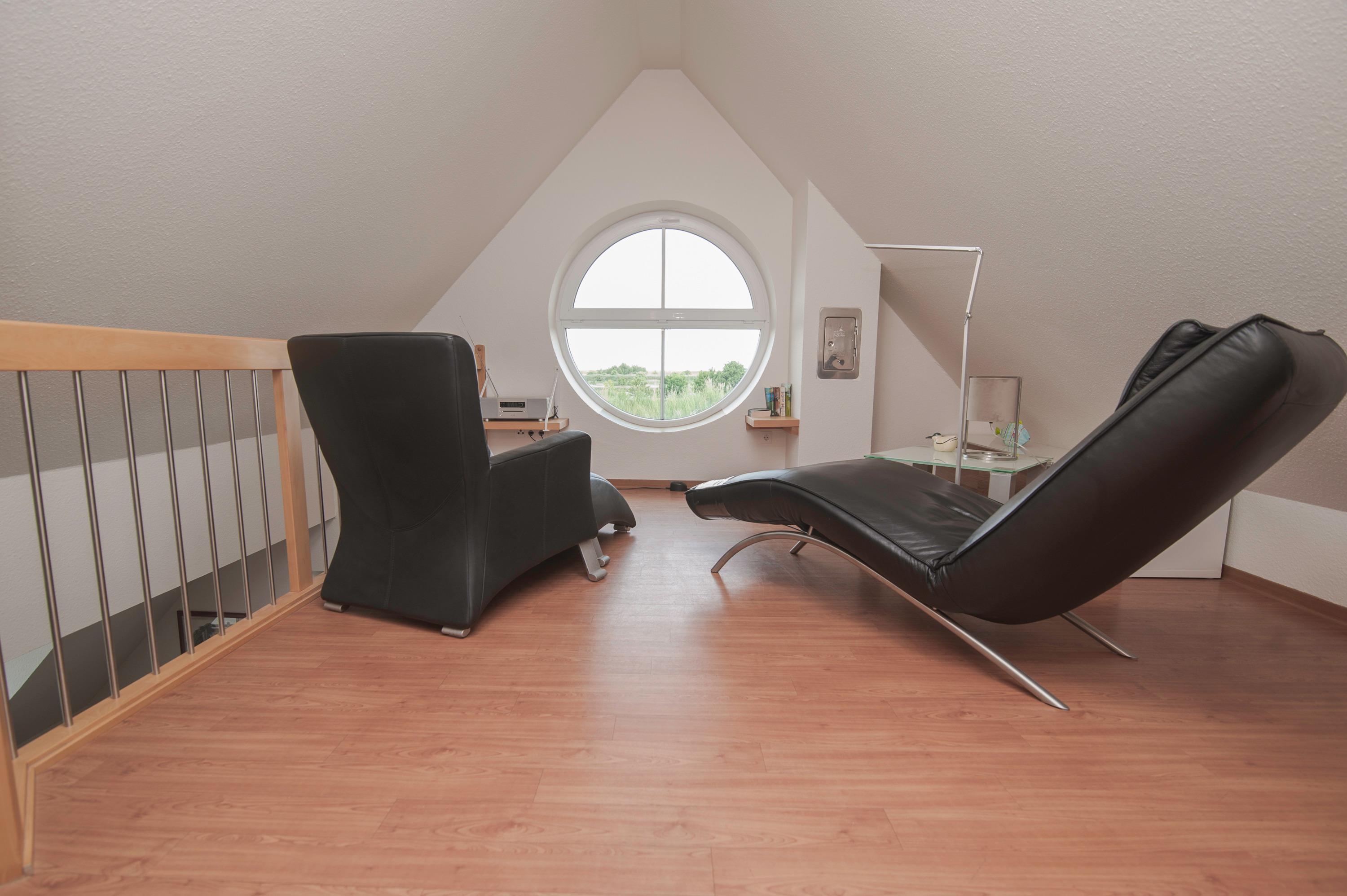 2 Schlafräume: 1 Schlafraum mit Doppelbett (Matratzen je 90 x 200 cm) und 32"Metz LCD-TV. Eine Galerie mit Sitzecke ist ein Rückzugsort zum entspannen, von hier haben Sie einen tollen Blick durch das Runde Fenster über den Deich zum Fahrwasser, können gemütlich in einem spannenden Buch schmökern oder Musik aus dem Internet Radio genießen. Auf dieser Ebene befindet sich das 2. Schlafzimmer mit 2 Einzelbetten (je 90 x 200 cm), das Velux Dachfenster ist mit Außenjalousie und Innenrollo ausgerüstet.