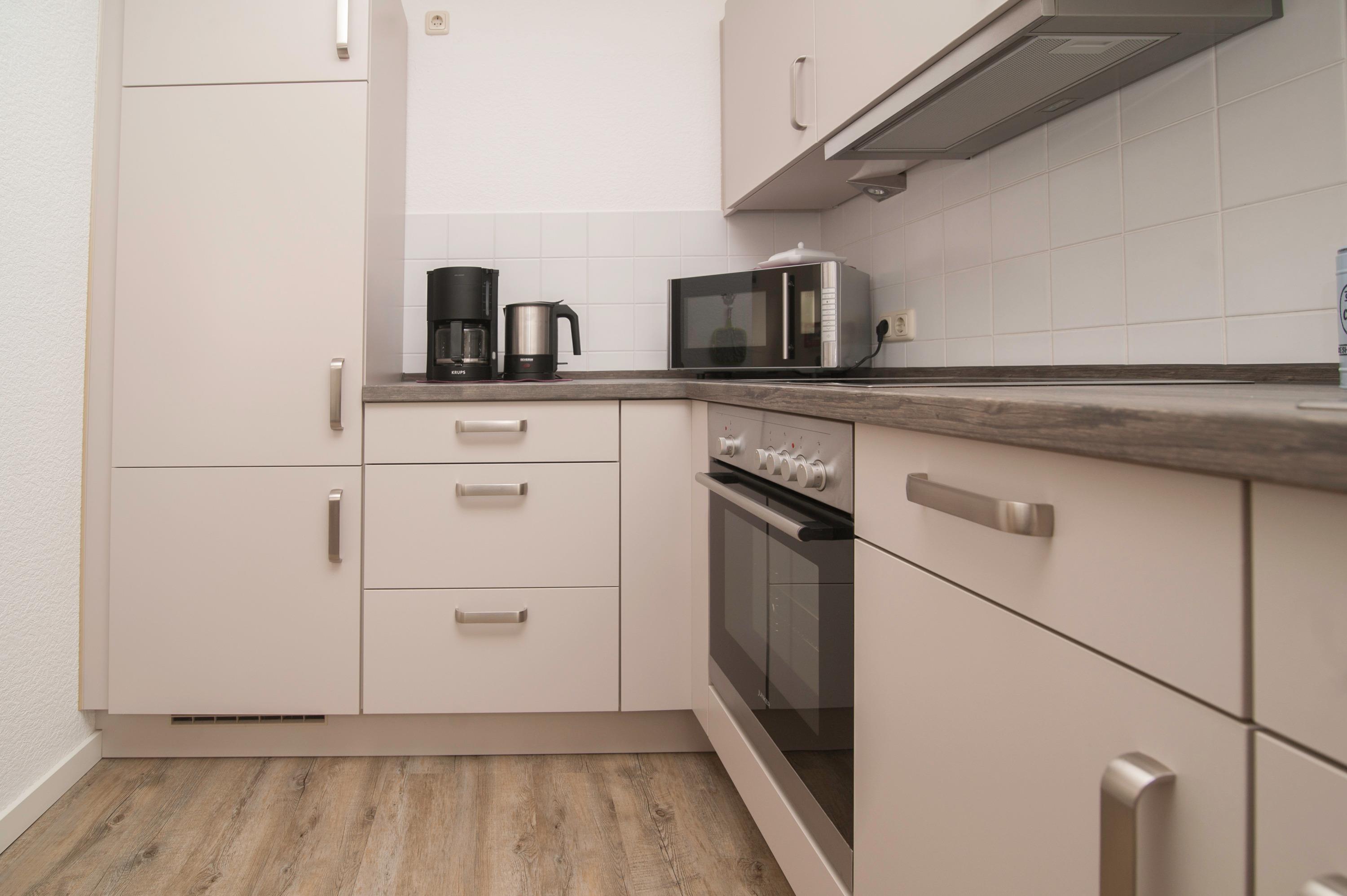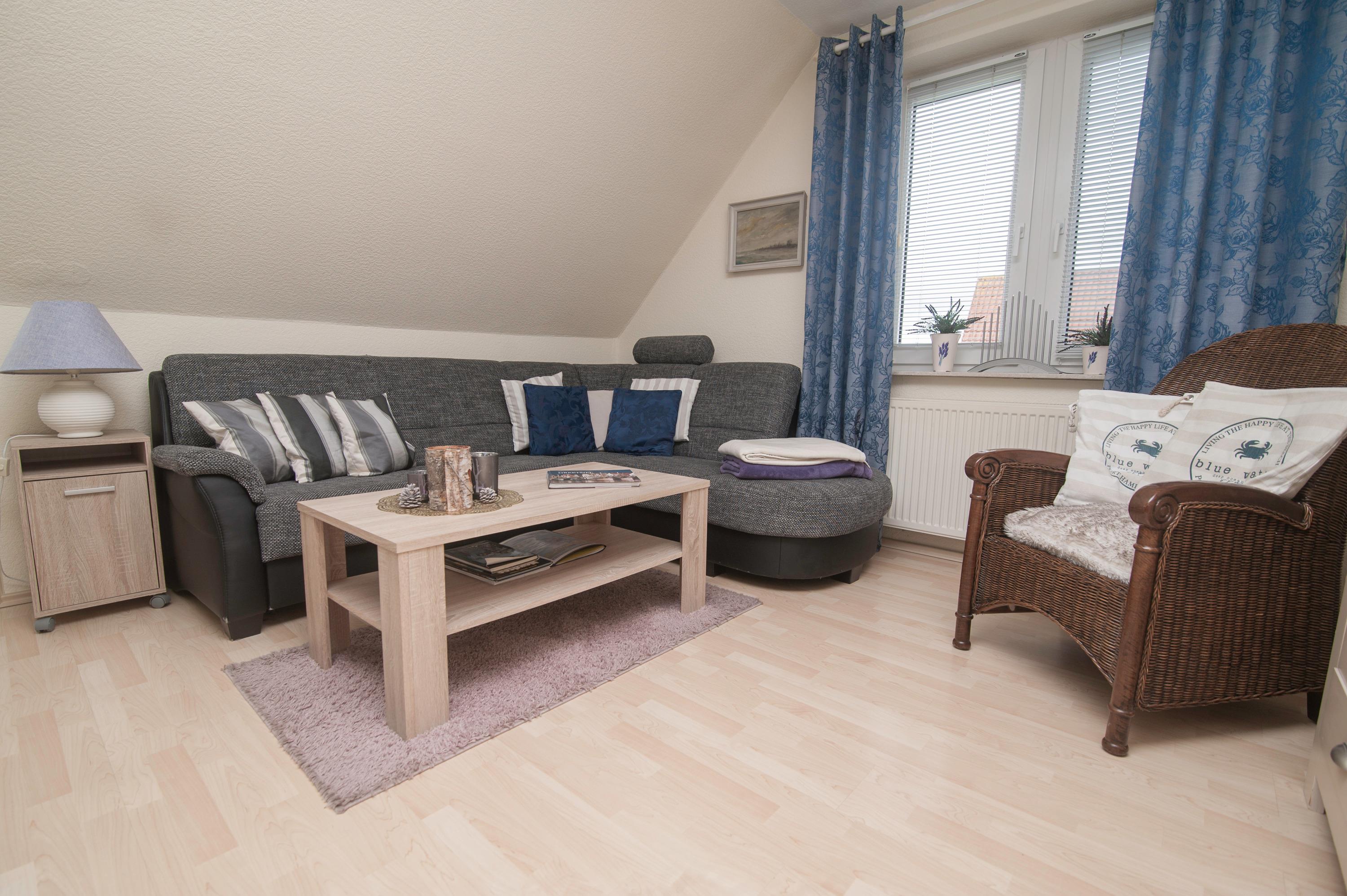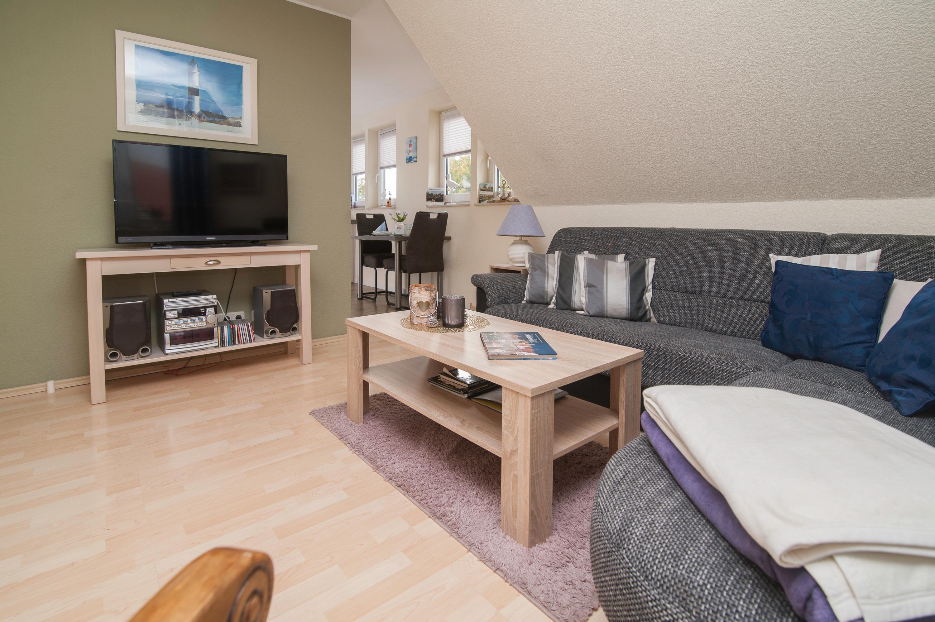 Im Wohnzimmer mit Ecksofa und 40" Grundig Full HD LCD-TV lassen sich gemütliche Fernsehabende verbringen. Eine Mini Stereoanlage mit CD-Spieler und ein DSL WLAN-Gastzugang stehen ebenfalls zur Verfügung. Ein einladender Essplatz für 2 Personen ist direkt neben der Einbauküche. Die Einbauküche ist komplett eingerichtet mit Herd und Cerankochfeld, Mikrowelle, Dunstabzugshaube, 45er Geschirrspüler, Filterkaffeemaschine, Eierkocher, Wasserkocher, Kühlschrank ohne Gefrierfach (bei Bedarf kann ein separater Gefrierschrank zur Verfügung gestellt werden). Das Schlafzimmer hat ein Doppelbett mit einer durchgehenden Matratze (1,60 x 2,00 m) und einem Kleiderschrank. Im Tageslichtbad mit Föhn, Dusche und WC[nbsp] befindet sich auch die Waschmaschine (5 kg). Ein kleiner Abstellraum beherbergt Bügelbrett, Bügeleisen sowie den Kondenstrockner. Insektenschutzgitter an den Fenstern sind vorhanden. Fahrräder können in der Garage untergestellt und geladen werden.
