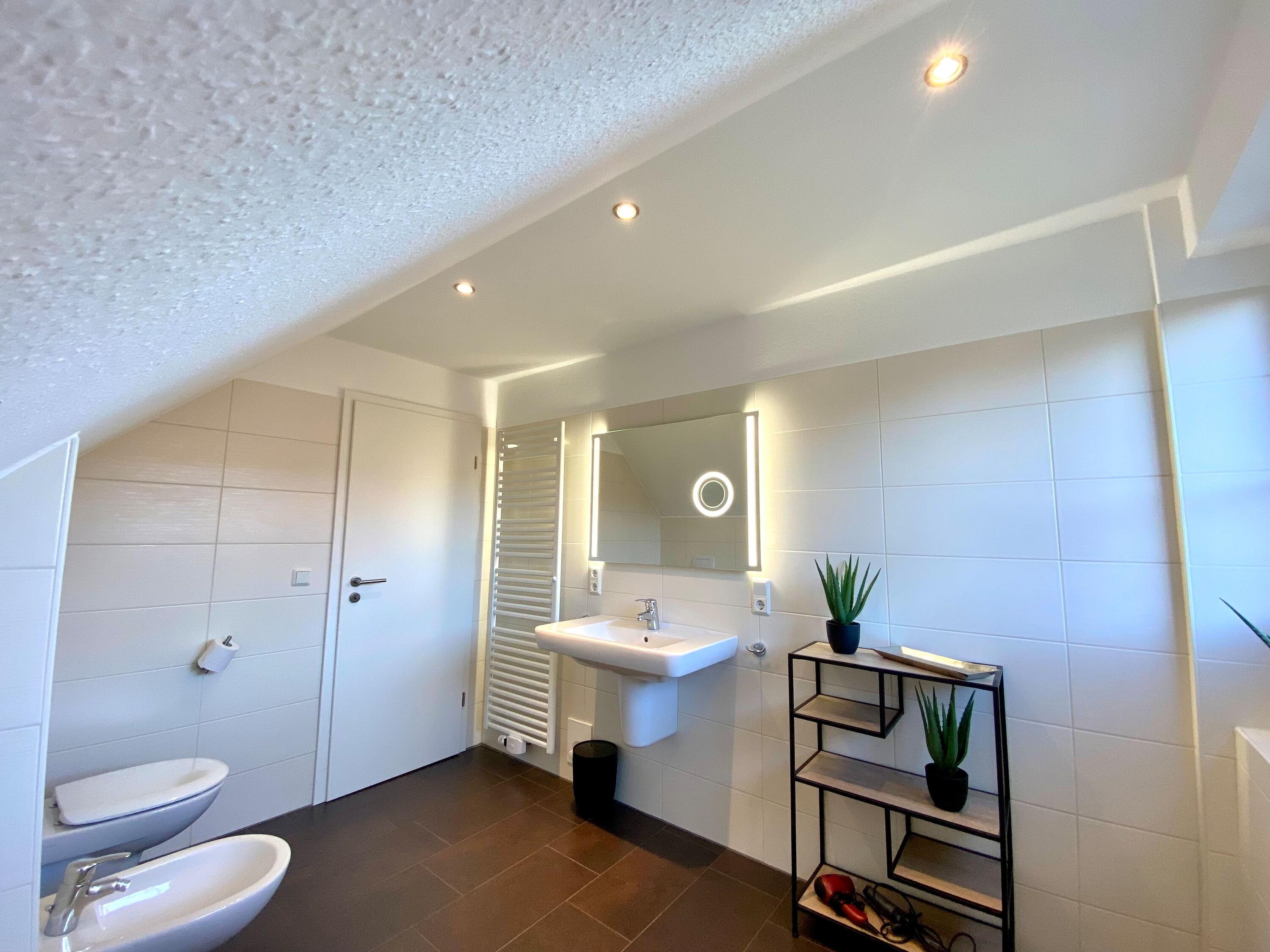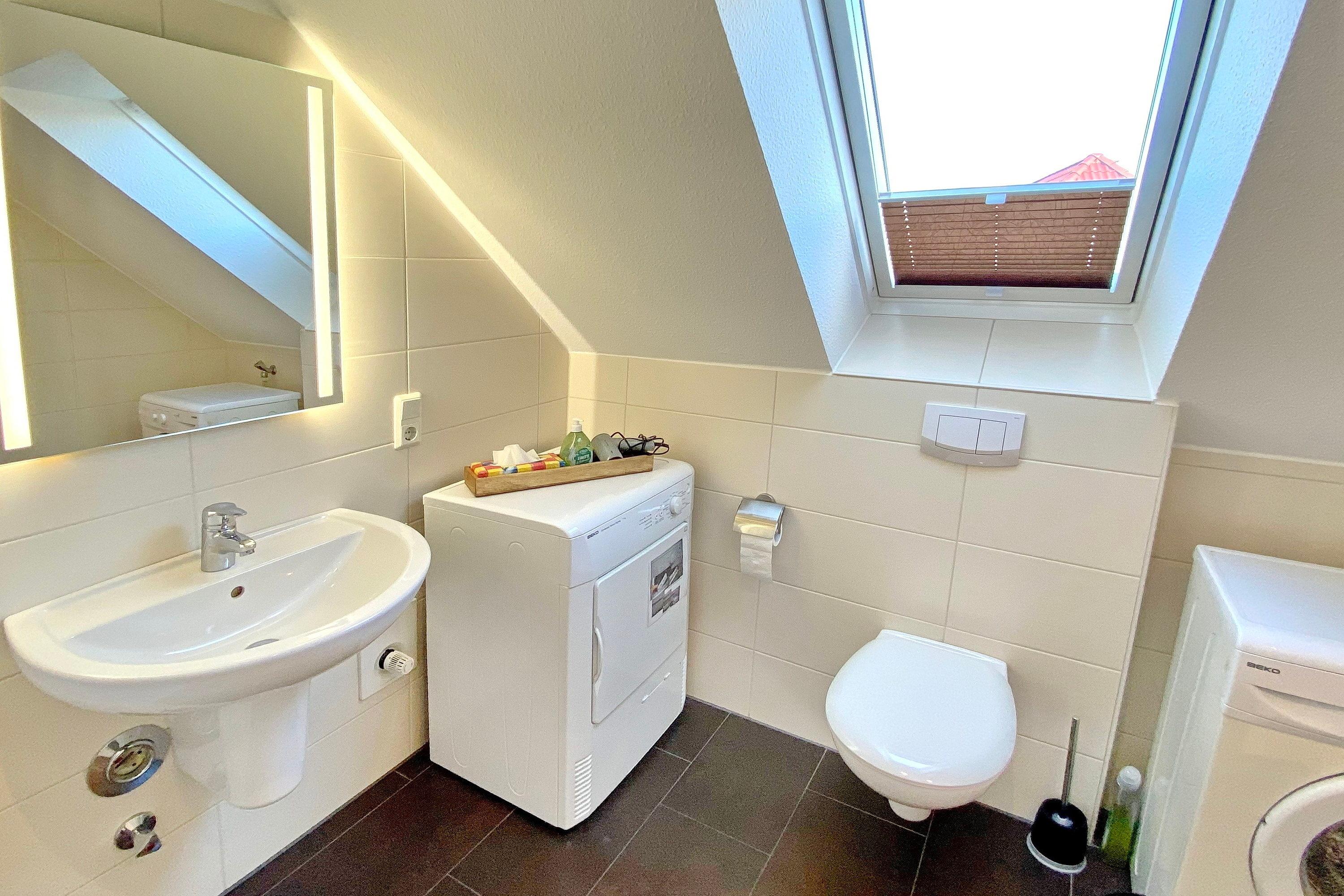 Die Wohnung verfügt über zwei Bäder mit Fußbodenheizung. Das erste Bad ist ausgestattet mit einer Eckbadewanne, einem Bidet, WC und Waschtisch. Das zweite Bad verfügt über eine Dusche, WC und Waschtisch. Eine Waschmaschine und ein Trockner sind ebenfalls vorhanden. Für Fahrräder steht ein separater Abstellraum zur Verfügung und ein PKW-Stellplatz befindet sich direkt am Haus. Bettwäsche und Handtücher werden auf Wunsch gegen Entgelt gestellt.