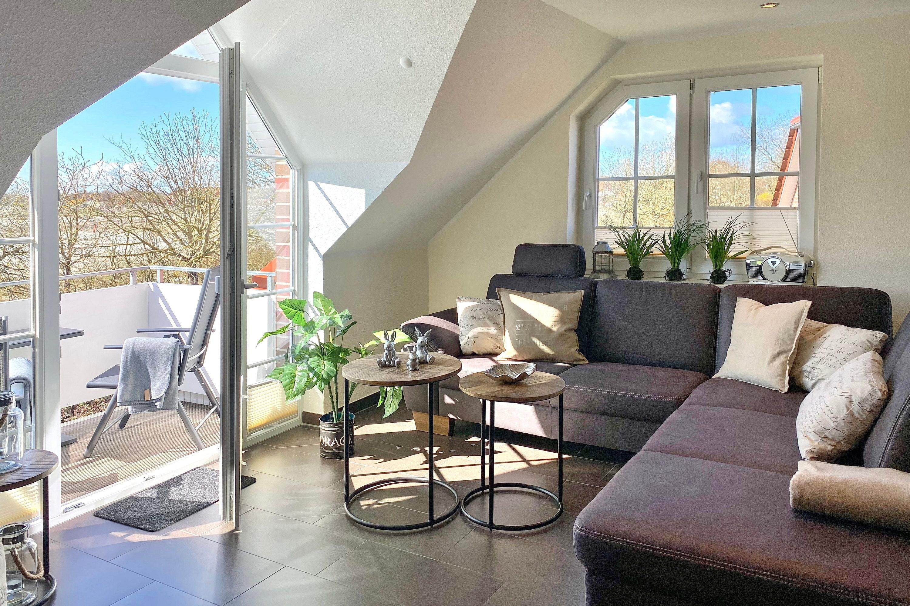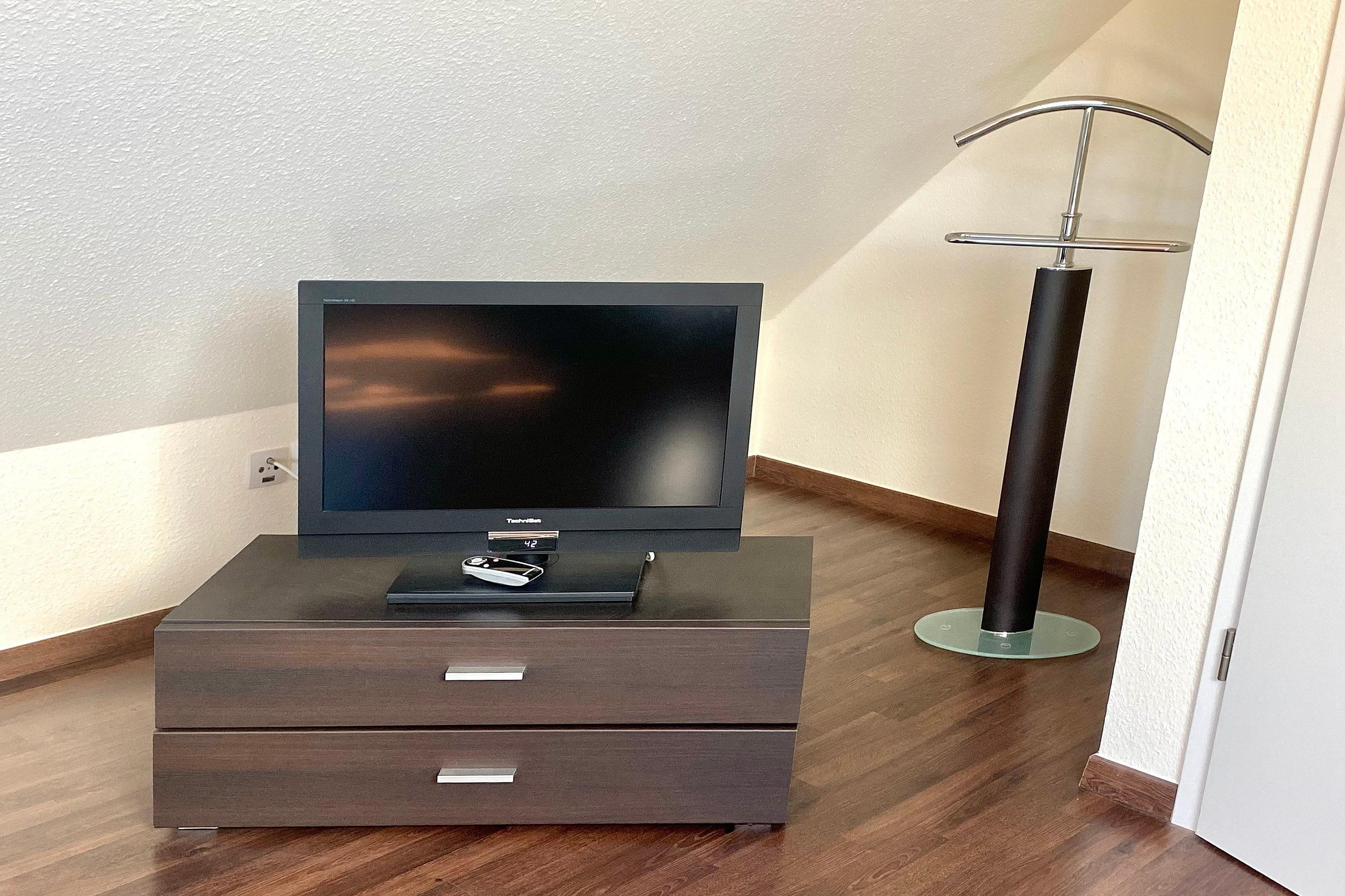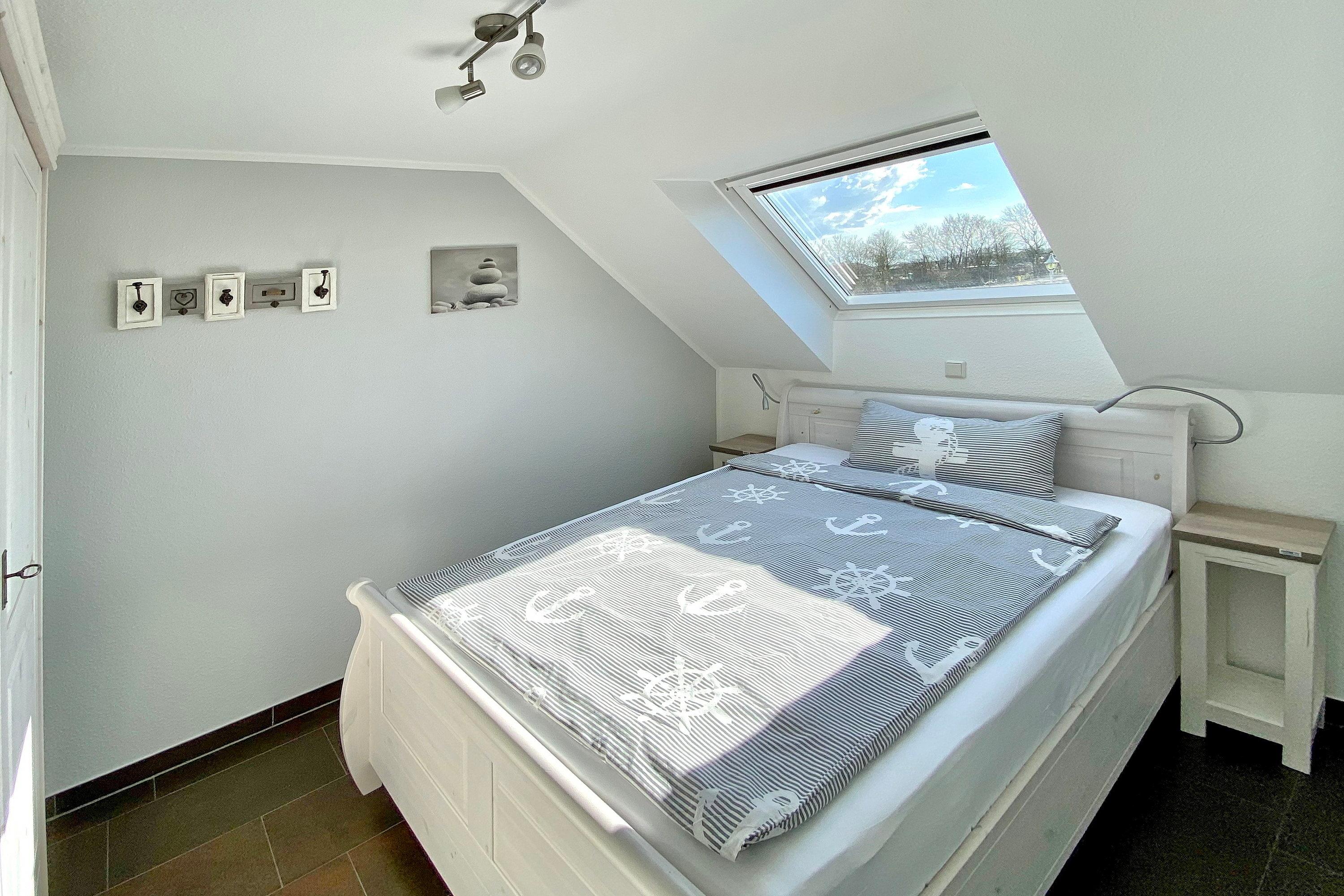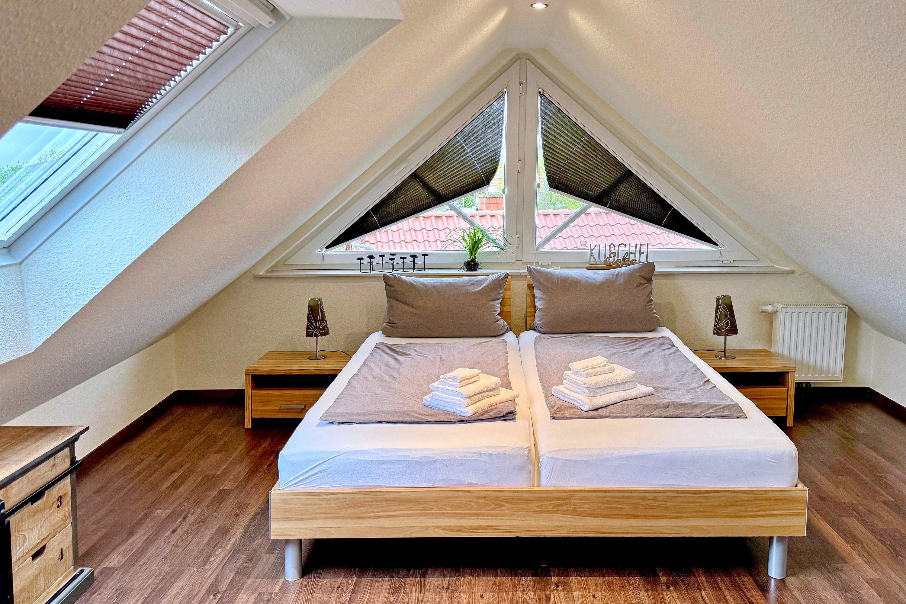 Es gibt ein Schlafzimmer mit einem Doppelbett (Matratzengröße 140 x 200 cm) Kleiderschrank und ein weiteres Schlafzimmer im großzügigen Studio unterm Dach mit einem Doppelbett (Matratzen je 90 x 200 cm ), einer Kommode und einem zweiten TV-Gerät. In beiden Schlafzimmern sind Verdunklungsplissees vorhanden.