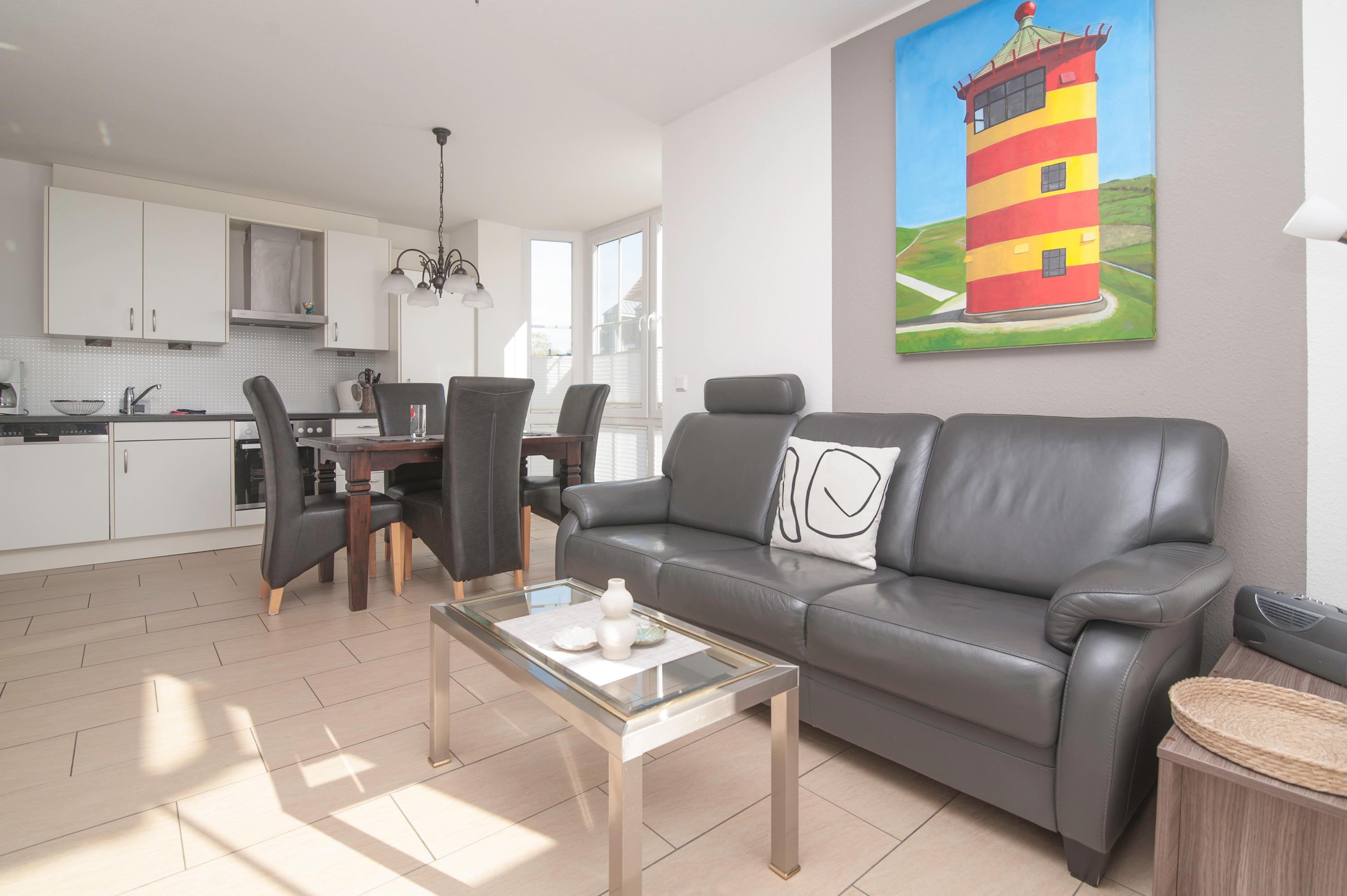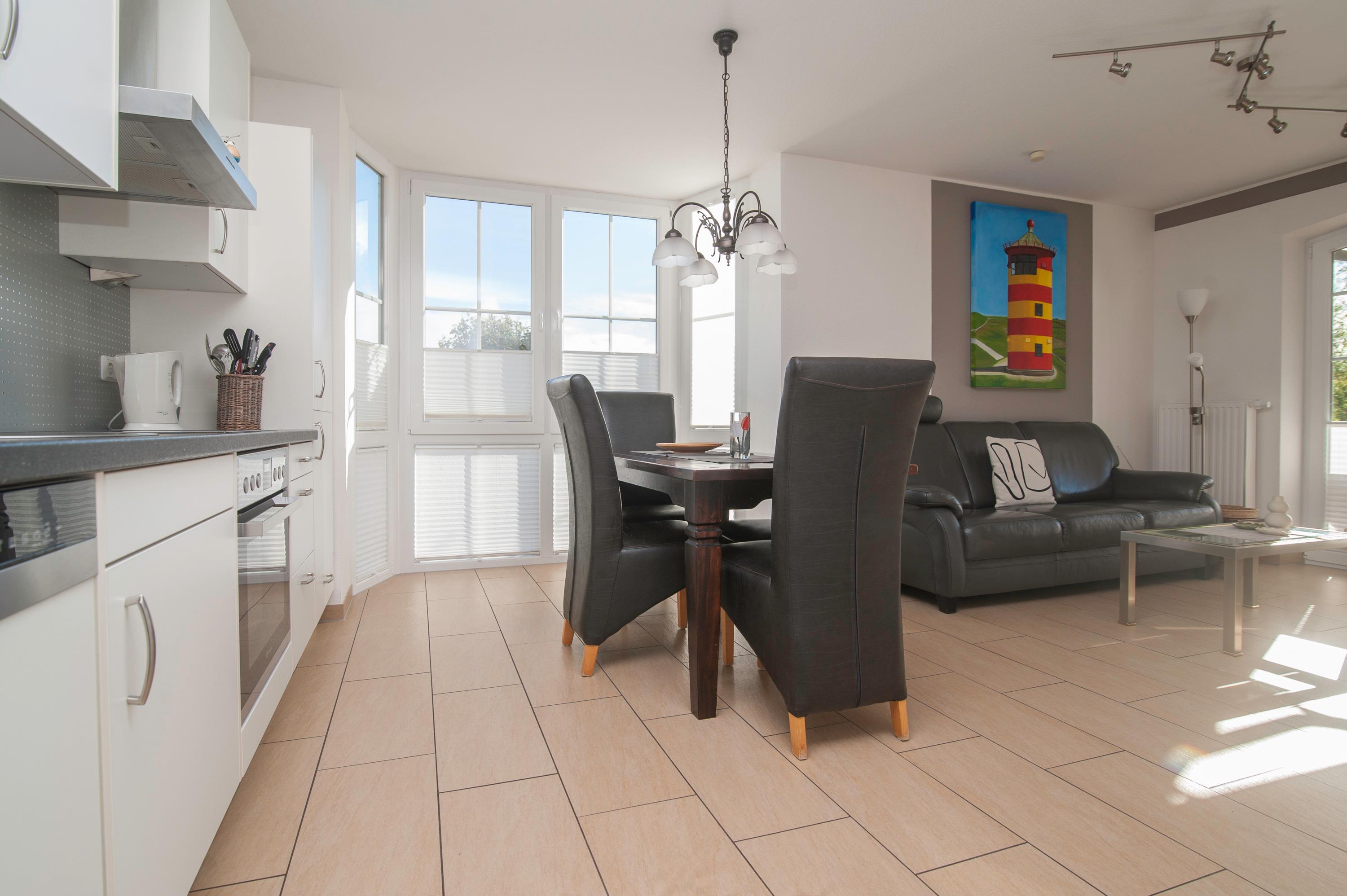 Im Wohnraum sind Küche, Essplatz und Sitzbereich integriert. Der Sitzbereich hat ein gemütliches Ledersofa, dort finden Sie den 50'' Kendo LED-TV (Mediathek), DSL und WALN. Im nebenliegenden lichtdurchfluteten Erker befindet sich der Essplatz.