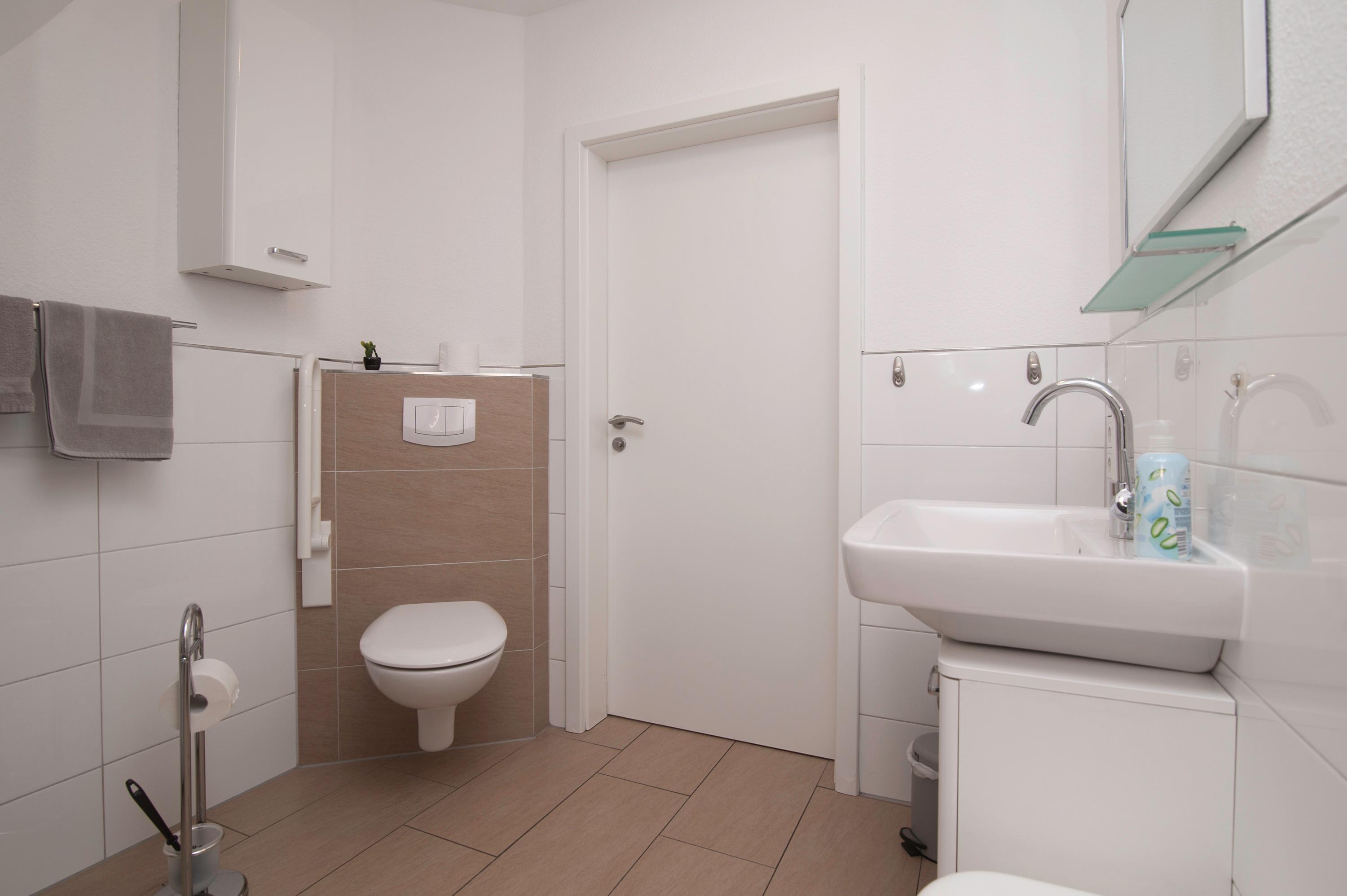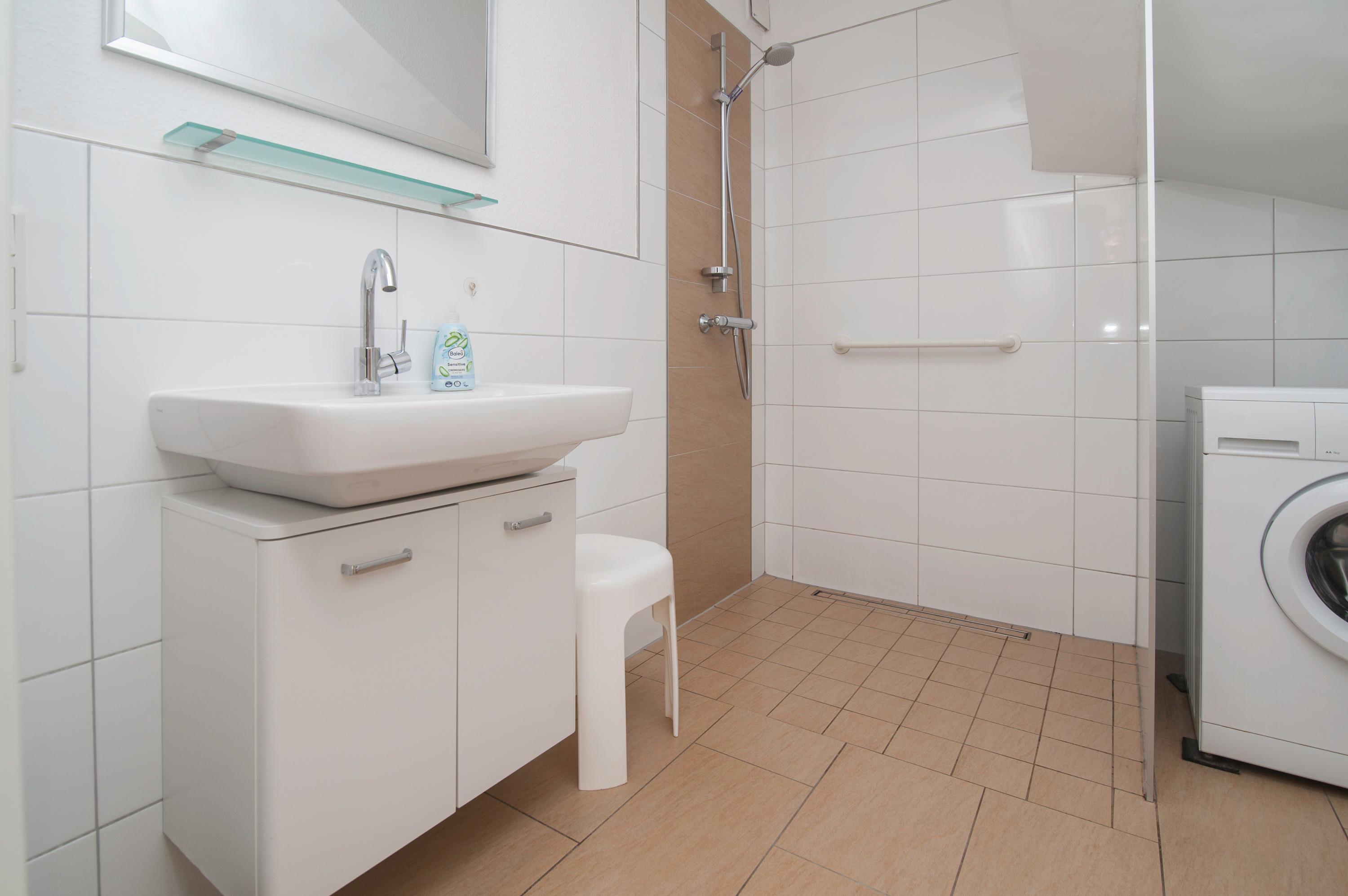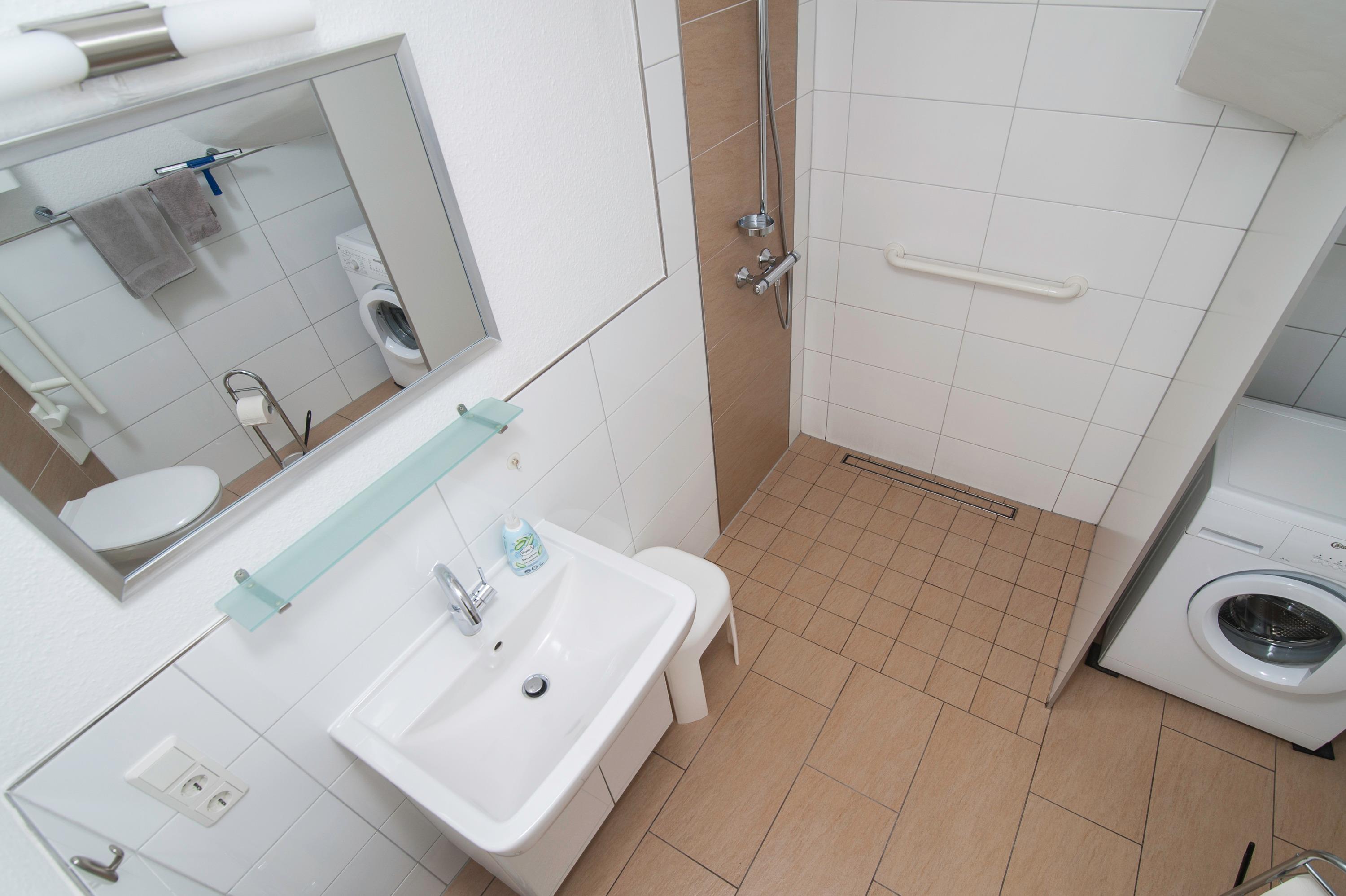 Im barrierefreien Badezimmer befinden sich Dusche, WC und Waschtisch, Föhn, Waschmaschine (5kg) und Wäscheständer.