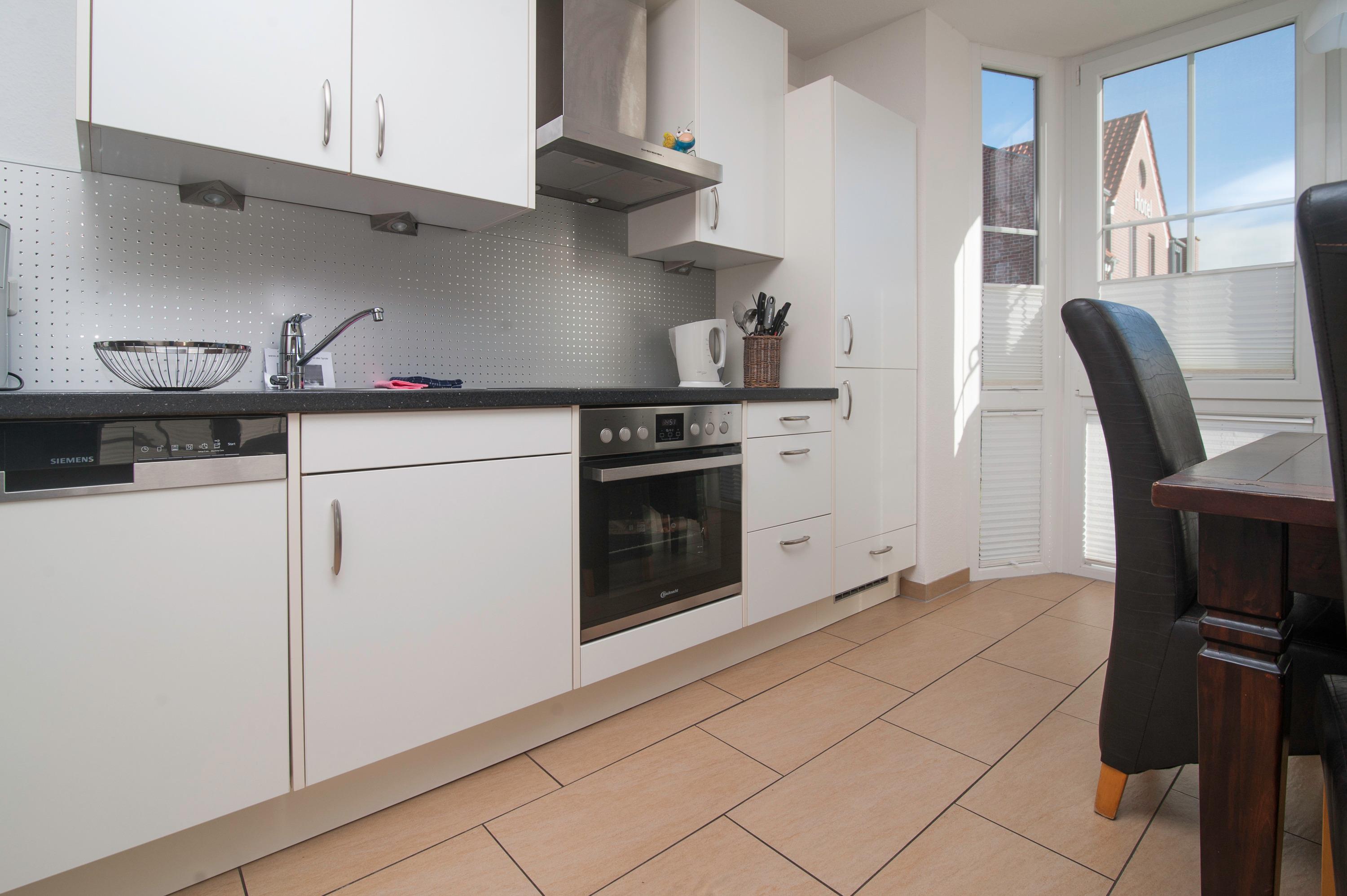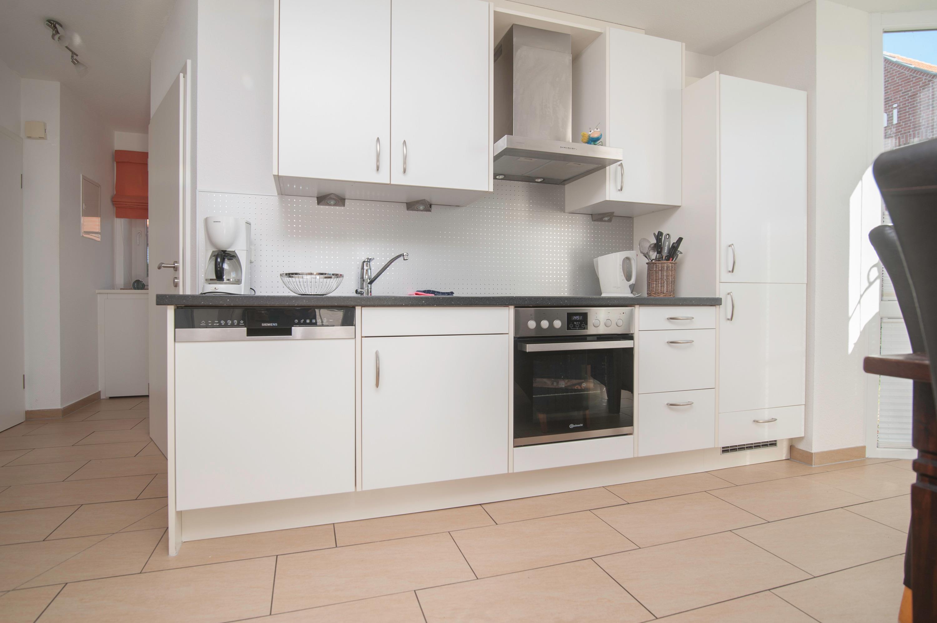 Die integrierte Einbauküche ist komplett mit Herd, Cerankochfeld, Kühlschrank/Gefrierfach, Geschirrspüler, Filterkaffeemaschine und mehr ausgestattet.