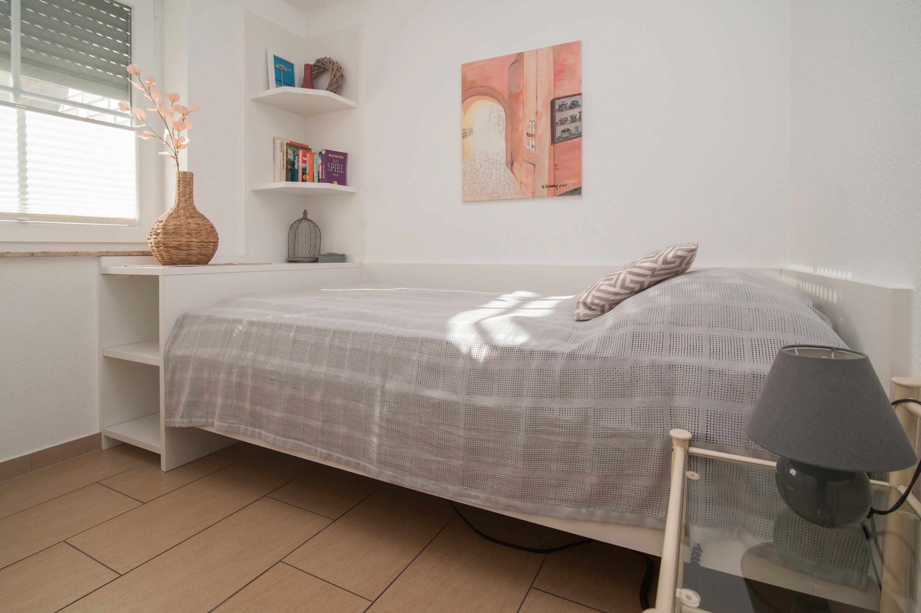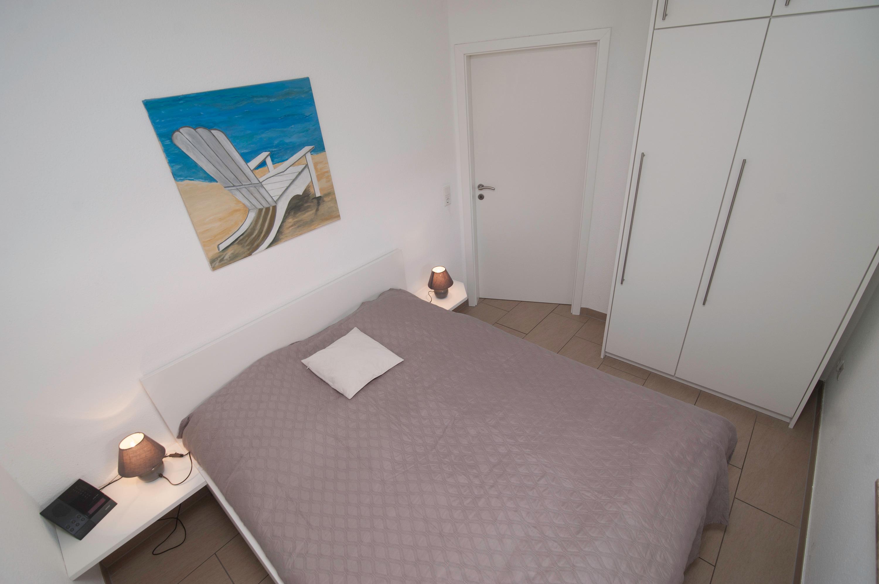 Die Ferienwohnung hat zwei Schlafzimmer, eines mit Doppelbett, 160 x 200 cm, das andere Schlafzimmer hat ein Einzelbett, 100 x 200 cm, mit elektrisch verstellbarem Lattenrost.