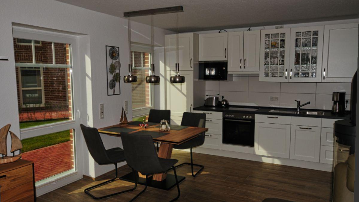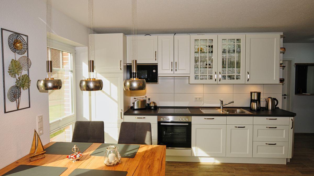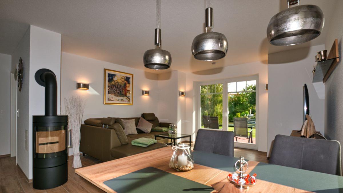 Der lichtdurchflutete und großzügige Wohn- und Essbereich lädt Sie zu Ihrem Traumurlaub ein. Auf dem großen Ecksofa mit Schlaffunktion können Sie gemütliche Abende mit Ihren Liebsten verbringen, auch ein Kaminofen für wohlige Wärme und selbstverständlich auch ein großer Flachbildfernseher sind vorhanden. Am großen Esstisch finden Sie ausreichend Platz für 4 Personen. Die offene Küche bietet alle Geräte und Möglichkeiten, die Sie benötigen: Angefangen mit dem Kühlschrank mit Gefrierfach, Backofen, Ceranfeldherd, über eine Kaffeemaschine, Mikrowelle, Wasserkocher, Toaster, Eierkocher, Soda stream bis hin zu einem Mixer.