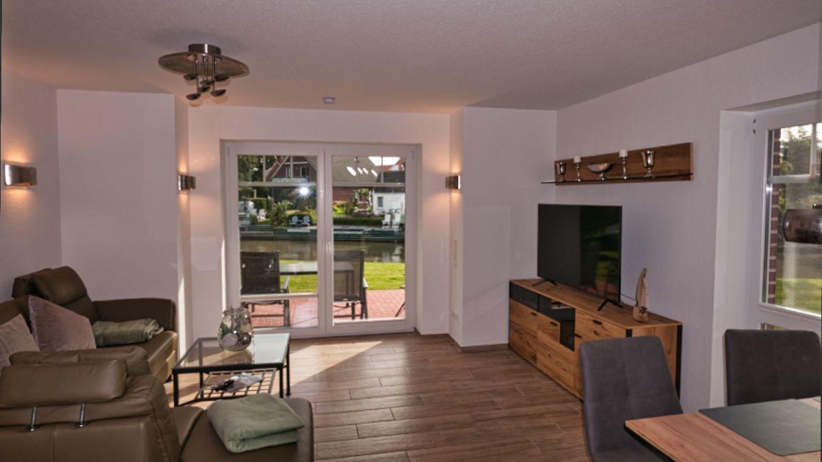 Moderne Erdgeschosswohnung am Greetsieler Sieltief mit eigenem Steg und Terrasse für entspannte Urlaubstage.